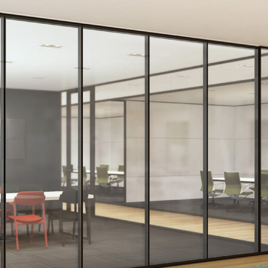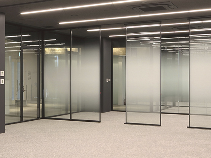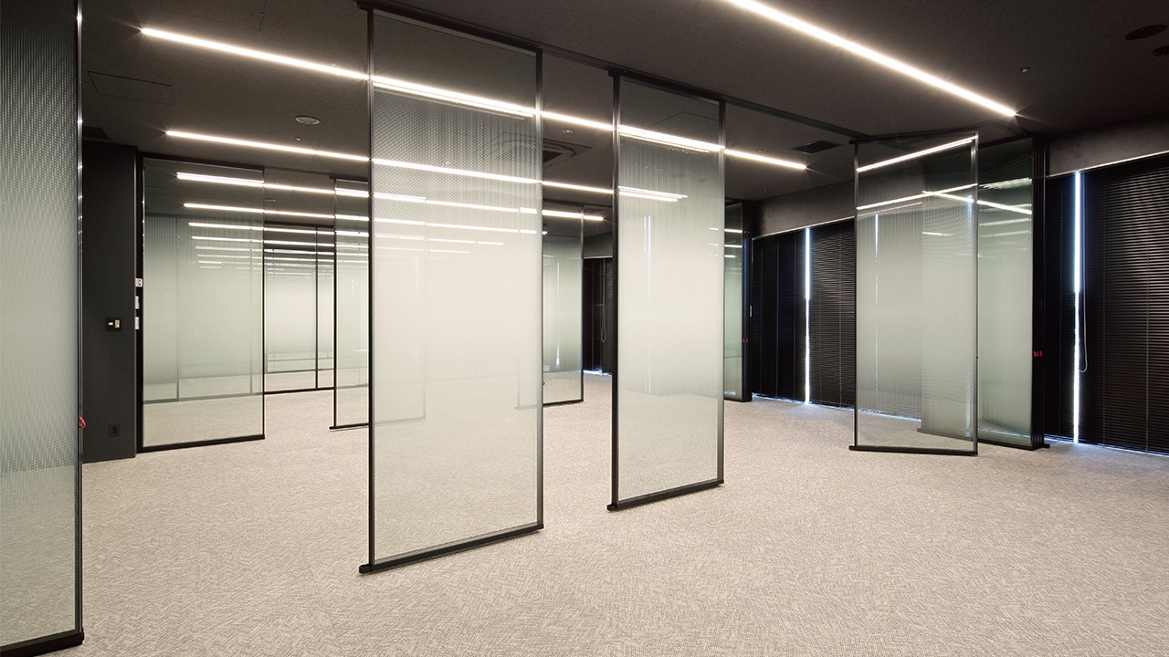 フレアは、パネル原70㎜のダブルガラスライディングウォールではNo.1の遮音性能。防音合わせガラスが、高い遮音性能を保ったまま透過性もを兼ね備えています。さらにパーティション[プリシード]と同じオプションカラー中間膜と組み合わせることが可能です。