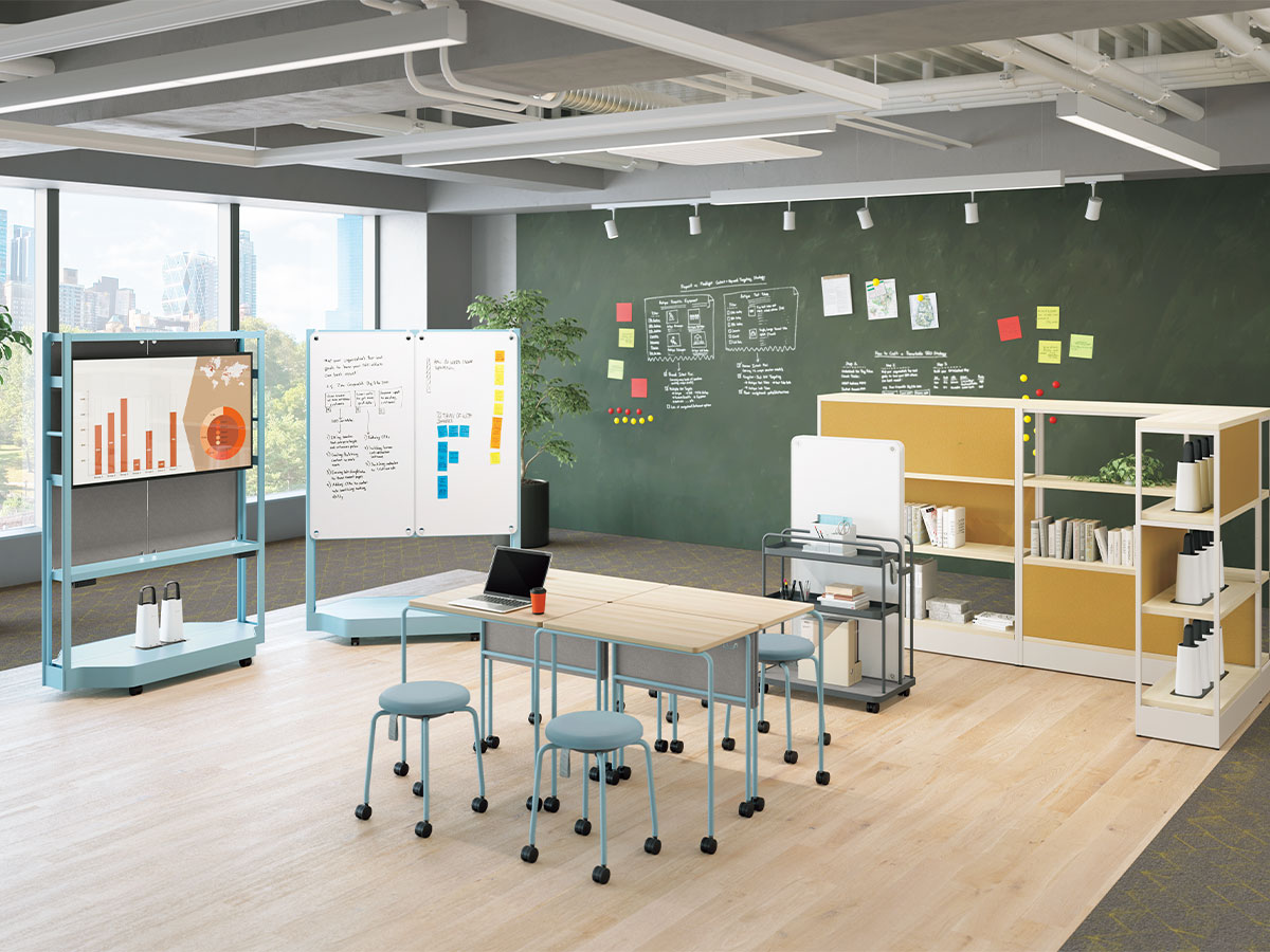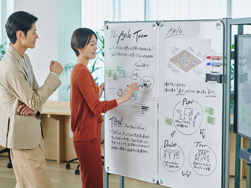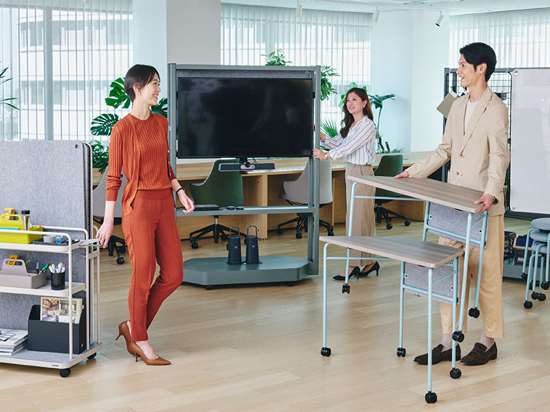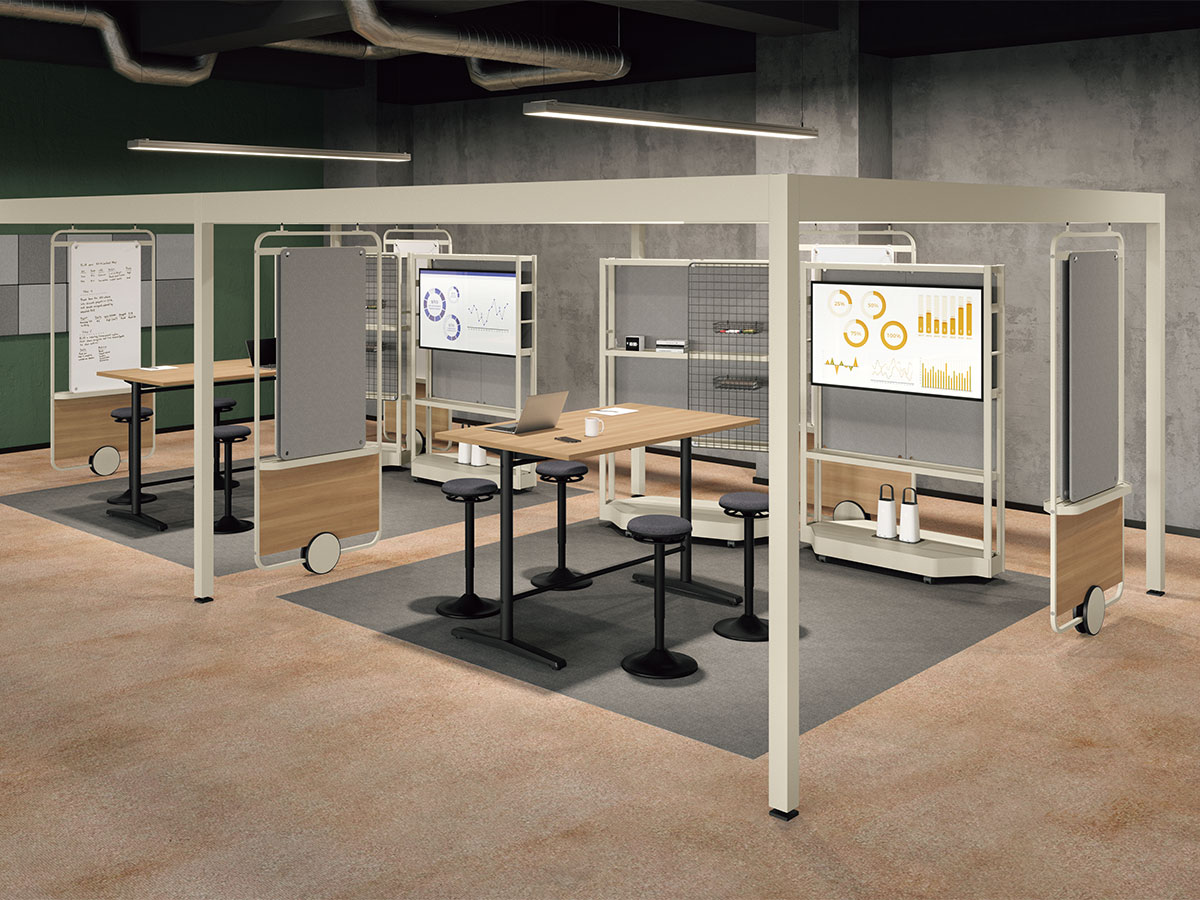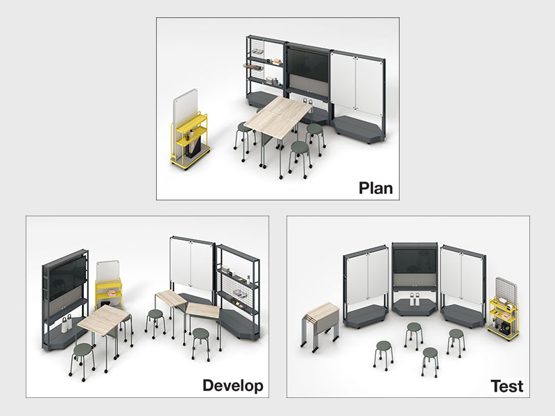 チームでの作業には色々な種類があります。それぞれの作業に合わせて最適な設えを俊敏に整えられることにより、チームのアウトプットはより早く質の高いものとなります。一人ひとりのアイデアを互いにぶつけ合うことで進化・強化させ(Plan)、実際にアイデアを具現化し(Develop)、みんなで試す(Test)ことで新たな気づきを得る。そのサイクルを途切れることなく瞬時に実現できる環境を作ることで、最高のアウトプットを最速で実現する最強のチームが誕生するのです。