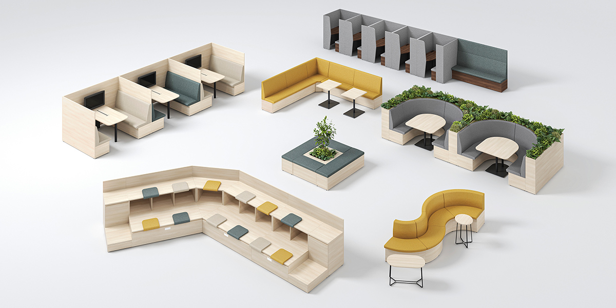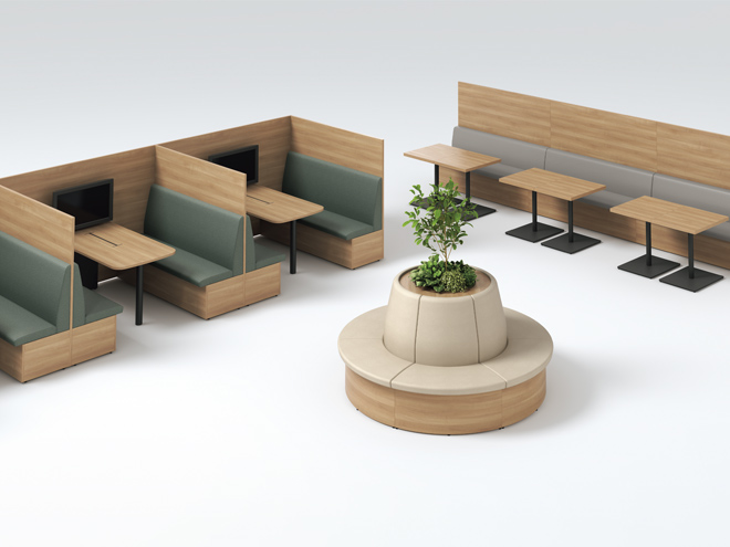 テーブルを囲むように配置することで、少人数でのミーティングが可能なレイアウト。必要に応じてソファベンチの背面にパネルやスペーサーを置くことで、周囲からの視線を遮ったり、距離をとることができます。
