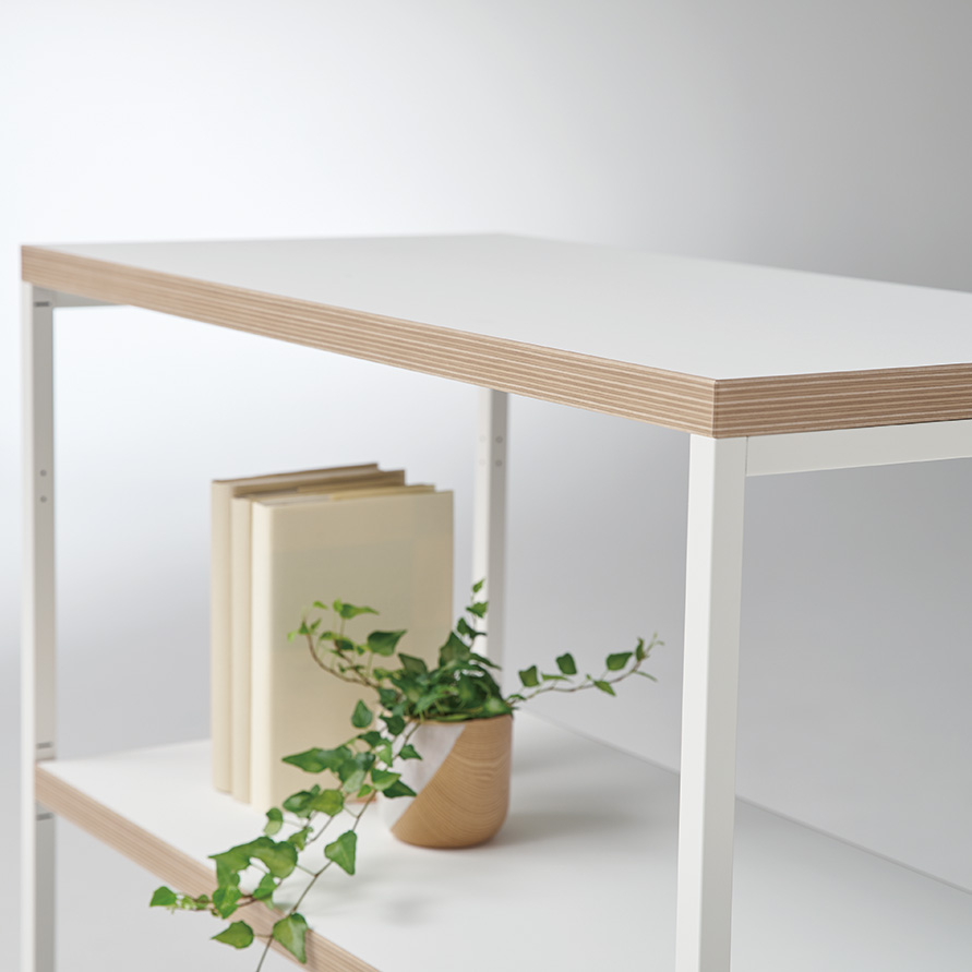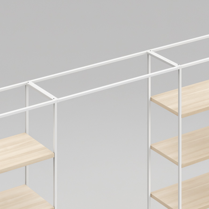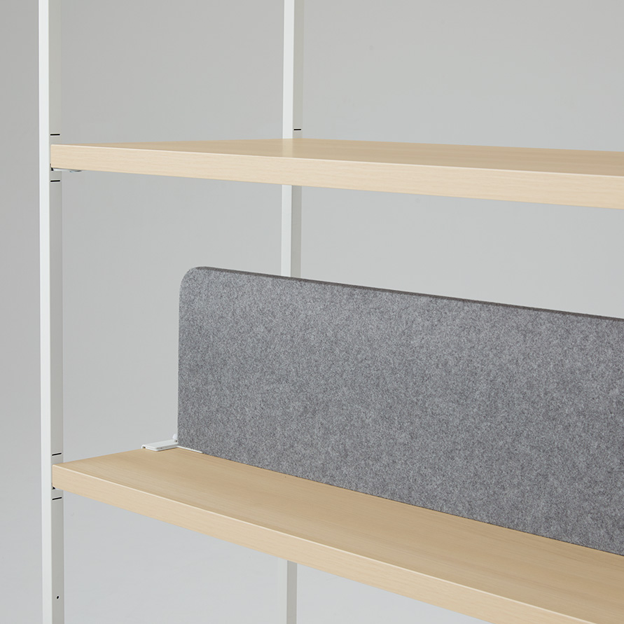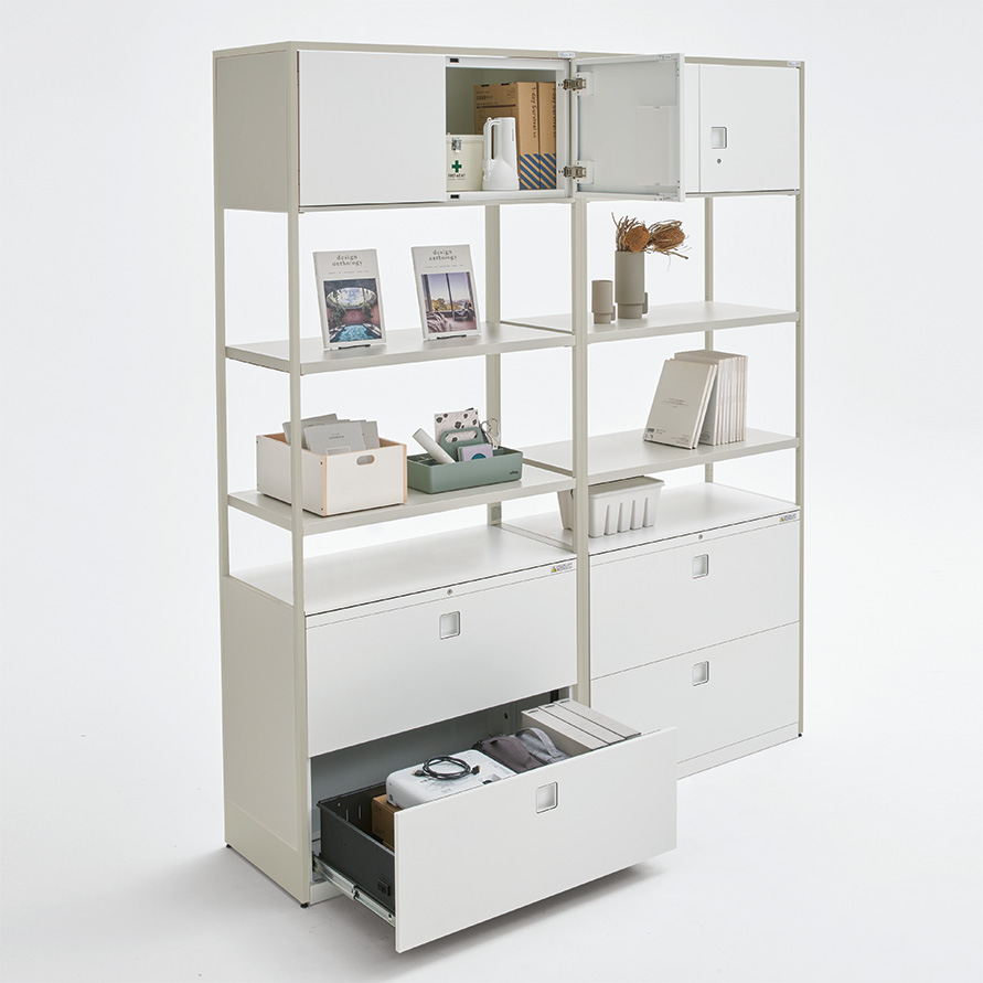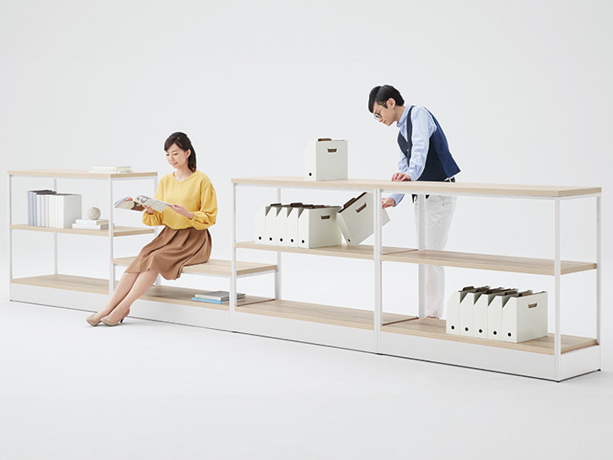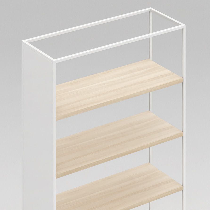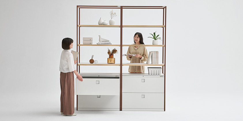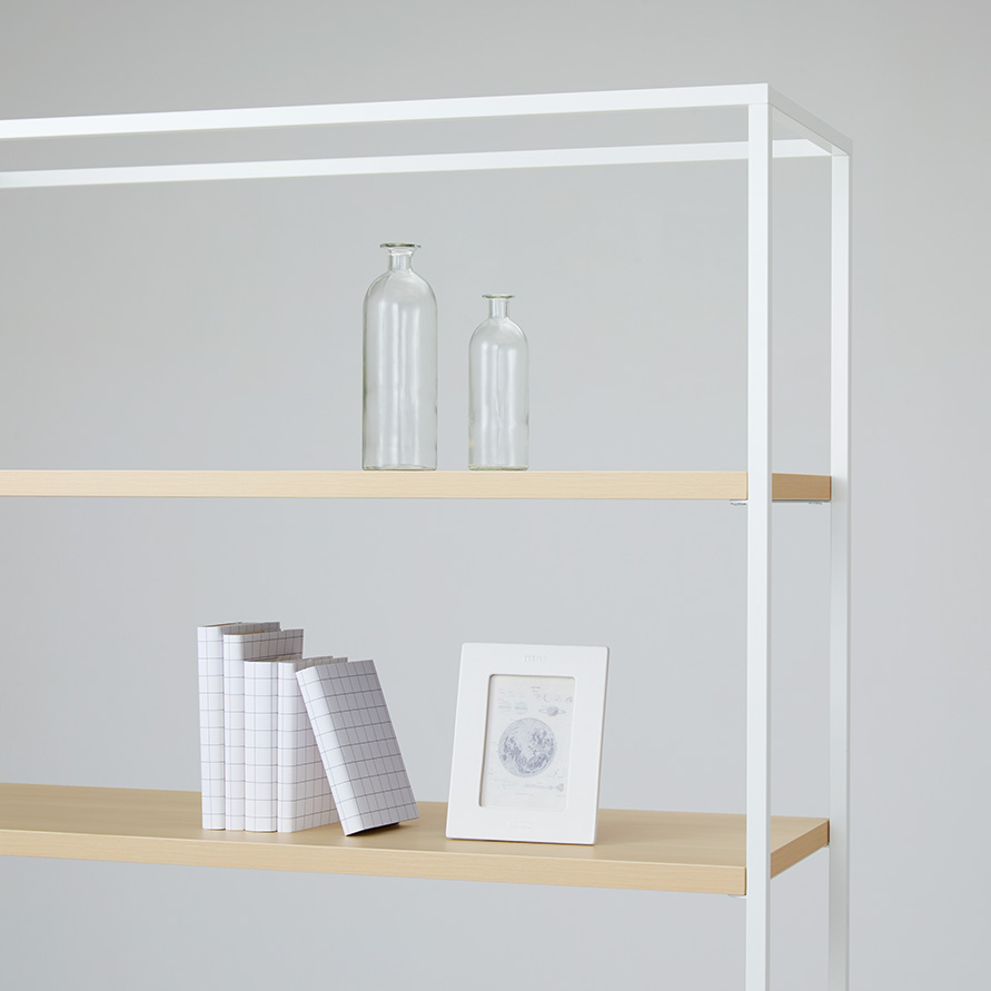システム収納組み込みタイプはレクトラインやピクスラインなどのシステム収納をそのまま組み込むことが可能です。上部はオープンなまま収納量を増やせるため、圧迫感を与えずひろがりのある空間を実現します。ライブスシェルフの抜け感とシステム収納の収納力を両立することができます。