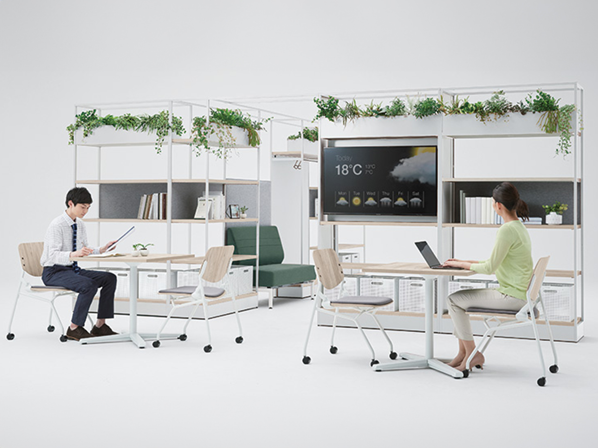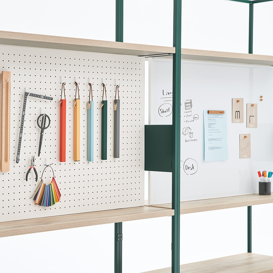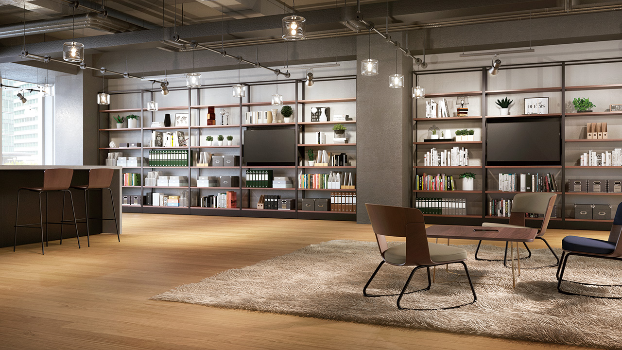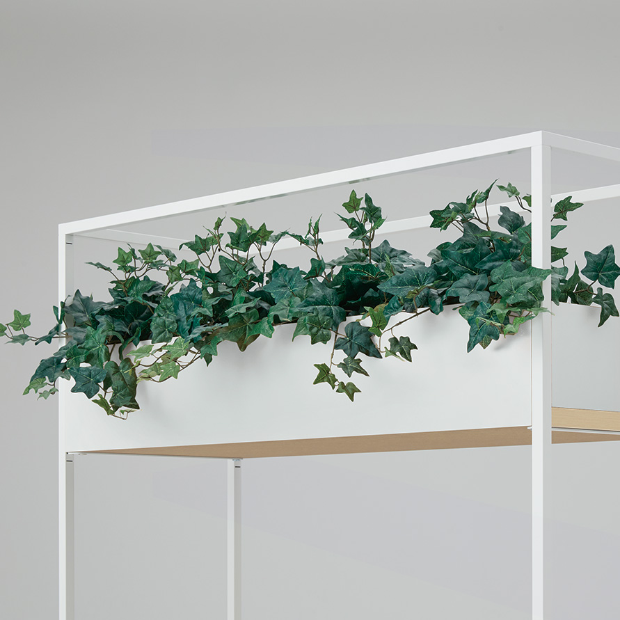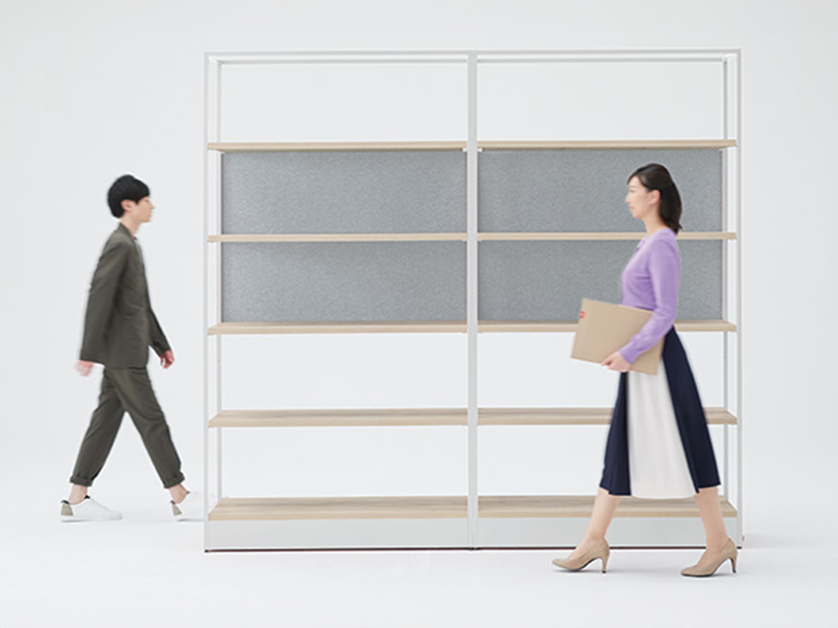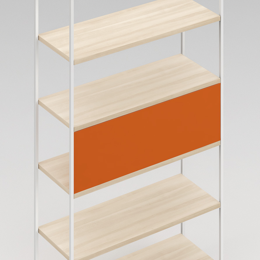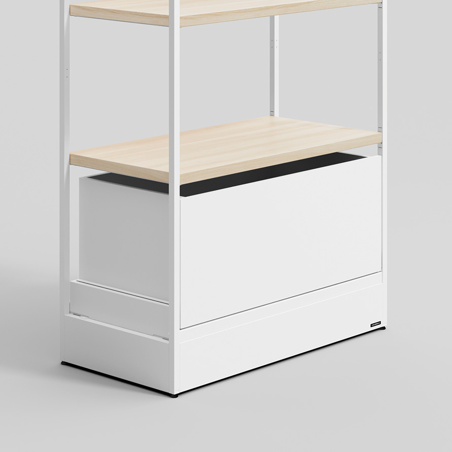 システム収納組み込みタイプはレクトラインやピクスラインなどのシステム収納をそのまま組み込むことが可能です。上部はオープンなまま収納量を増やせるため、圧迫感を与えずひろがりのある空間を実現します。ライブスシェルフの抜け感とシステム収納の収納力を両立することができます。