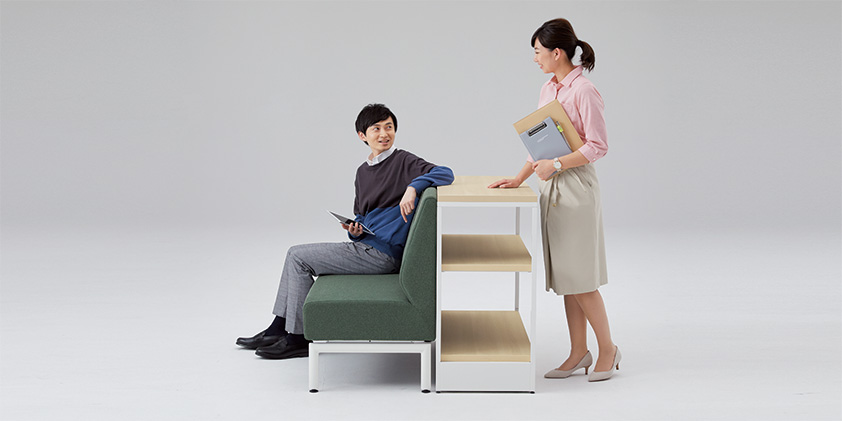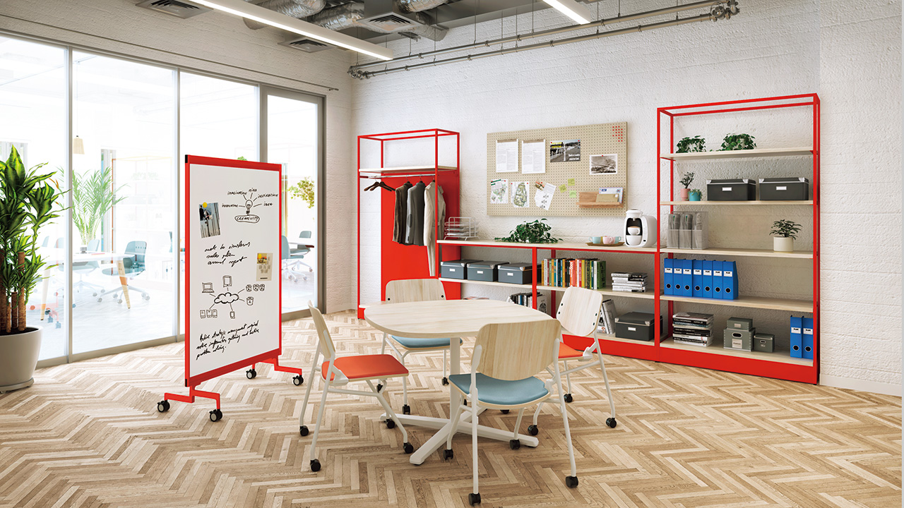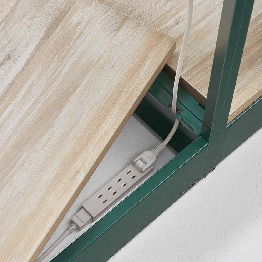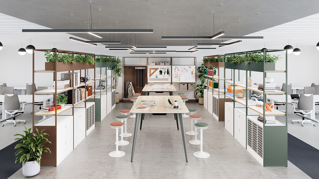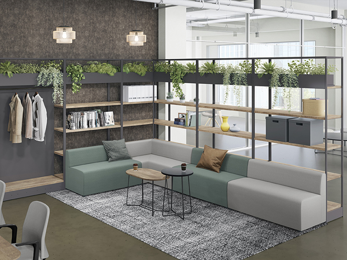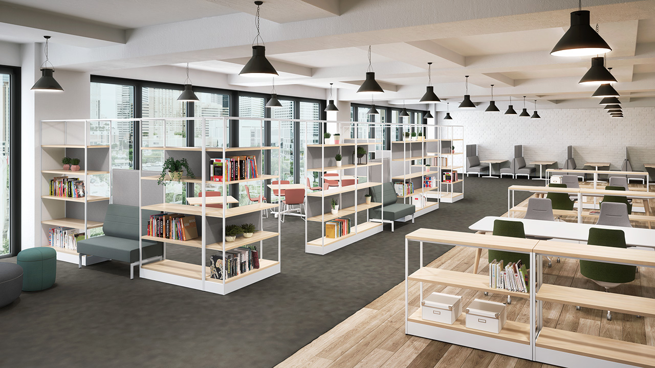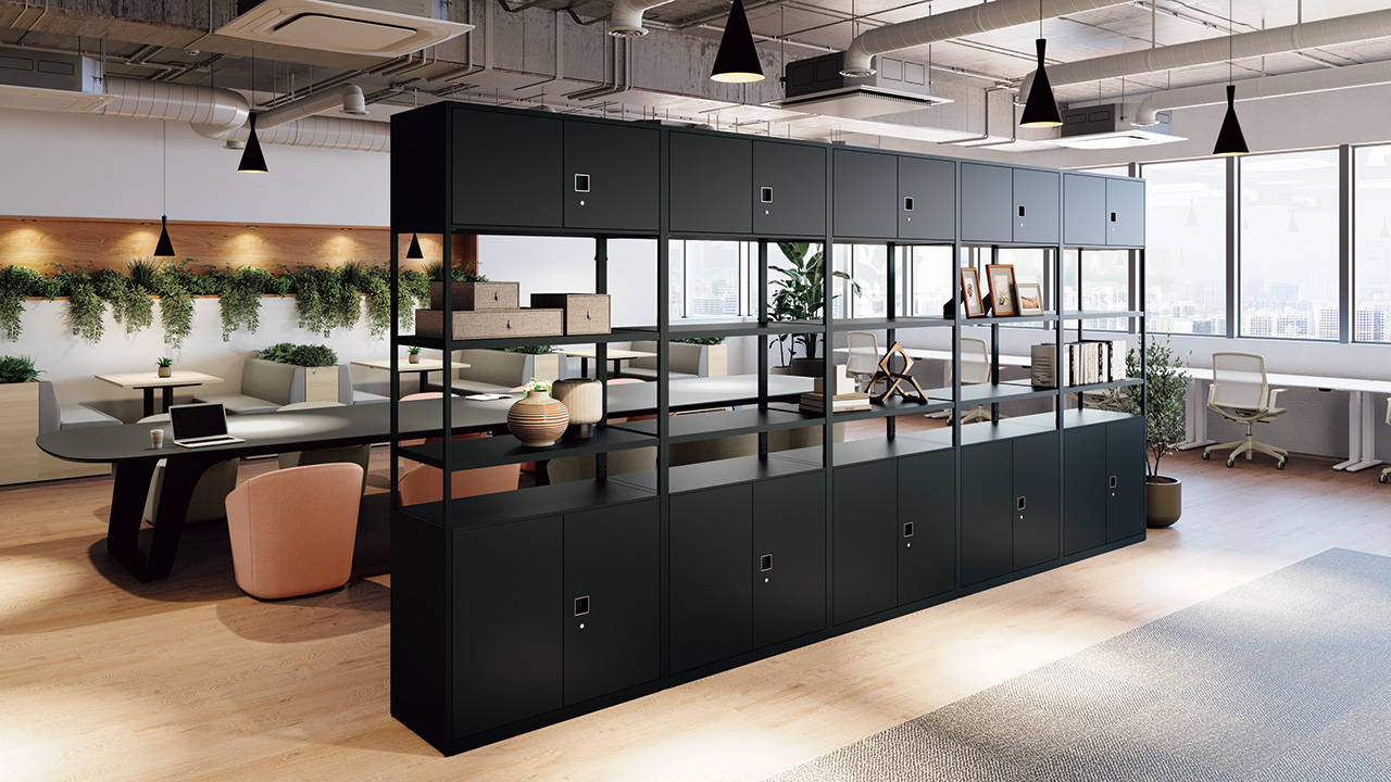 システム収納組み込みタイプはレクトラインやピクスラインなどのシステム収納をそのまま組み込むことが可能です。上部はオープンなまま収納量を増やせるため、圧迫感を与えずひろがりのある空間を実現します。ライブスシェルフの抜け感とシステム収納の収納力を両立することができます。