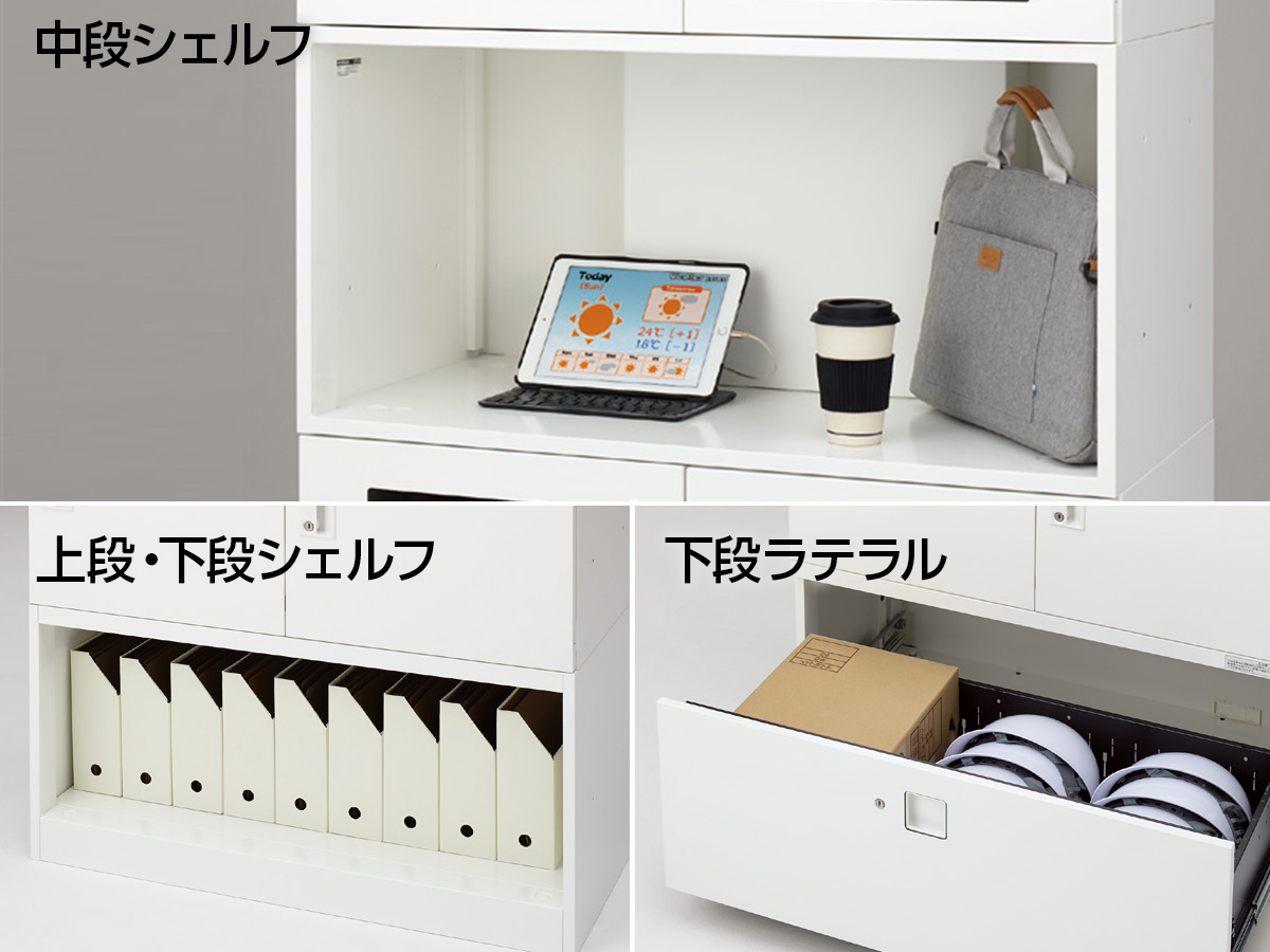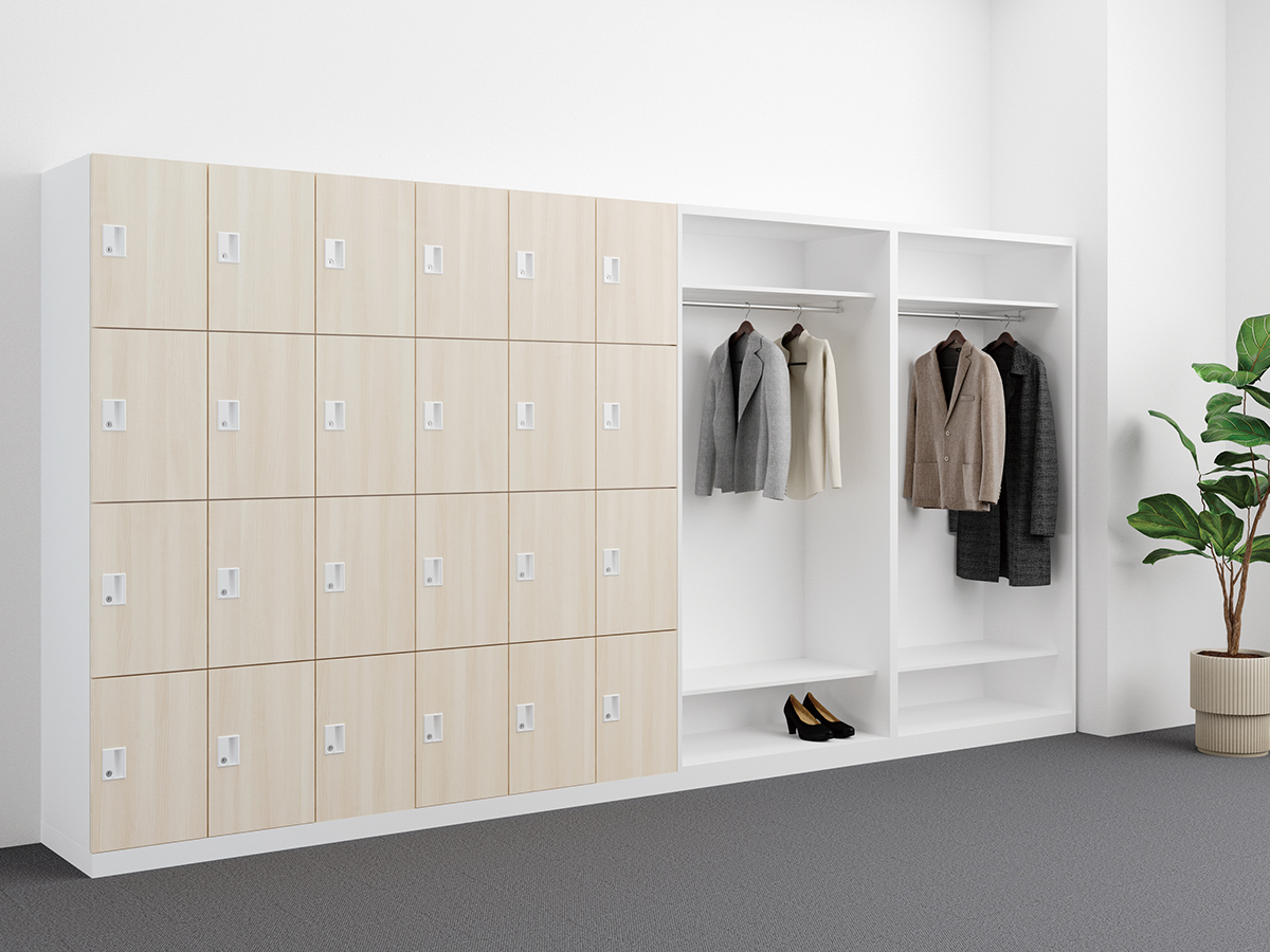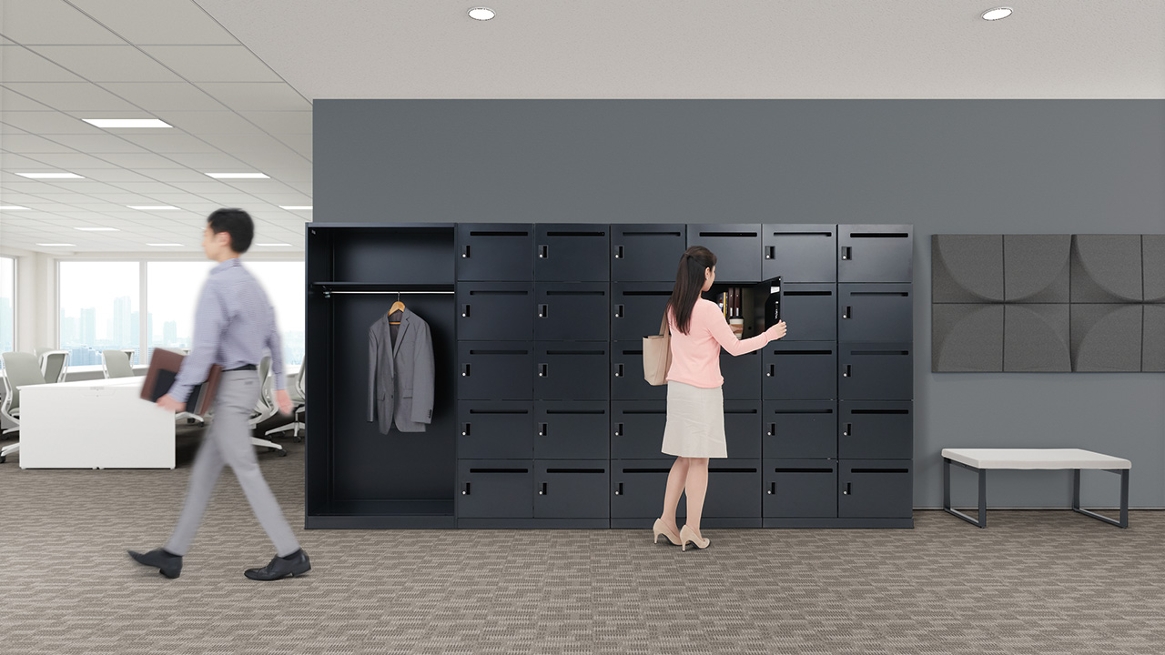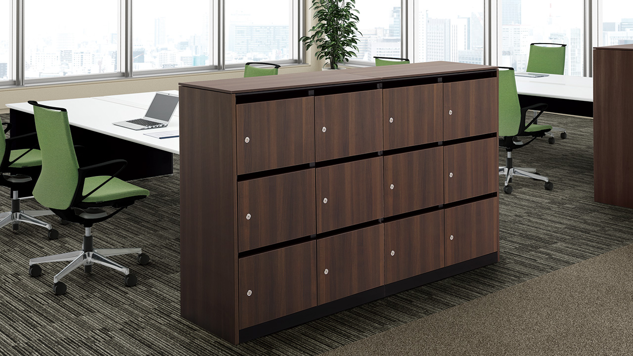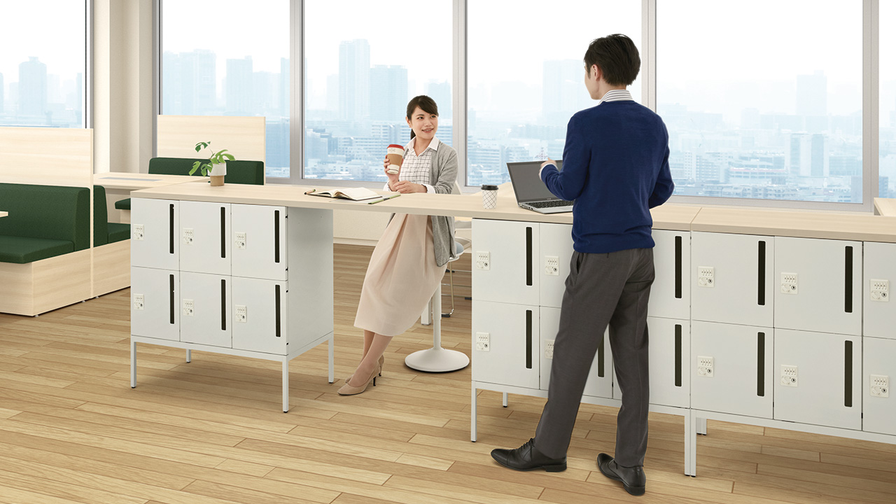 執務エリア内に分散配置することで、自席からロッカーまでの距離を平準化することができます。また天板面はコミュニケーションカウンターや立ち作業のスペースとして活用できます。アクティビティが高く、多くの共用スペースを必要とする働き方に適したレイアウトです。