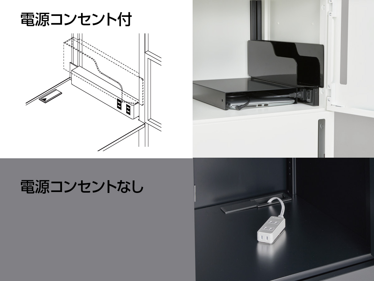 PCや携帯電話、タブレットPCなどのモバイル機器を充電することができます。電源コンセントなしの製品には配線孔があり、電源タップを庫内に引き込むことも可能です。