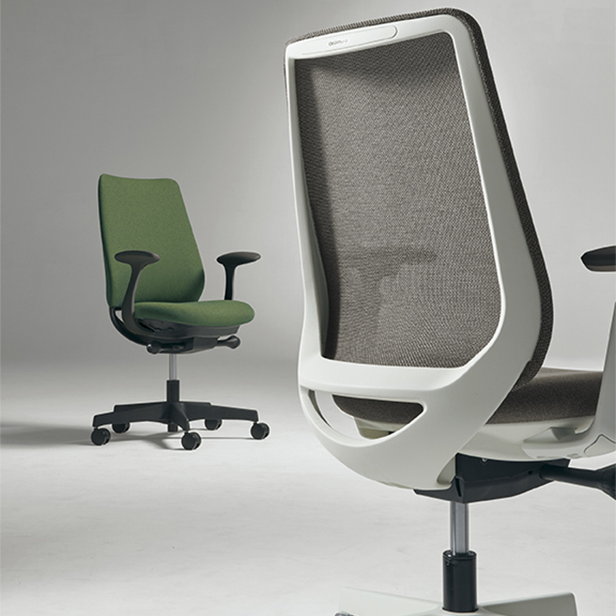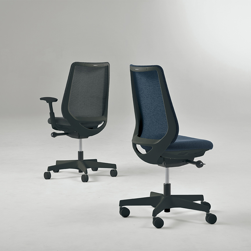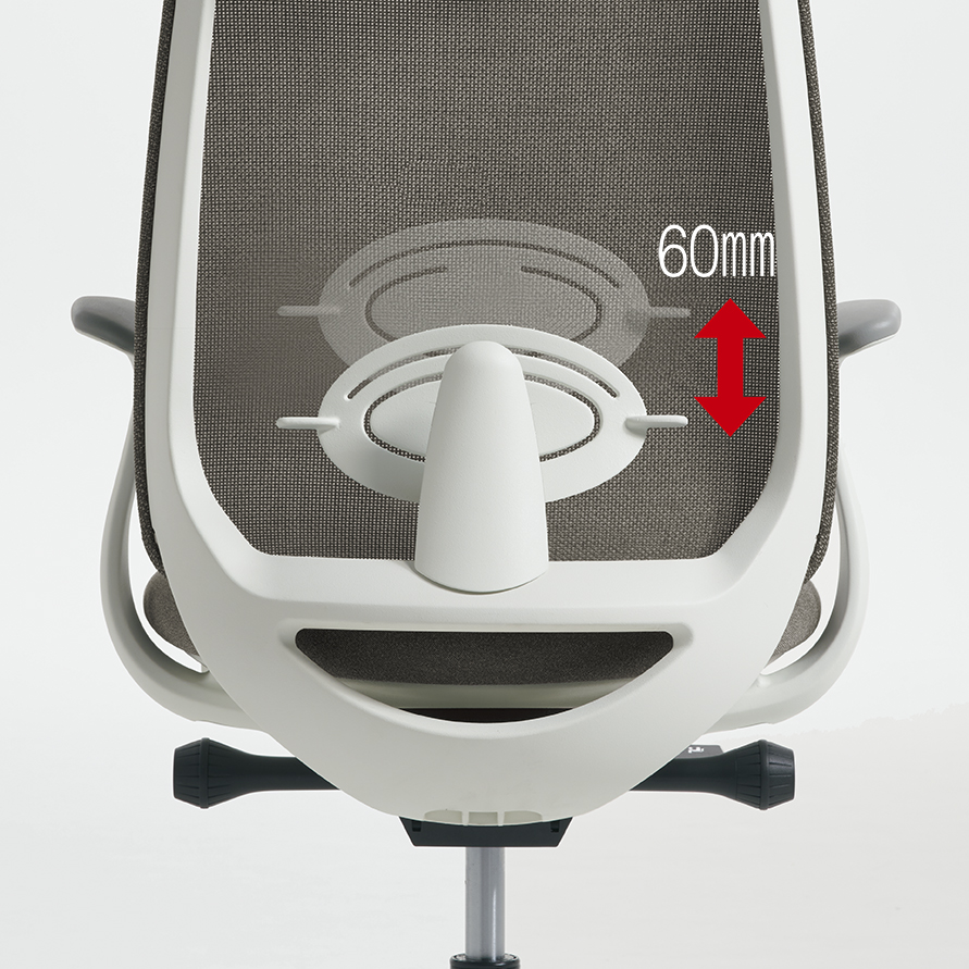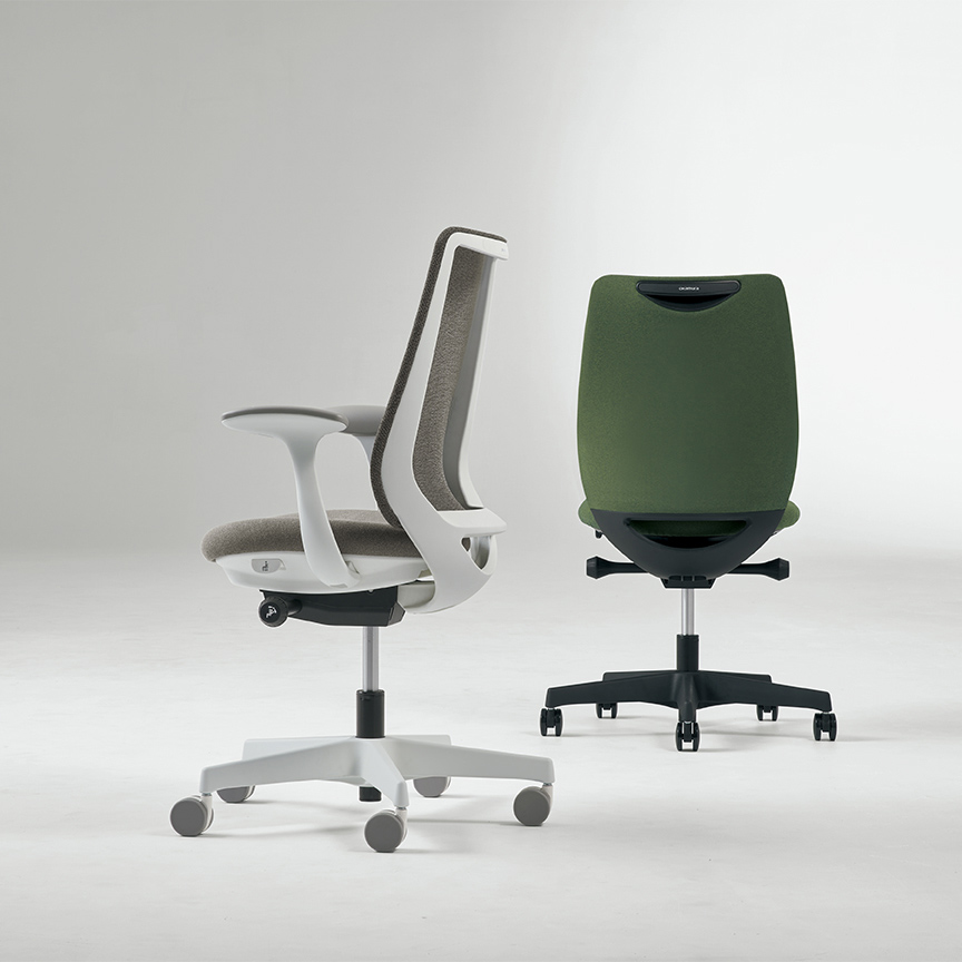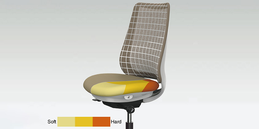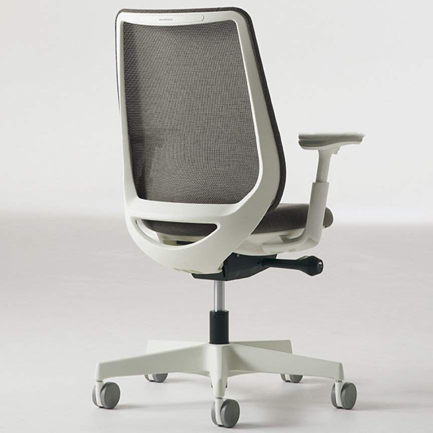 座った瞬間、ソフトなクッションが身体をやさしく受けとめます。さらに、背もたれの内部に採用した樹脂シェルのグリッドが、背中の動きにあわせて変形するため、長時間のハードワークでも快適です。