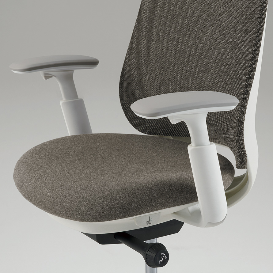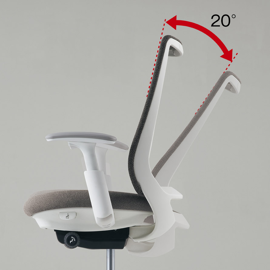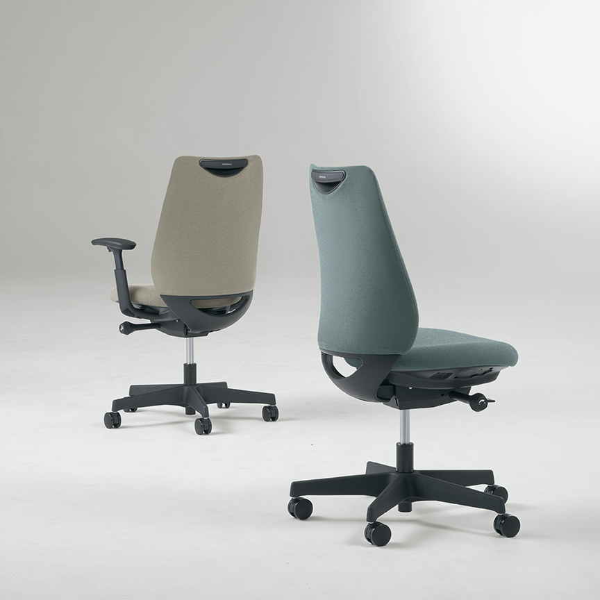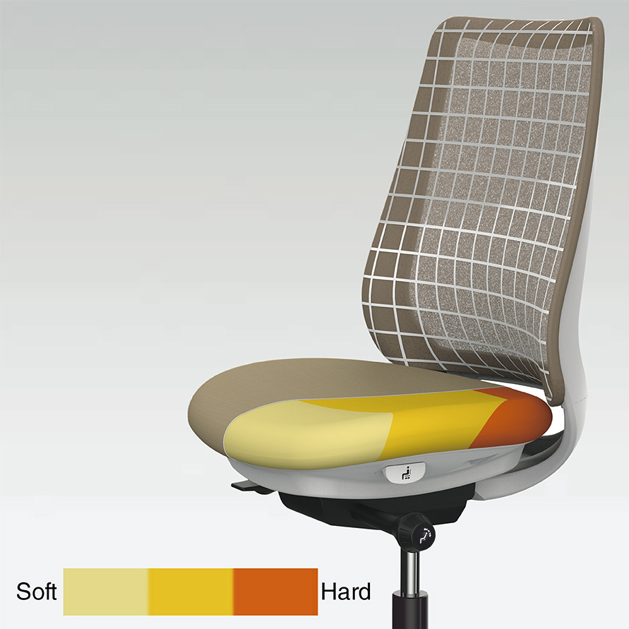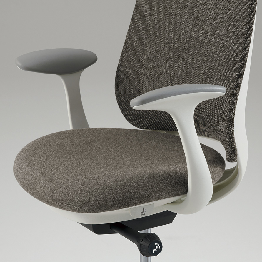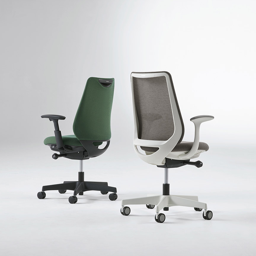 座った瞬間、ソフトなクッションが身体をやさしく受けとめます。さらに、背もたれの内部に採用した樹脂シェルのグリッドが、背中の動きにあわせて変形するため、長時間のハードワークでも快適です。