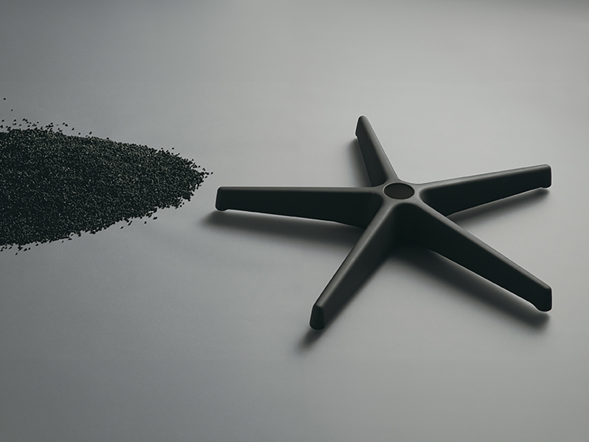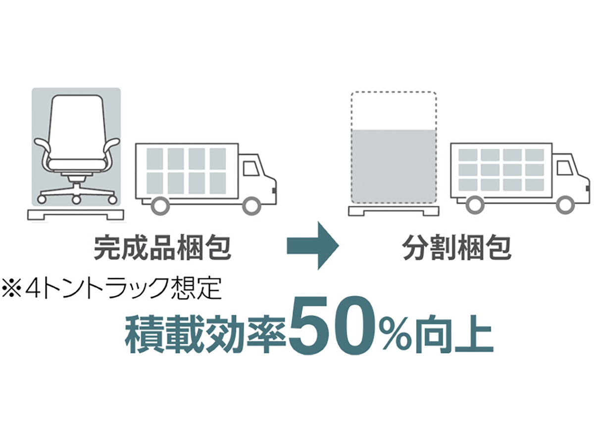 持続可能な社会を目指し、環境負荷低減と末長くお使いいただくための工夫をしています。製品として使用済みの樹脂脚を回収し、分別・粉砕を経て再び新たな樹脂脚として生まれ変わったリサイクル脚をラインナップしています。(サーキュラーモデルのボディ・脚カラーはブラックのみの仕様となります。)また、製品の配送時に分割出荷することで運搬における配送効率や燃費が向上し、CO2の排出を抑制します。(積載効率が50% アップ)