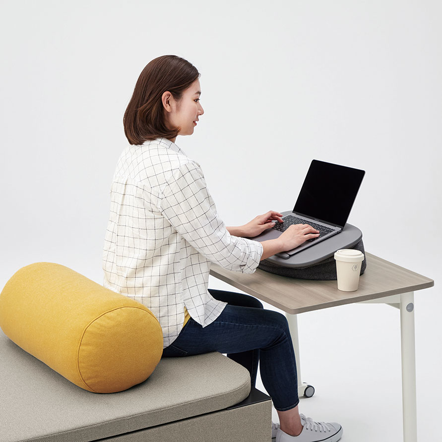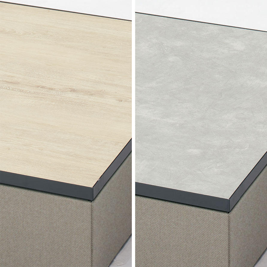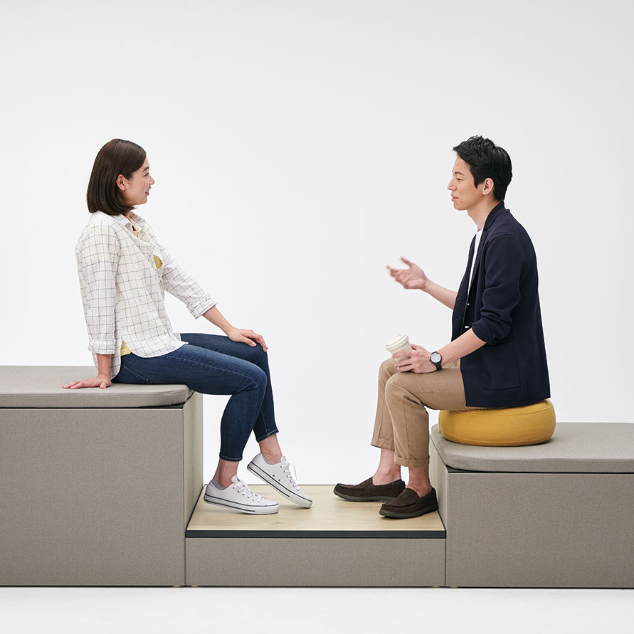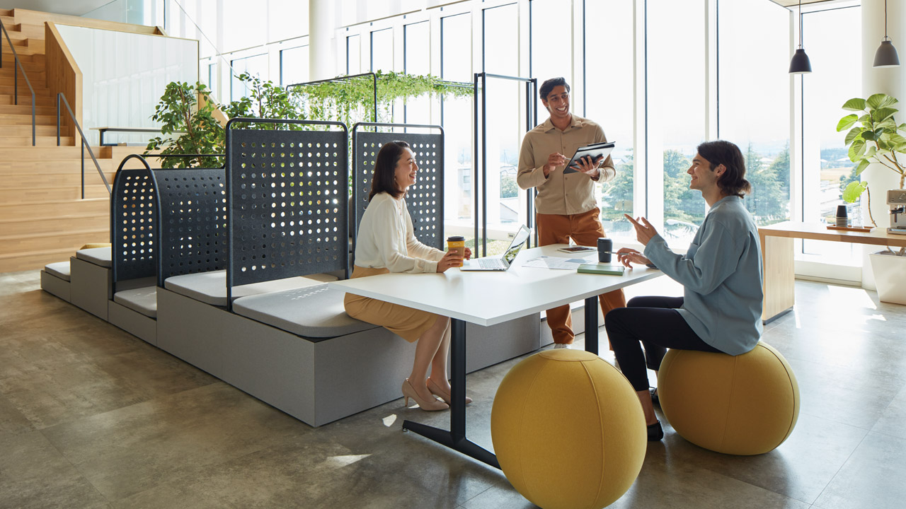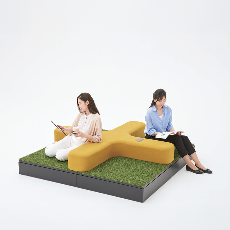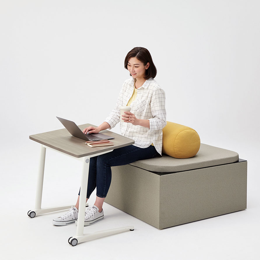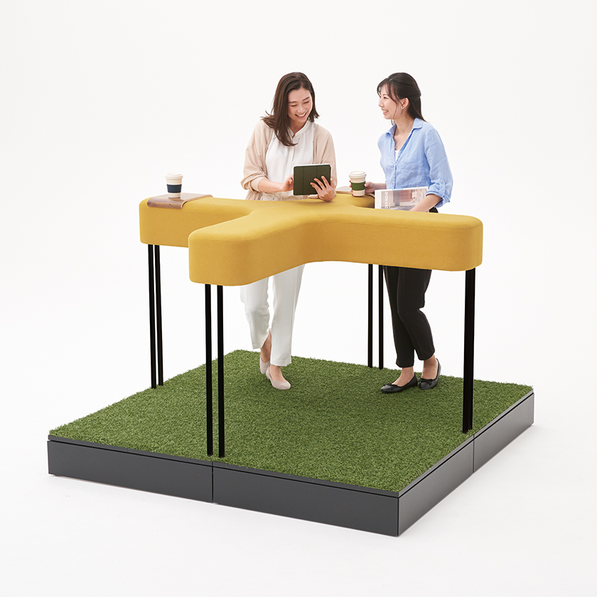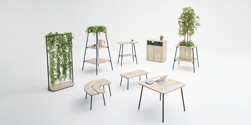 スノコ状の天板や積層合板風のエッジが特徴で、ストリートファニチュアのような雰囲気の品揃え。オフィスの中にいながら公園で人々が憩ったり、リフレッシュしたりするような空間を創り出します。※屋外での使用は想定しておりません。