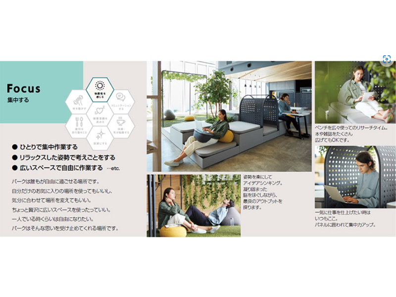 ● ひとりで集中作業する● リラックスした姿勢で考えごとをする● 広いスペースで自由に作業する …etc. パークは誰もが自由に過ごせる場所です。自分だけのお気に入りの場所を使ってもいいし、気分に合わせて場所を変えてもいい。ちょっと贅沢に広いスペースを使ったっていい。一人でいる時くらいは自由になりたい。パークはそんな思いを受け止めてくれる場所です。