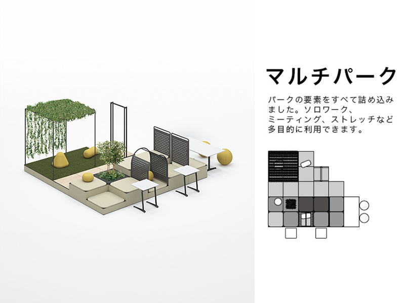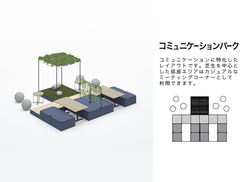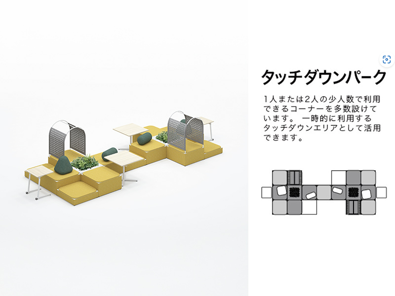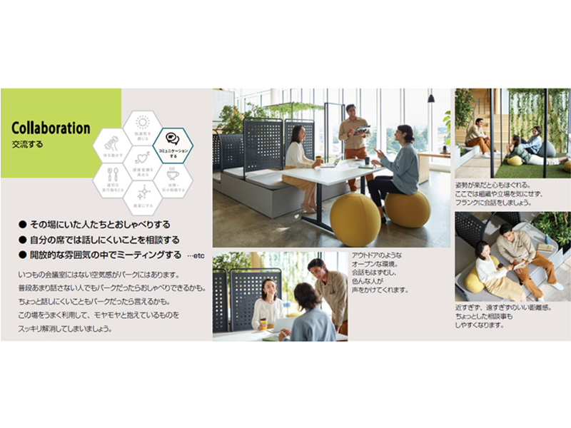 ● その場にいた人たちとおしゃべりする● 自分の席では話しにくいことを相談する● 開放的な雰囲気の中でミーティングする …etcいつもの会議室にはない空気感がパークにはあります。普段あまり話さない人でもパークだったらおしゃべりできるかも。ちょっと話しにくいこともパークだったら言えるかも。この場をうまく利用して、モヤモヤと抱えているものをスッキリ解消してしまいましょう。