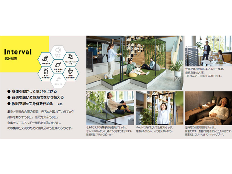 ● 身体を動かして気分を上げる● 音楽を聴いて気持ちを切り替える● 仮眠を取って身体を休める …etc集中と交流の合間の時間、きちんと取れていますか?身体を動かすも良し。仮眠を取るも良し。食事をしてエネルギー補給をするのも良し。次の集中と交流のために備えるのも仕事のうちです。