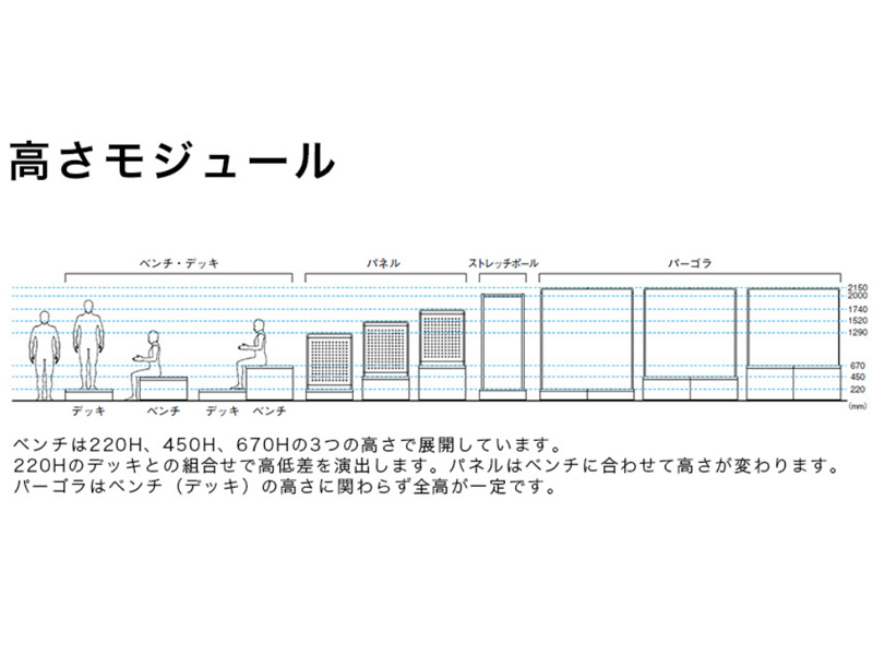 ベンチは220H、450H、670Hの3つの高さで展開しています。220Hのデッキとの組合せで高低差を演出します。パネルはベンチに合わせて高さが変わります。パーゴラはベンチ(デッキ)の高さに関わらず全高が一定です。