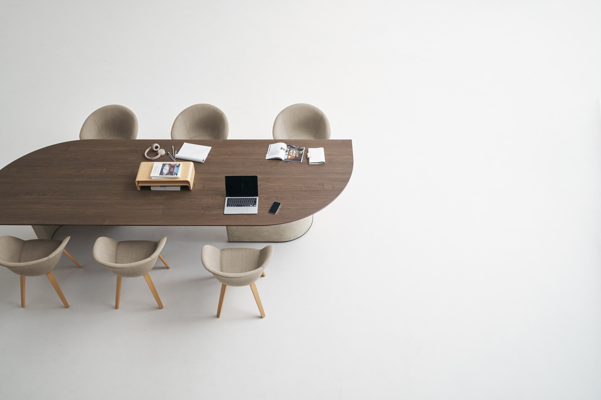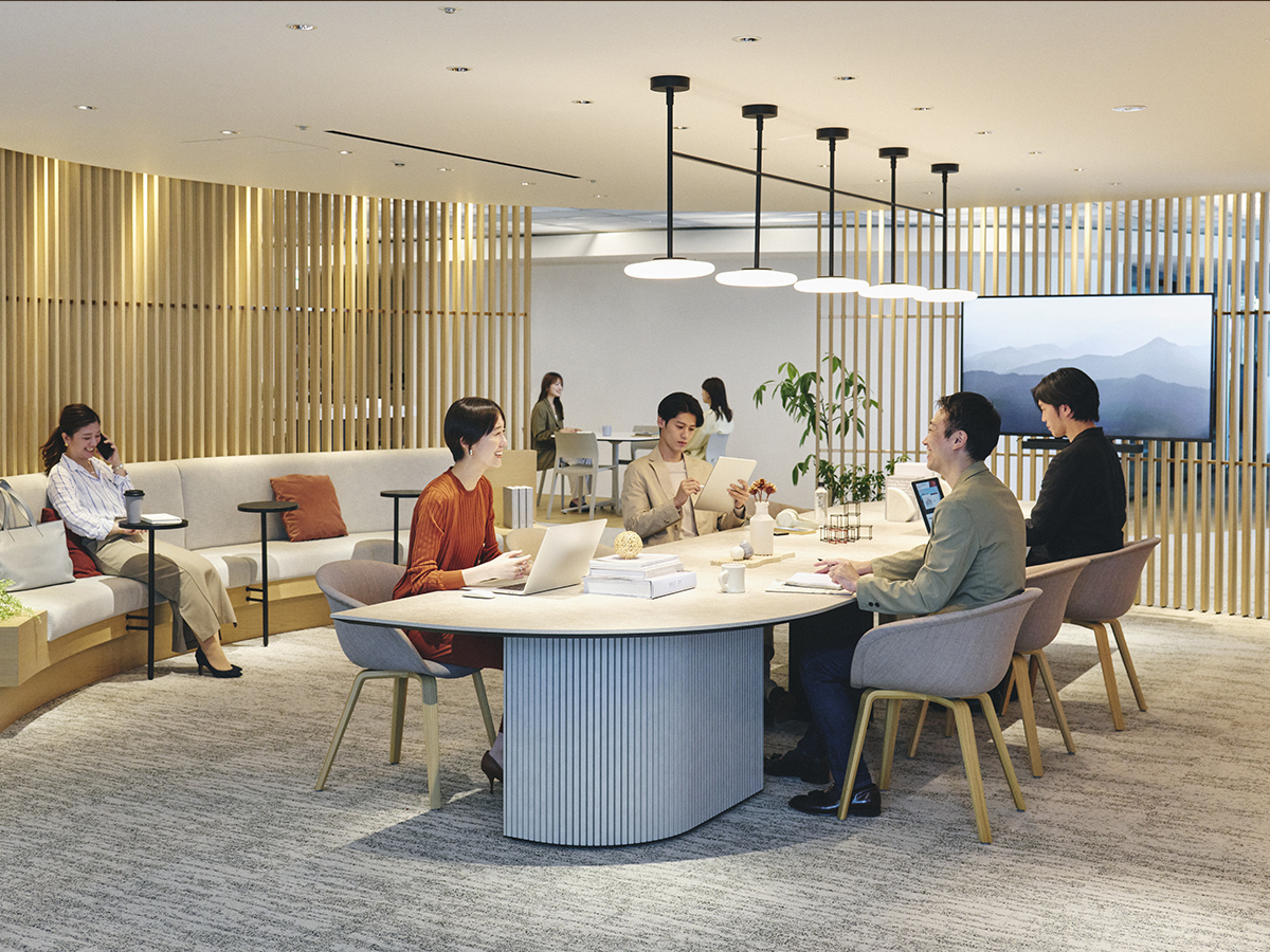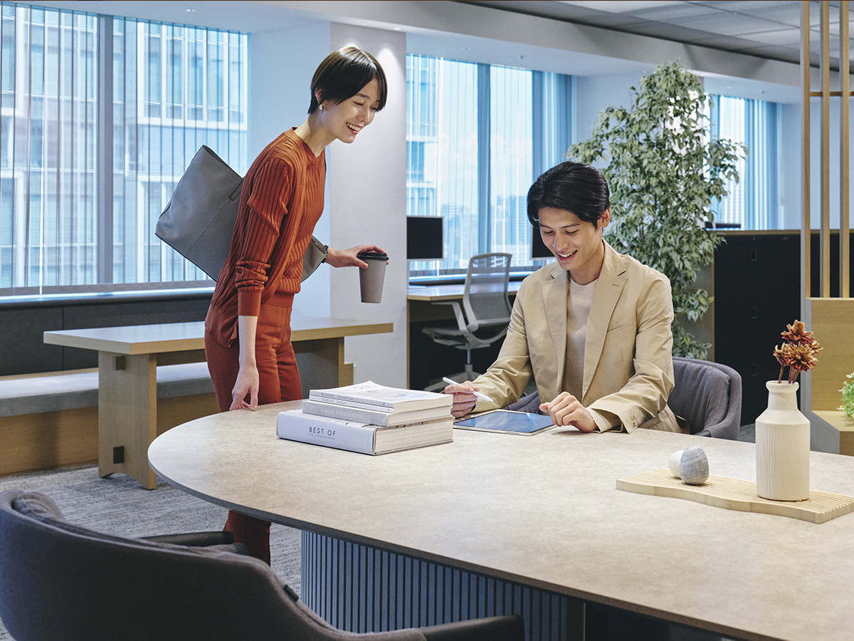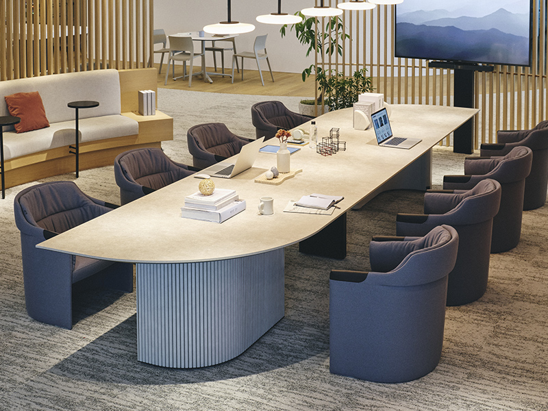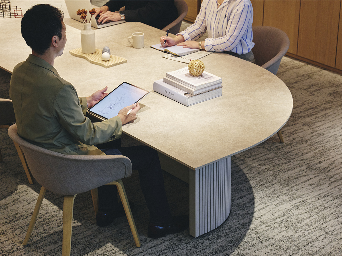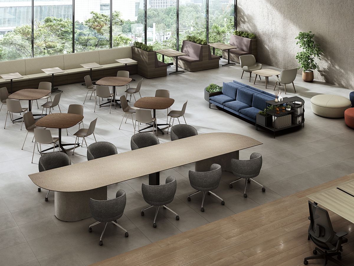 近くを通る人がふと立ち寄りやすいように、テーブルの端はR形状の天板がオーバーハングしています。また、異形テーブルは関係の浅い部門外や社外の人ともテーブルを共用しやすいように、互い違いの座席配置になるようデザインされています。