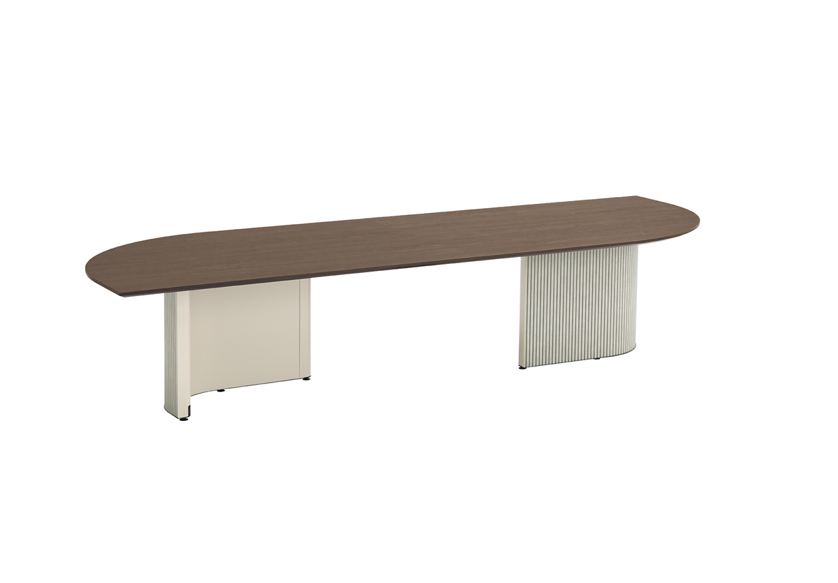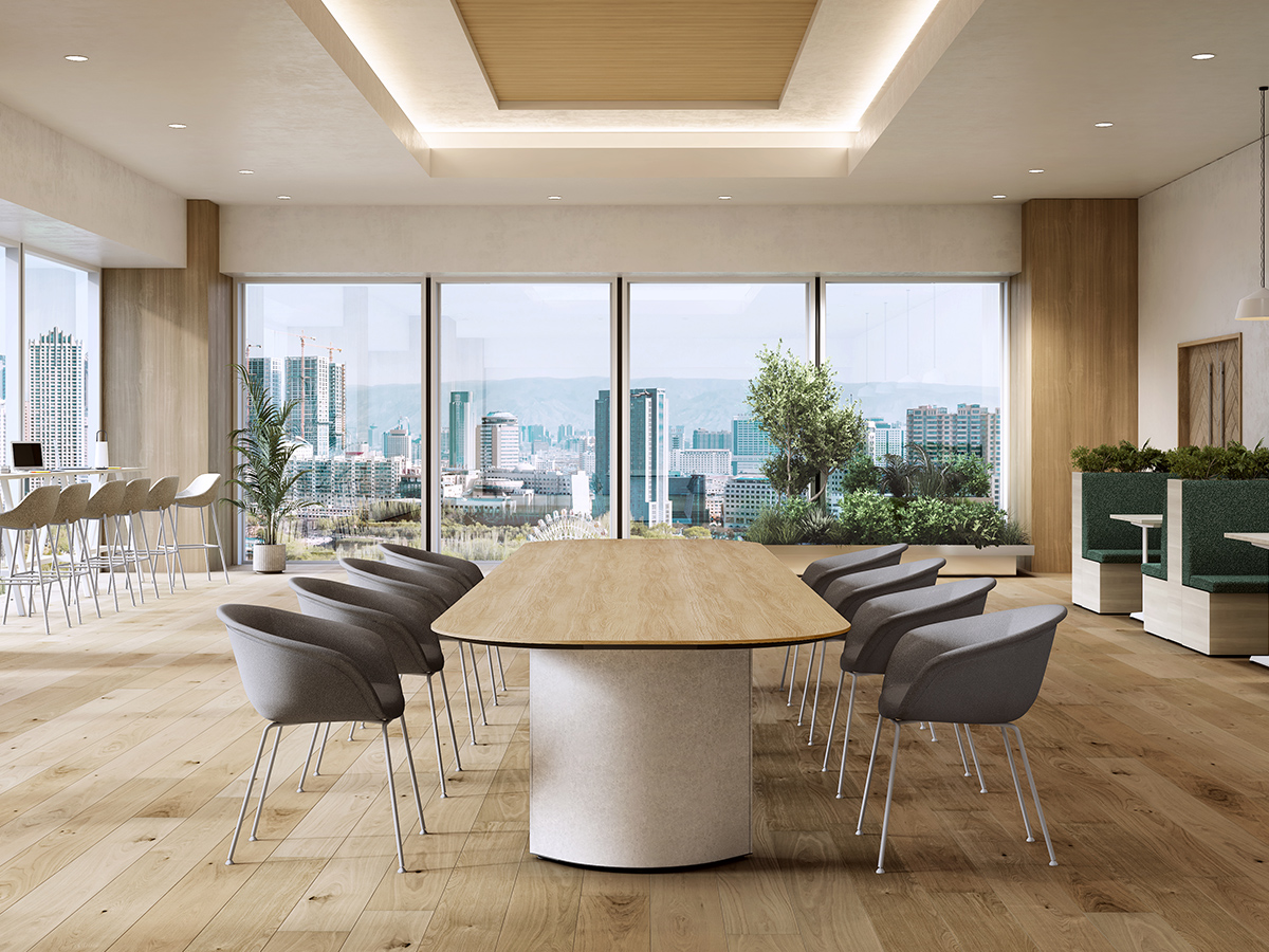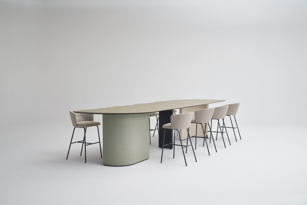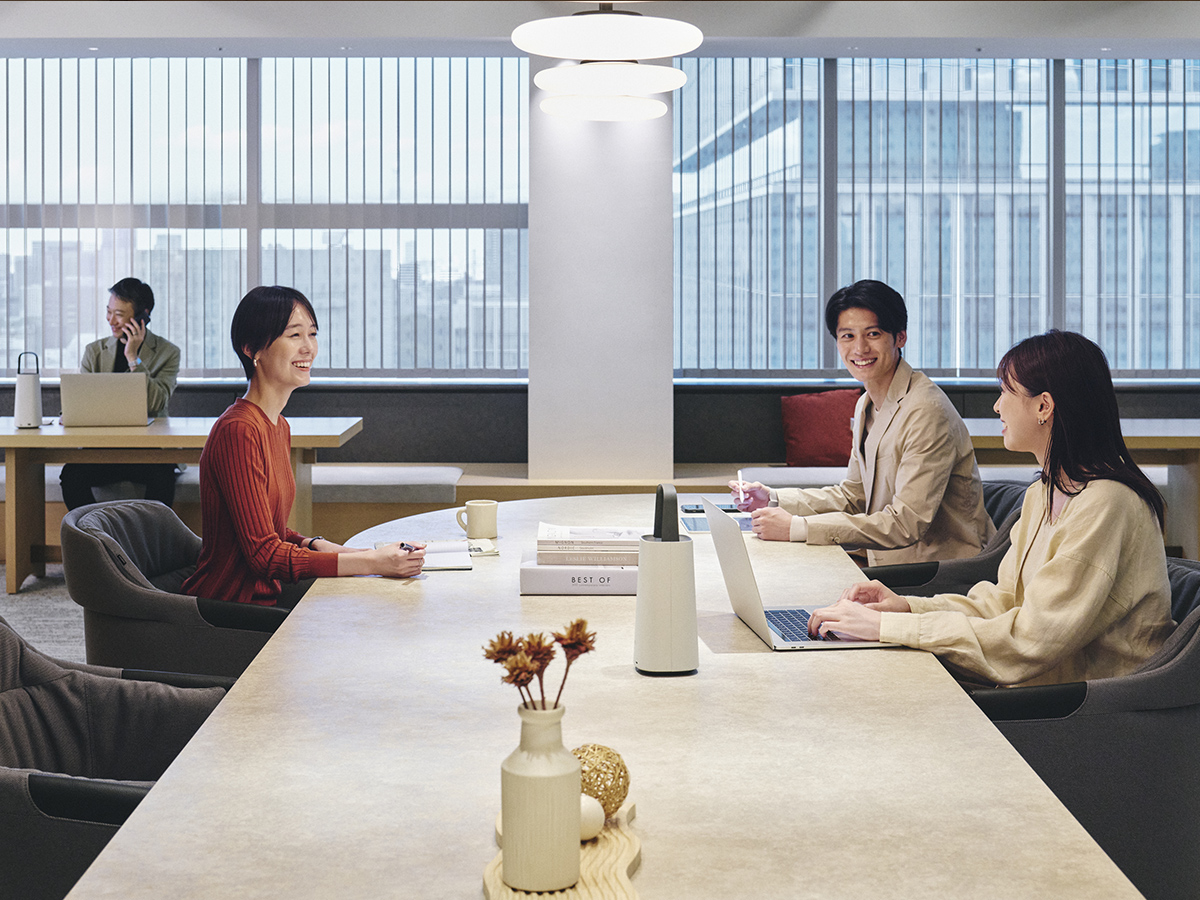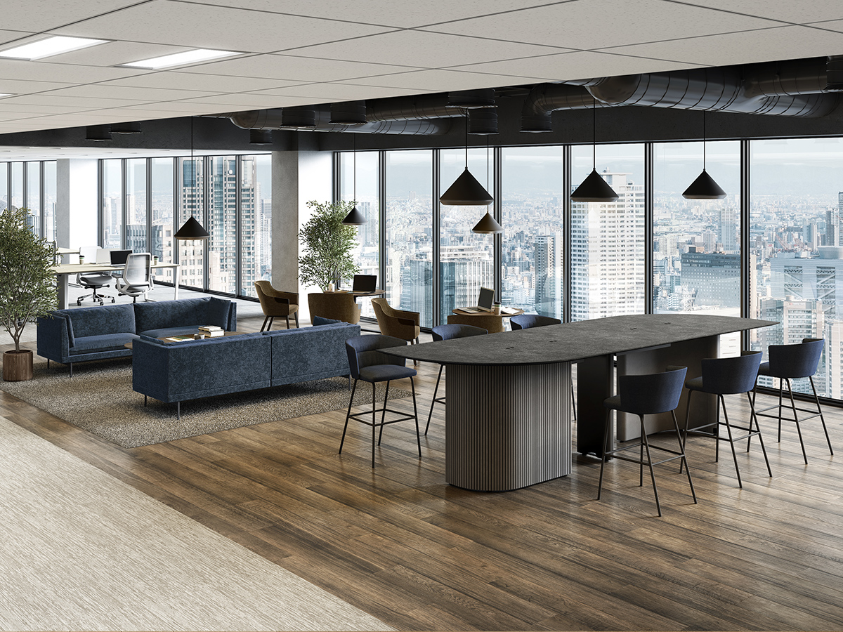 近くを通る人がふと立ち寄りやすいように、テーブルの端はR形状の天板がオーバーハングしています。また、異形テーブルは関係の浅い部門外や社外の人ともテーブルを共用しやすいように、互い違いの座席配置になるようデザインされています。