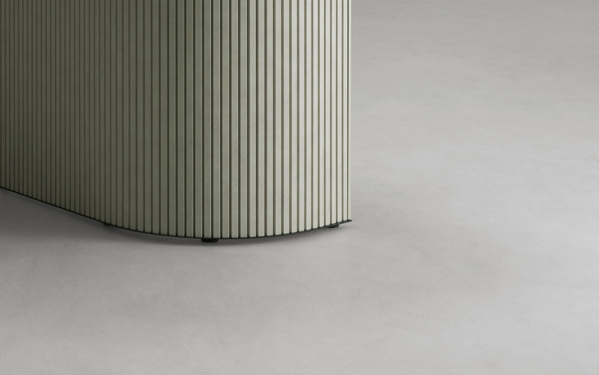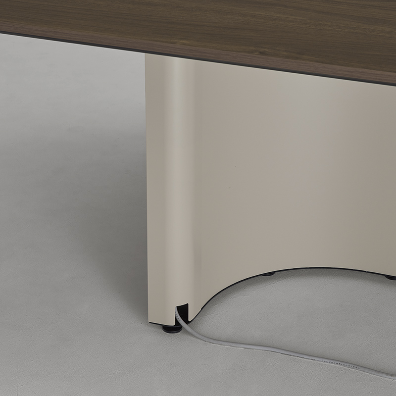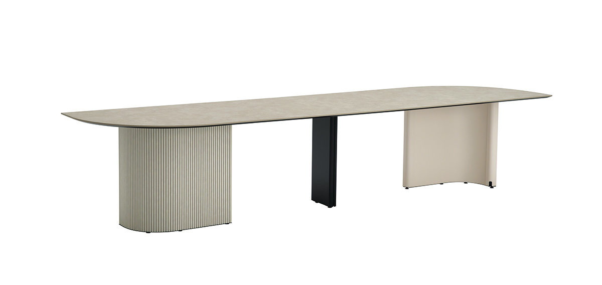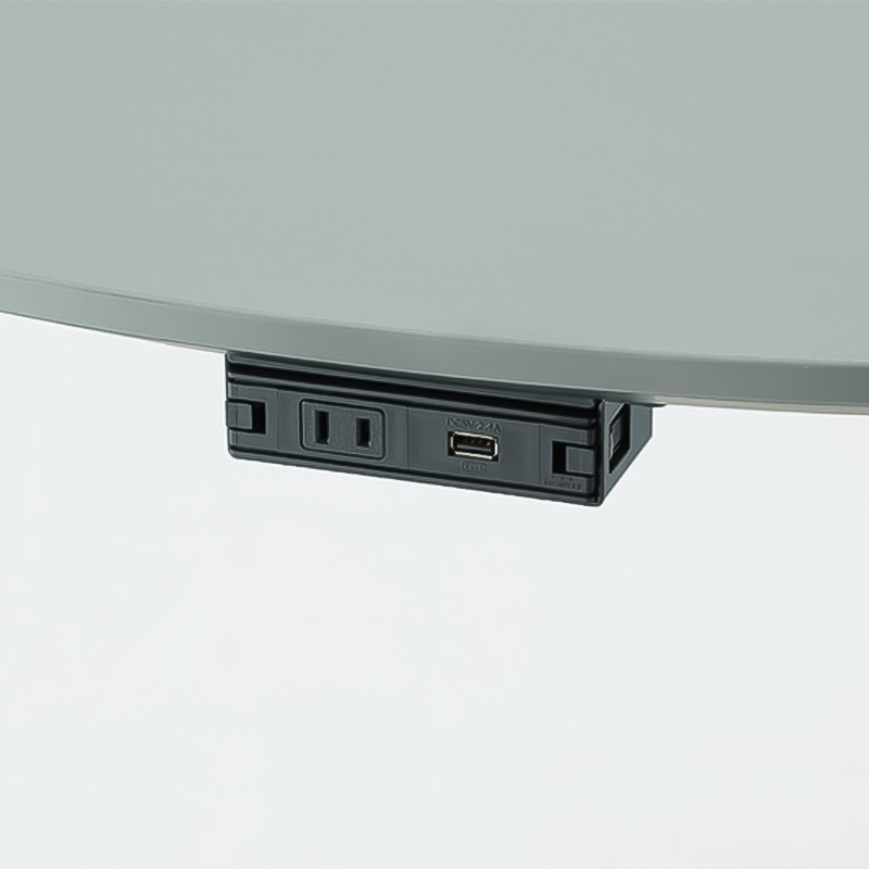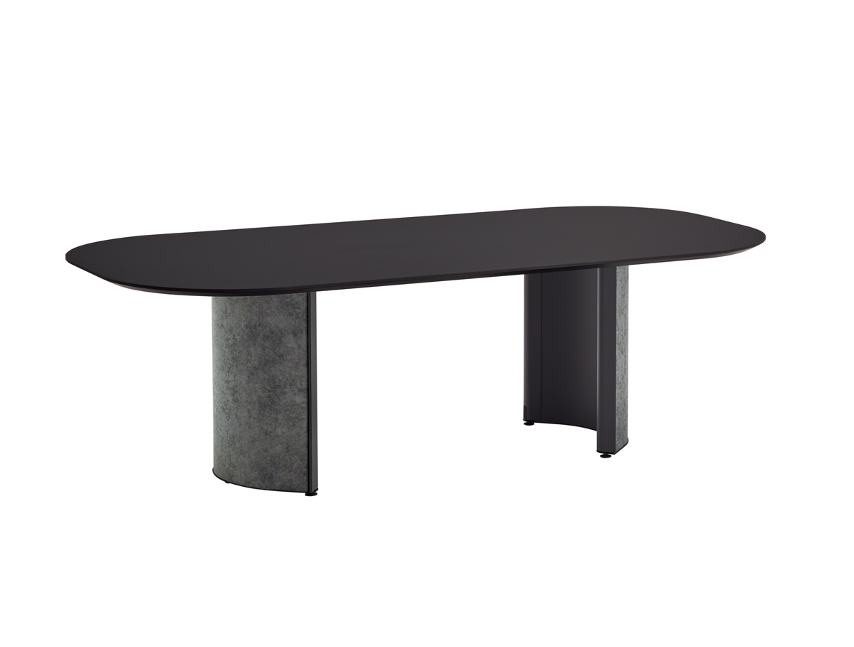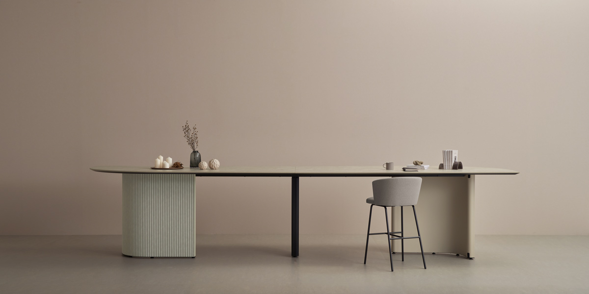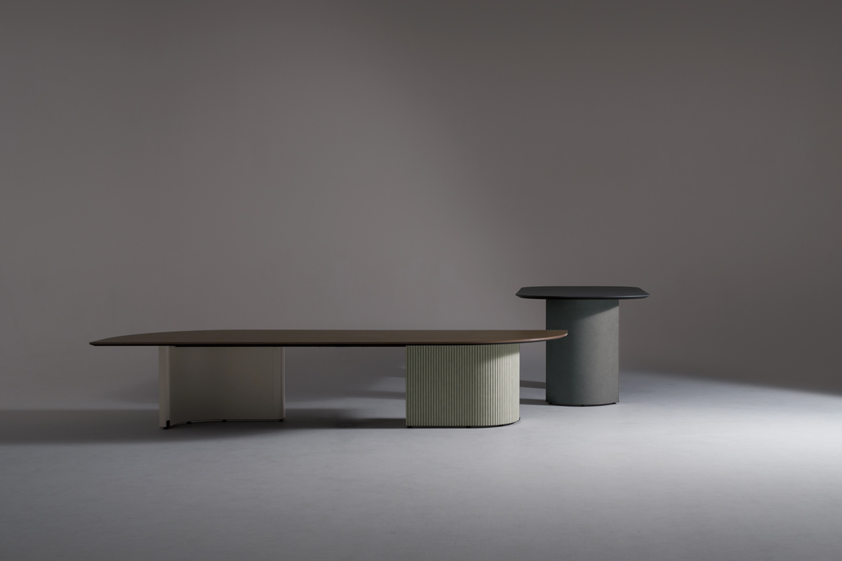 近くを通る人がふと立ち寄りやすいように、テーブルの端はR形状の天板がオーバーハングしています。また、異形テーブルは関係の浅い部門外や社外の人ともテーブルを共用しやすいように、互い違いの座席配置になるようデザインされています。