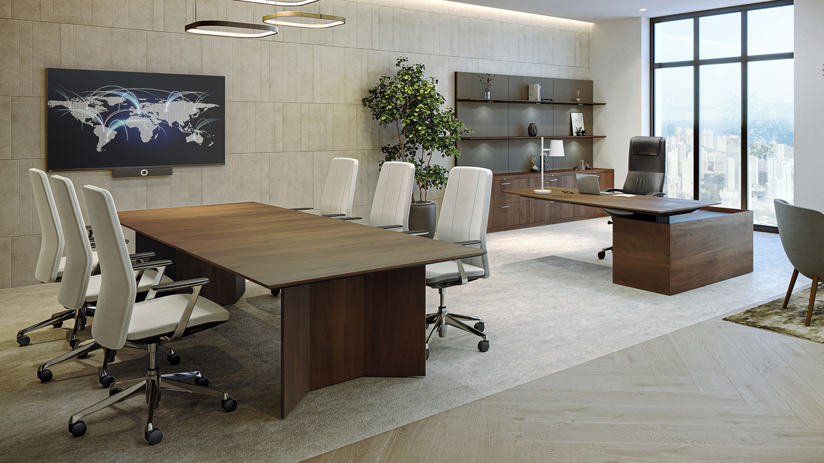 壁面ユニットに電動昇降デスクを組み込むことで、ミーティングスペースを確保しつつ、機能的に働けるエグゼクティブ個室に。エグゼクティブ個室を最小限のサイズにしたことで生まれた空間を、交流スペースとして有効活用できます。