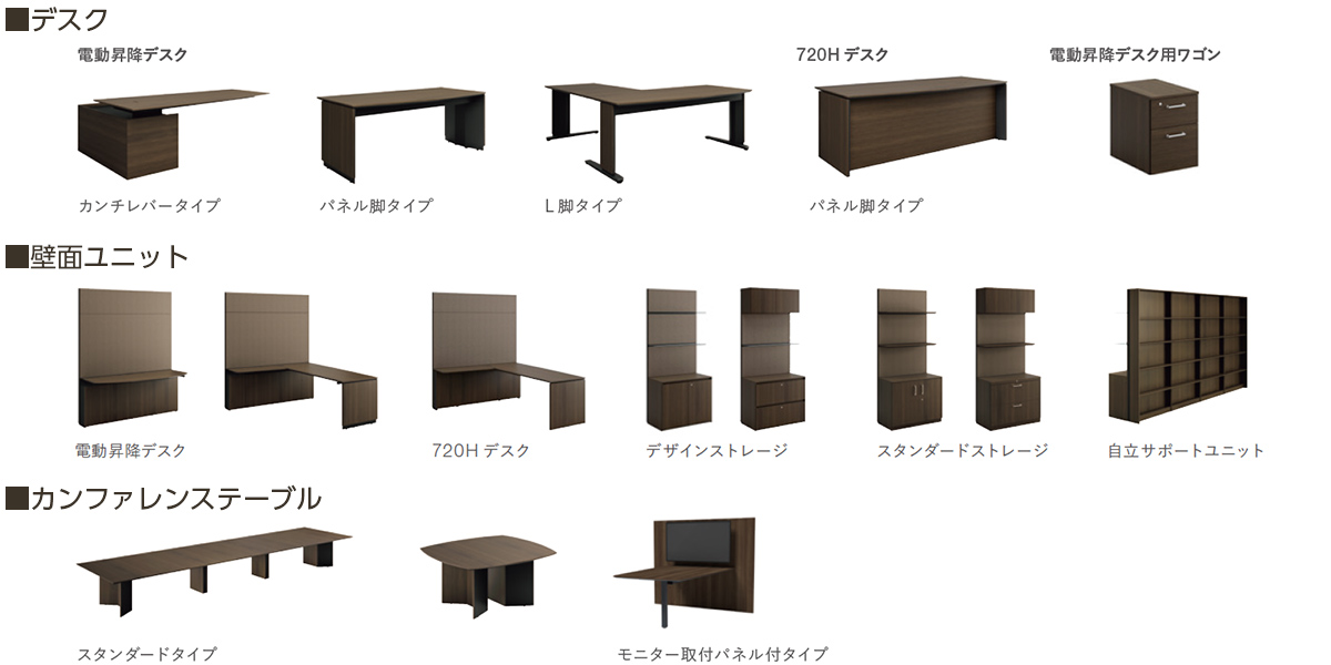 象徴的なデザインのカンチレバーデスクをはじめ、すべてのラインナップがシャープで抜け感のあるデザインです。また、デスクはすべて電動昇降機能を備えており、機能的に健康的に働くことができます。