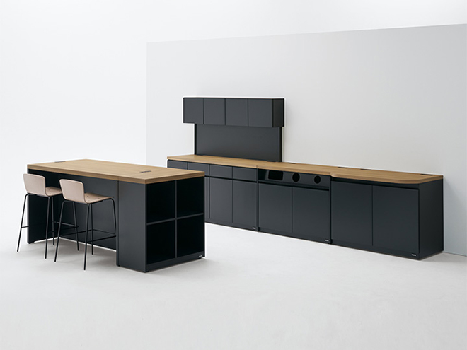 多様な空間になじむ、カウンターとも合わせやすい汎用性のあるキャビネット。壁面設置・アイランド設置の両レイアウトに対応でき、キャビネットのみでカフェスペースを構成することも可能です。
