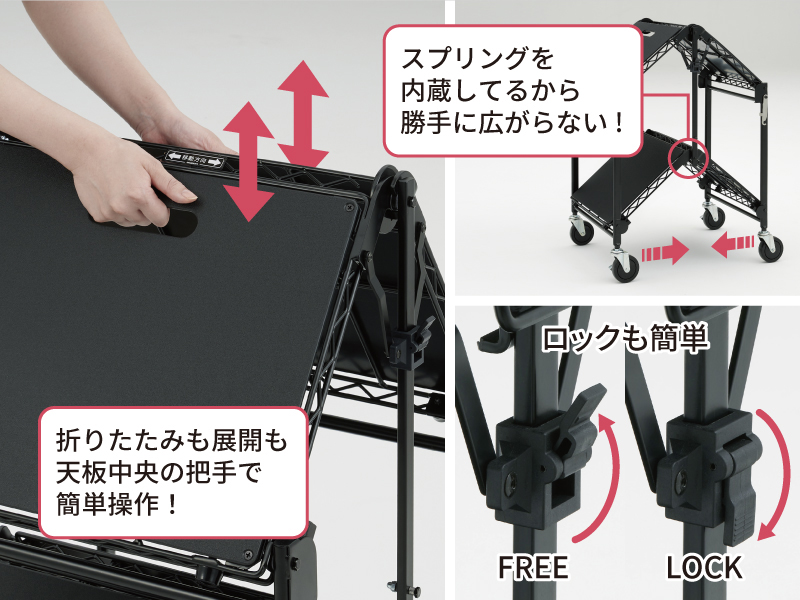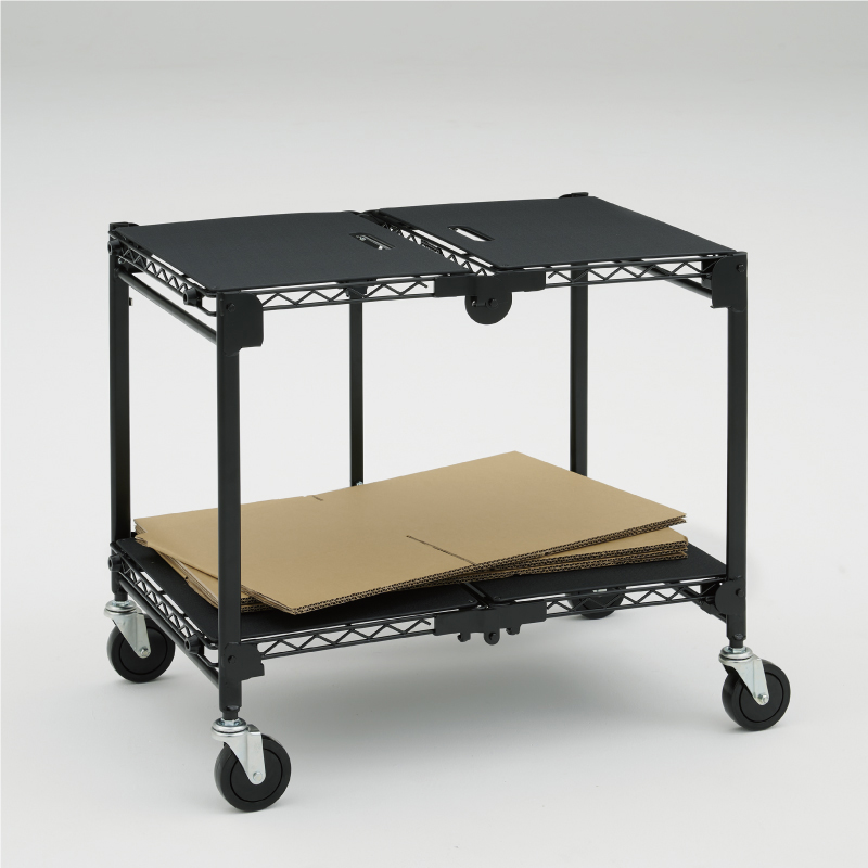 使用していないときも保管スペースが必要、でも本当はもっと作業スペースも欲しい。品出しが忙しい時間帯を考えるとカートはたくさん必要。作業室で働く方のそんな悩みに寄り添う折りたたみができるカートです。