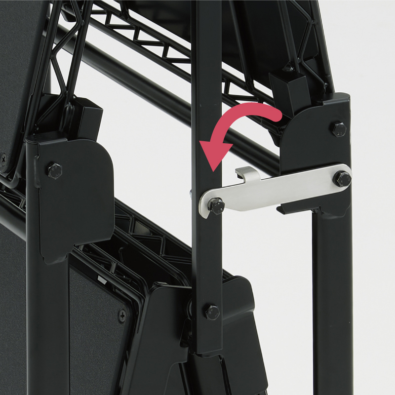 バックヤードのスペース確保とカート不足の解消に。限られたスペースのバックヤードでも、店舗運営にはたくさんの台車が必要。そんな悩みを解決するためにうまれた折りたたみ式の2 段台車です。簡単操作でスペース効率をアップする、新発想の2 段台車で快適な作業環境を実現します。