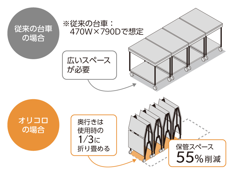 従来の台車では必要な広い保管スペースも、オリコロなら削減可能。必要な時に展開して使用できます。