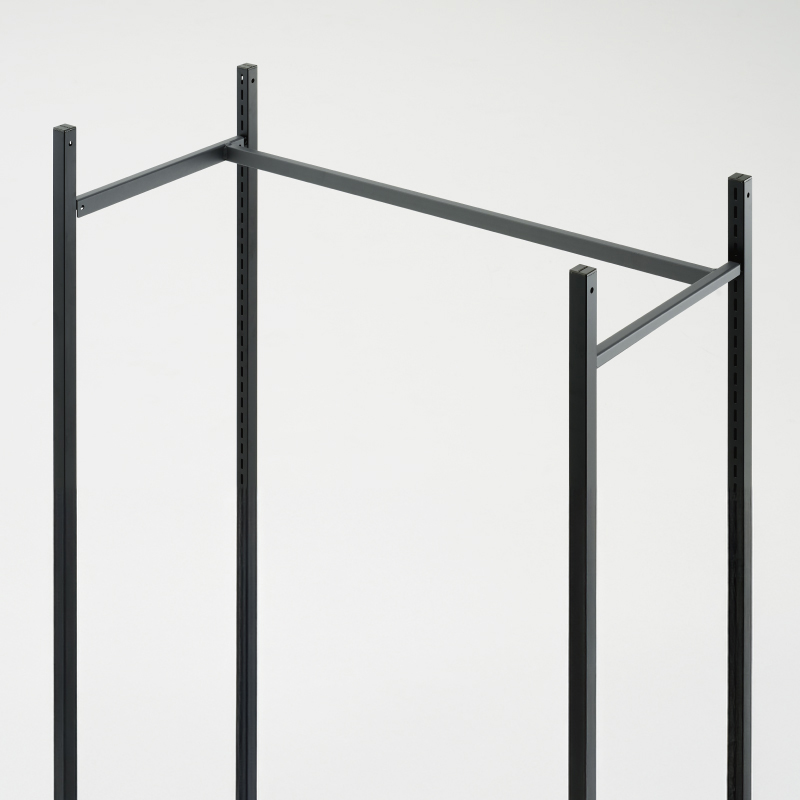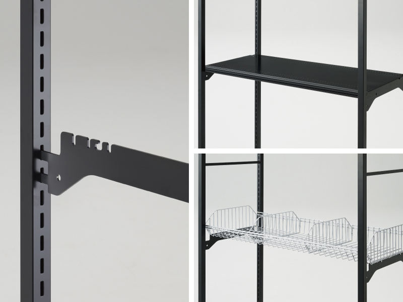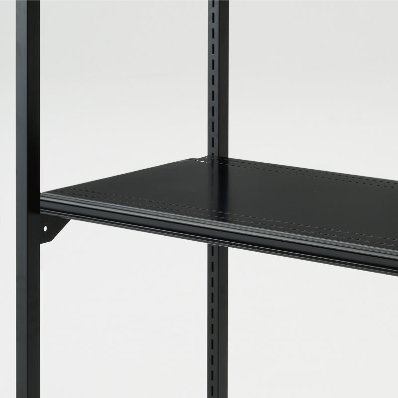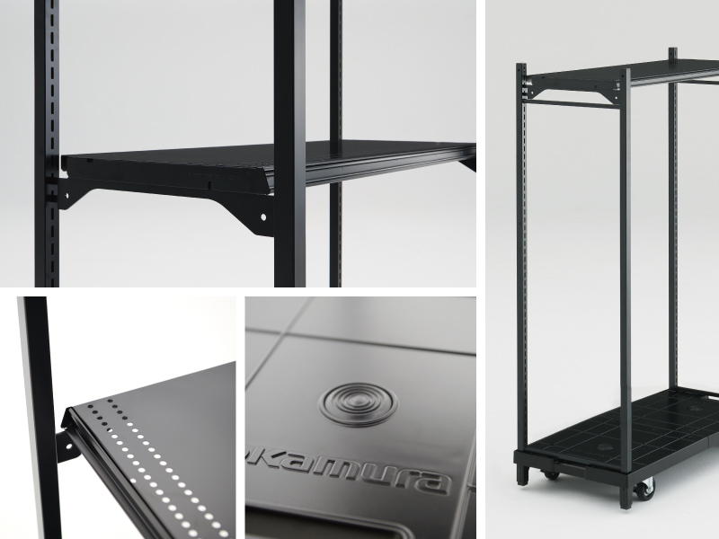 統一感あるブラック仕様、機能とデザインを融合したソリッドなデザインに、余計な桟のないオープン構造が軽やかなラックフレーム。