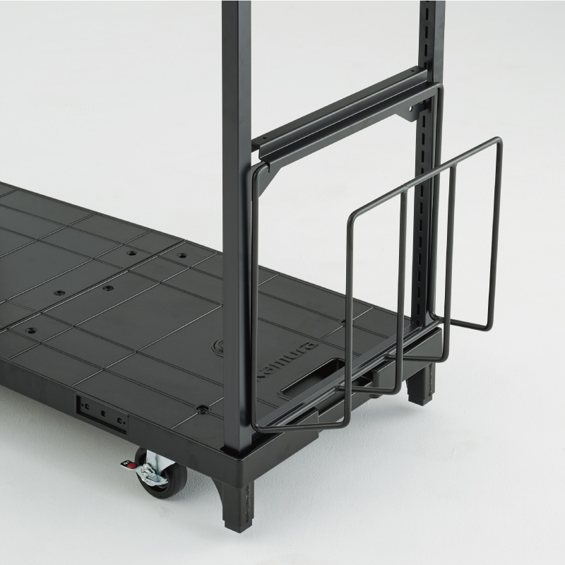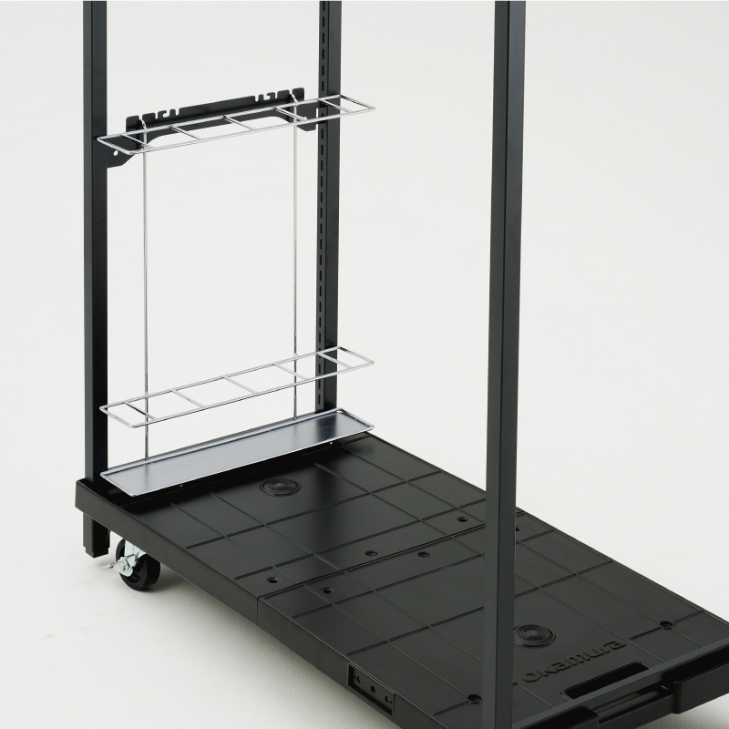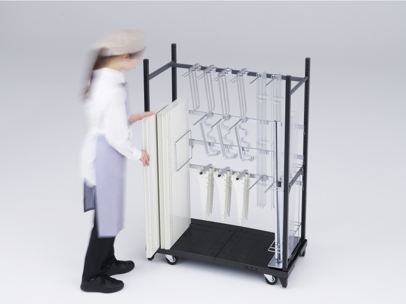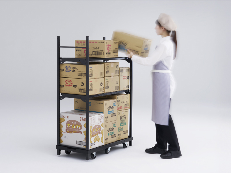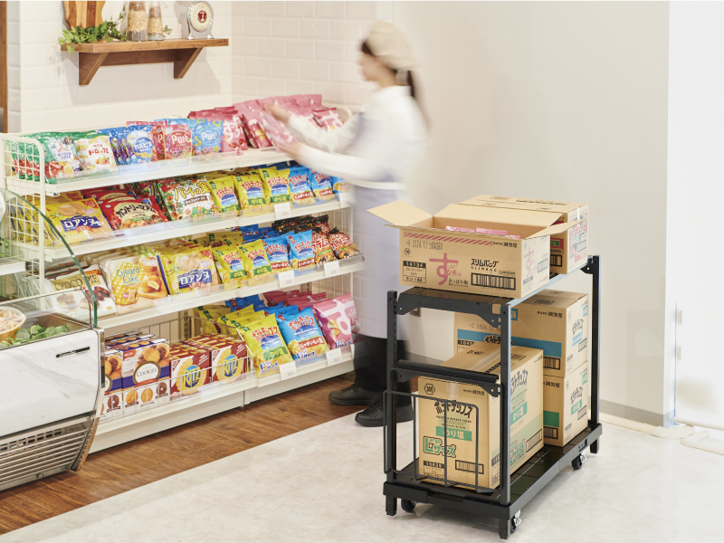 中間棚やダンボール受けを装着可能で、細かい商品の出し入れや空のダンボール処理もスムーズ。品出し作業の負担を軽減します。