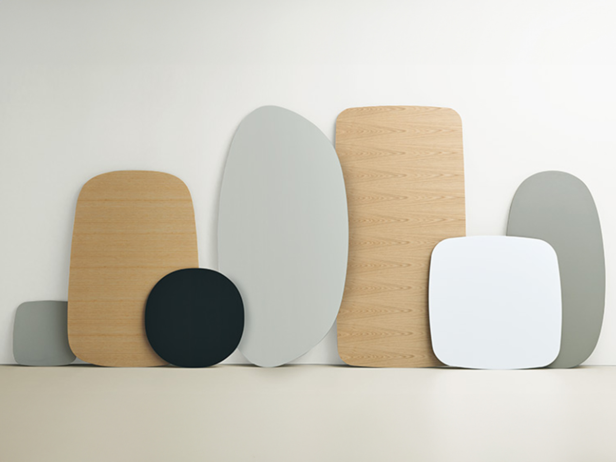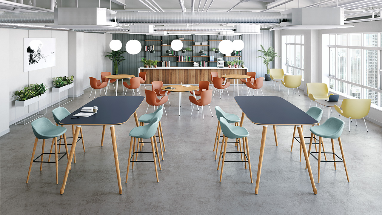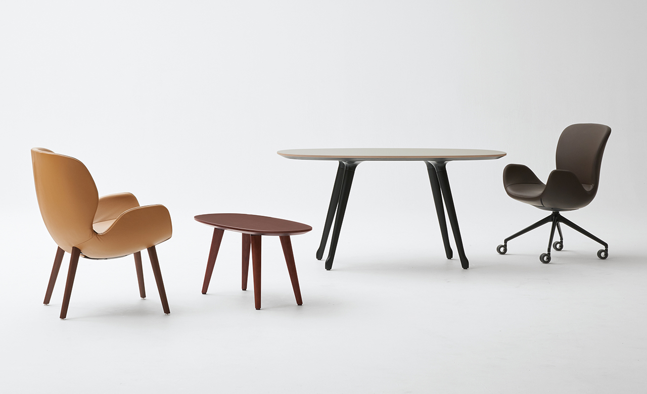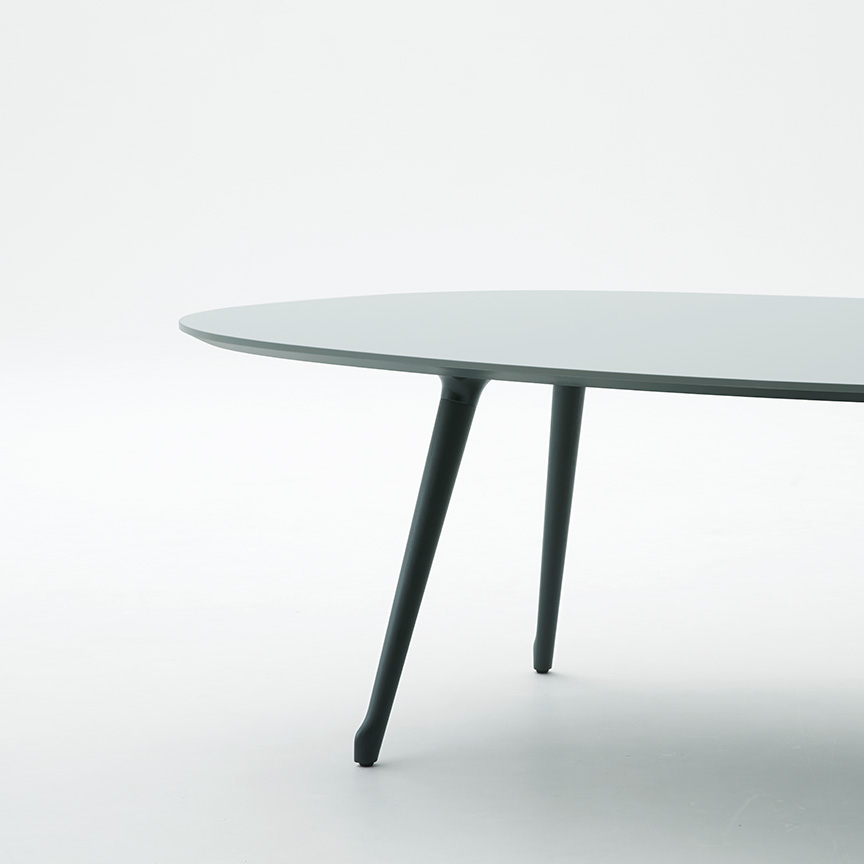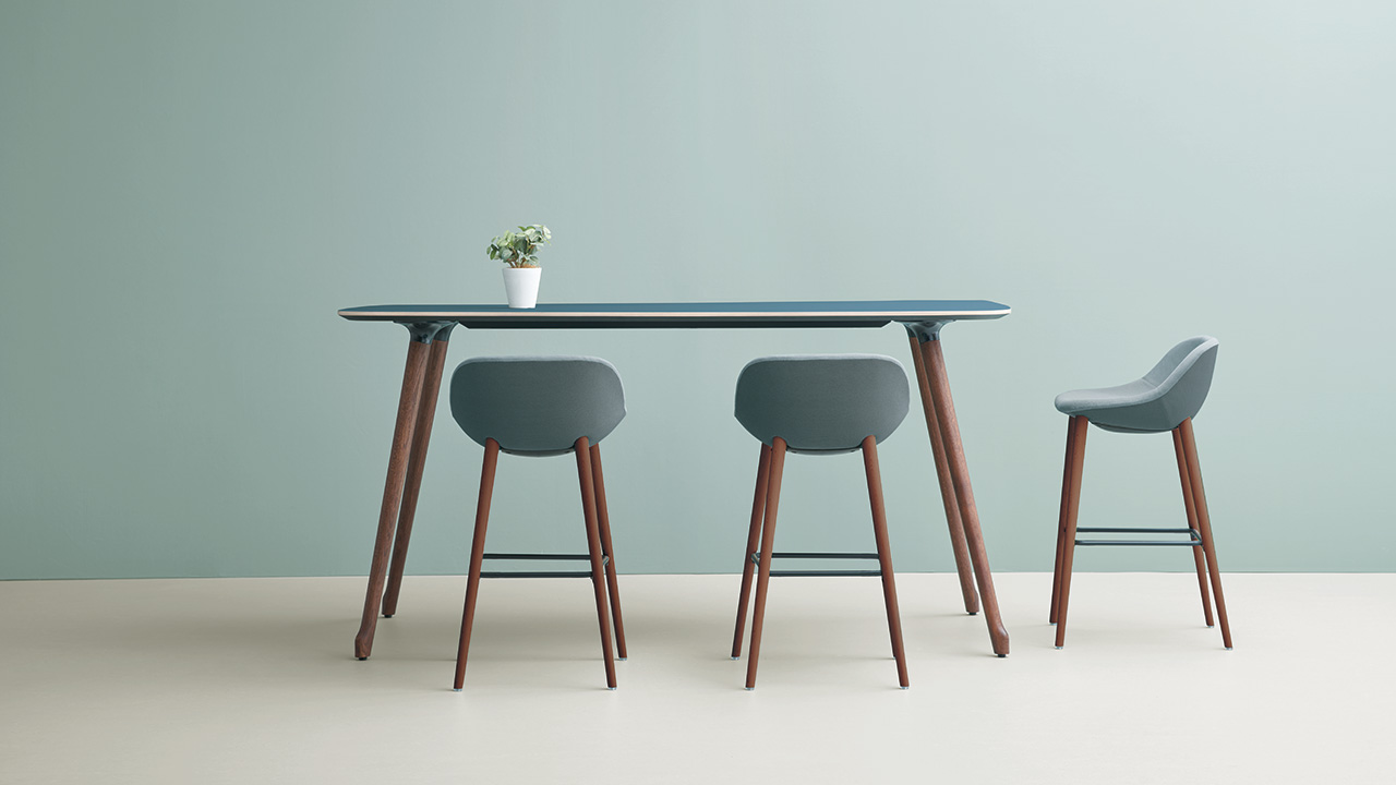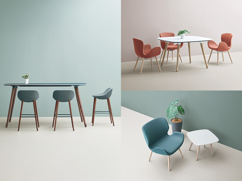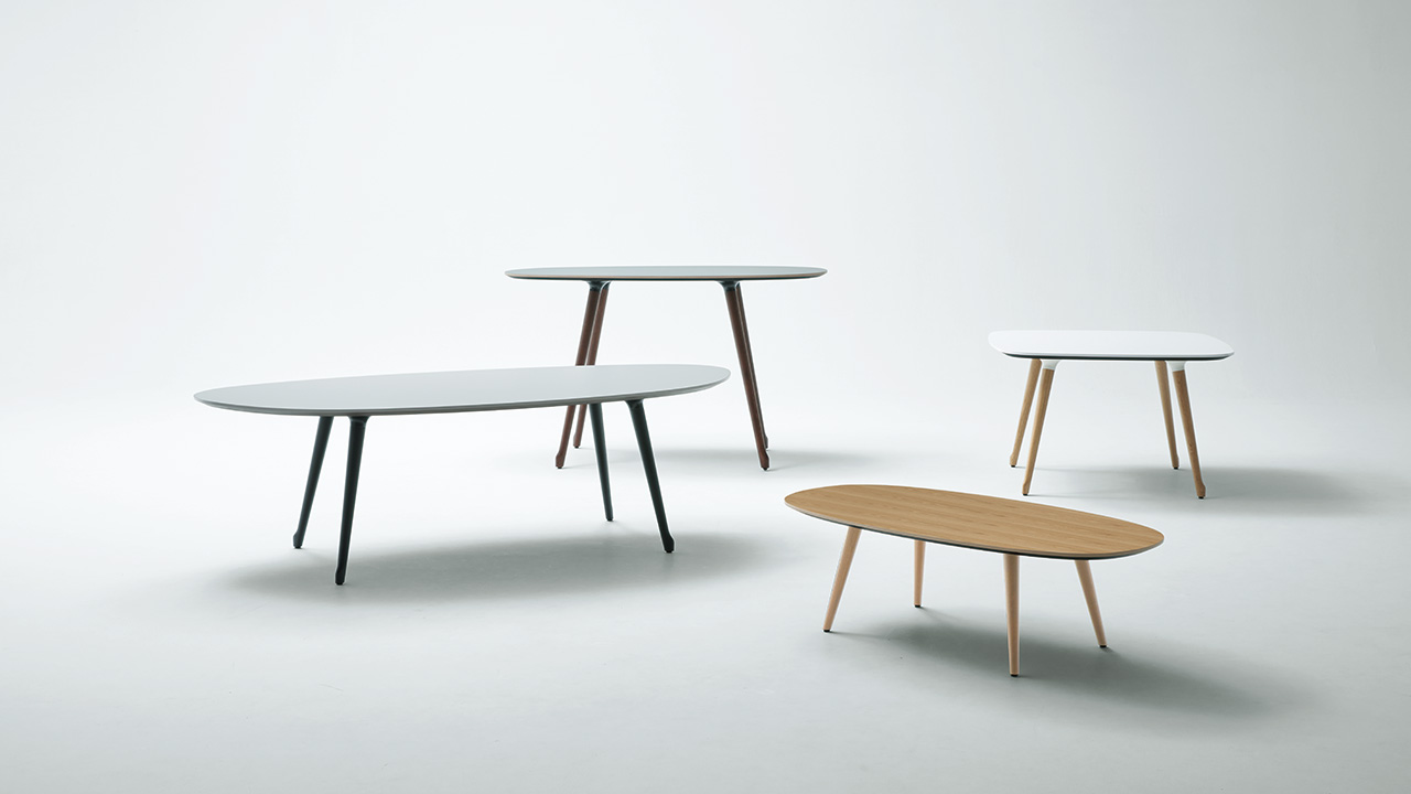 自然の中にあるような緩やかなカーブでデザインされたテーブルは、4種類の高さと6種類の天板形状からお選び頂けます。また厳選されたカラーバリエーションから選べる突板、メラミン、リノリウムの天板と、4 色の木脚カラーを組み合わせ、美しい空間をつくりあげることができます。