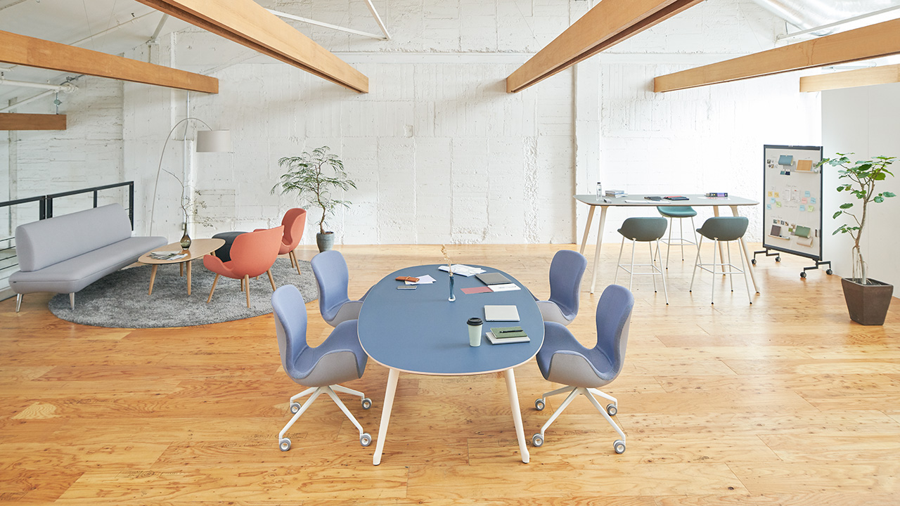 豊富なラインナップでコミュニケーションのスタイルに合わせた空間を実現します。ハイテーブルとハイスツールはタッチダウンミーティングに最適です。小型テーブルに木脚チェアを組み合わせて温かみのあるカフェスタイルのミーティングコーナーを、ラウンジチェアとローテブルの組合せは気分を変えて働くことができるワークラウンジエリアを仕立てることが可能です。