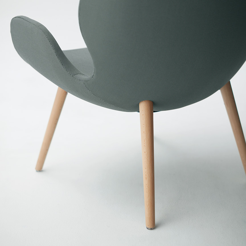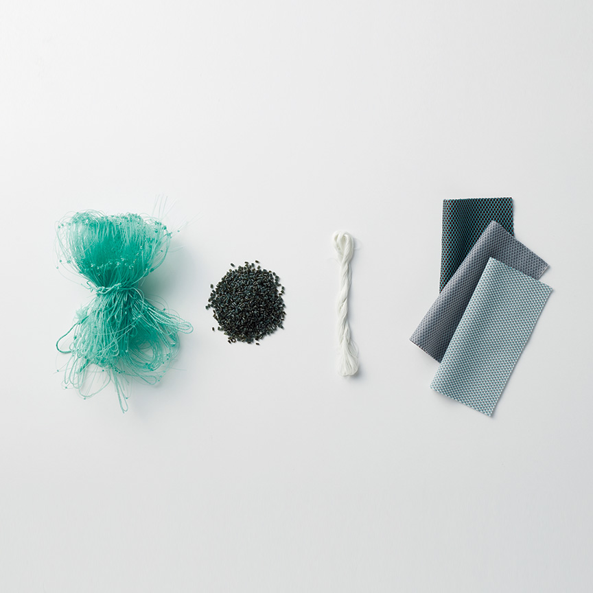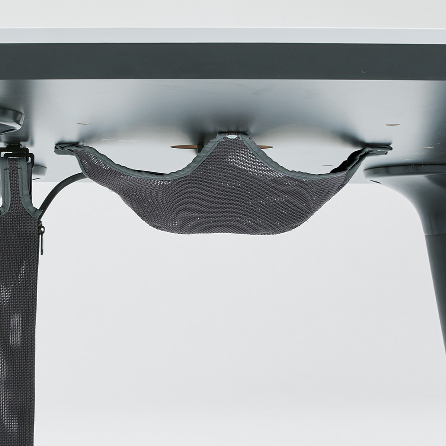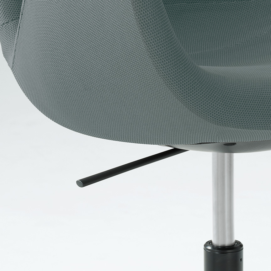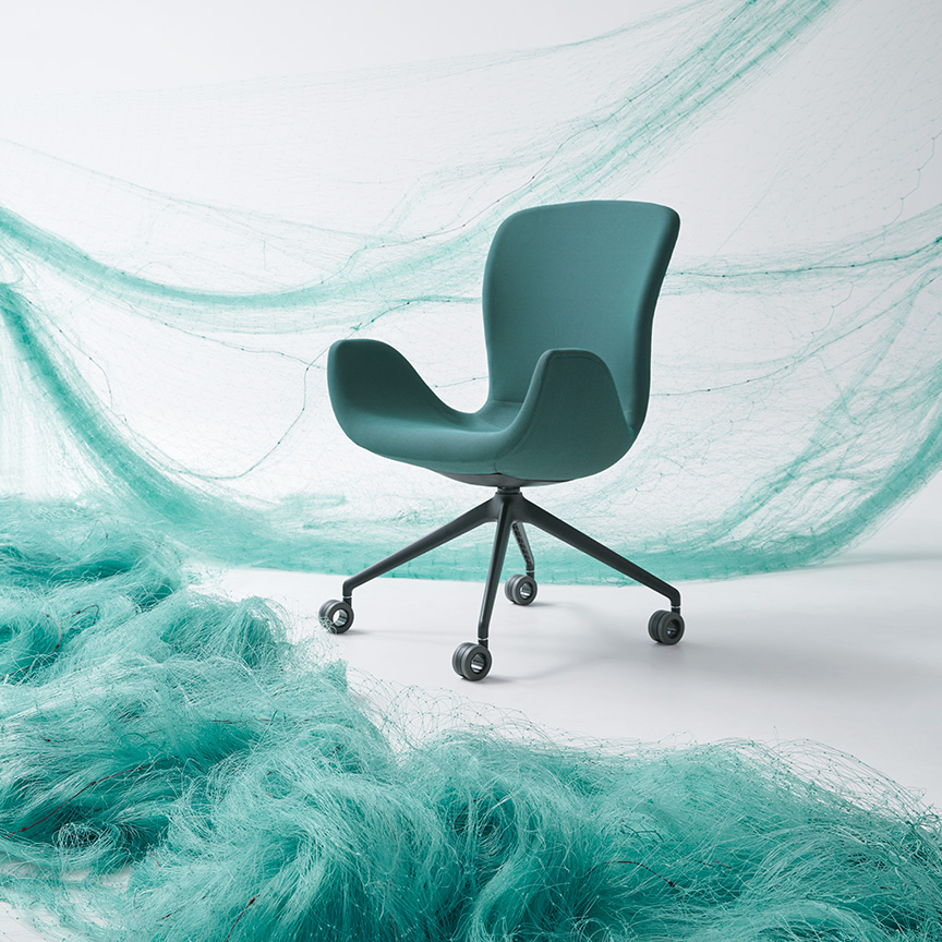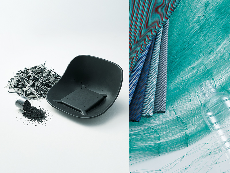 全ての部材は環境への影響を考慮して、選定・設計されています。チェアのインナーシェルには、CO2排出量を削減するために、100%再生ポリプロピレン樹脂を使用しています。また近年では、海洋ごみが海洋生態系のバランスを崩し、大きな問題となっています。オカムラが開発したサステナブルなファブリック「Re:net(リネット)」は、使用済み漁網をリサイクルした再生ナイロン「REAMIDE(リアミド)」の糸と、再生PET 糸を編み込んだニットです。