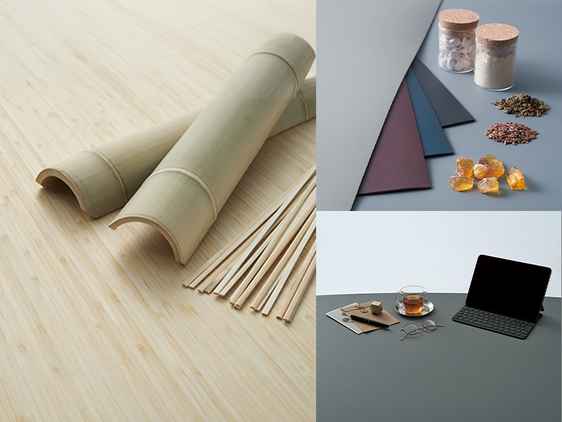 天板の表面材には、環境素材として着目されている竹を採用しました。竹は、一般的な針葉樹に比べて約20倍もの早さで成長し、環境負荷の少ない素材といわれています。天然素材から出来たリノリウムも品揃え。製造時に100%クリーンエネルギーを使用し、カーボンニュートラルを実現しています。