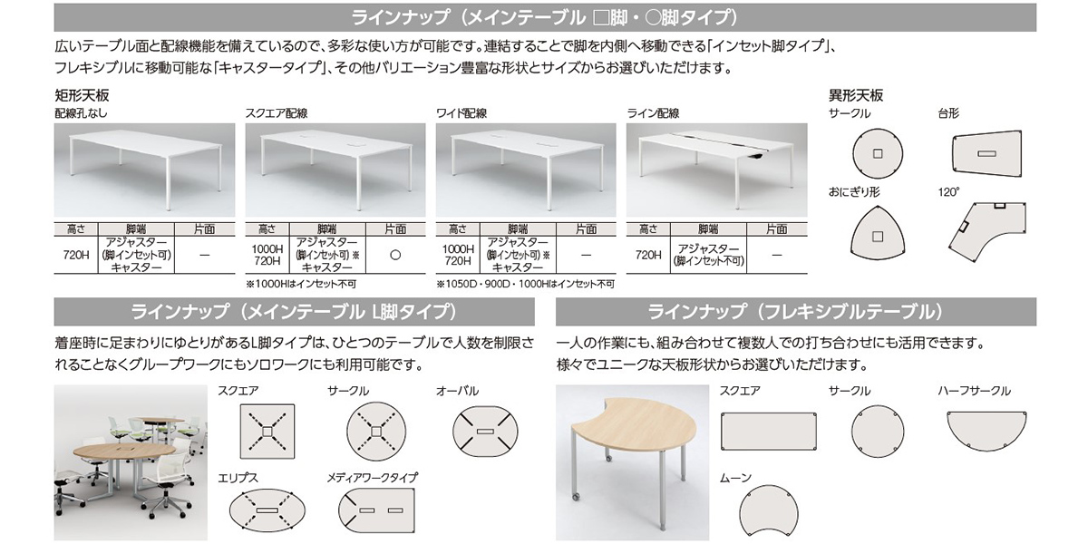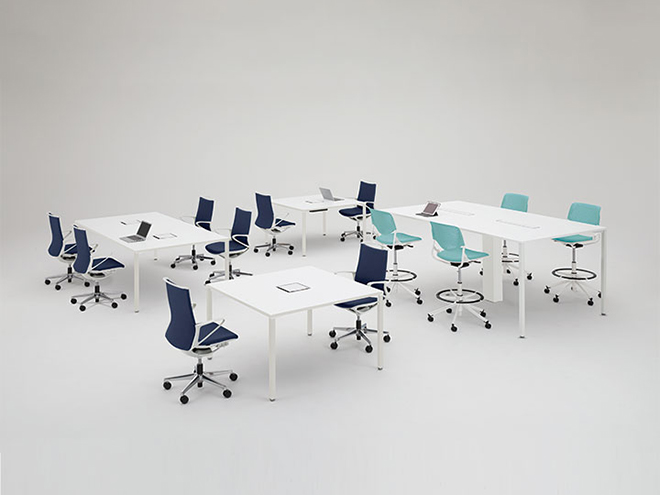 半円形状なので、対面でもオンラインでも、参加者全員の顔を見渡しやすく、ハイブリッド会議におすすめです。1on1テーブルとしてもお使いいただけます。