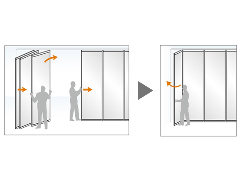 セッティング時、最後のパネルには小扉が付いています。折りたたまれた小扉を開くと、壁とパネルがフ ィット。煩わしい道具などを使うことなく、セッティングが完了します。※小扉付パネルは、出入り口として使用しないでください。