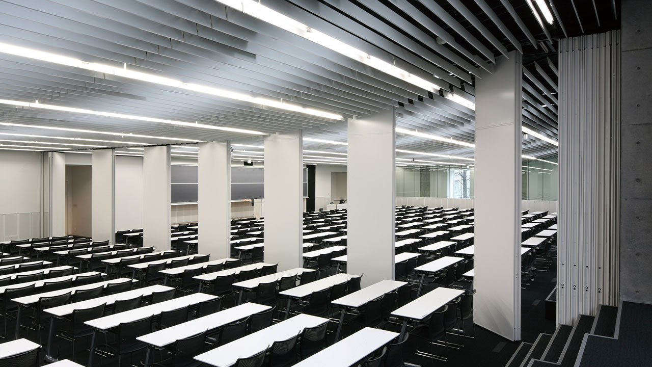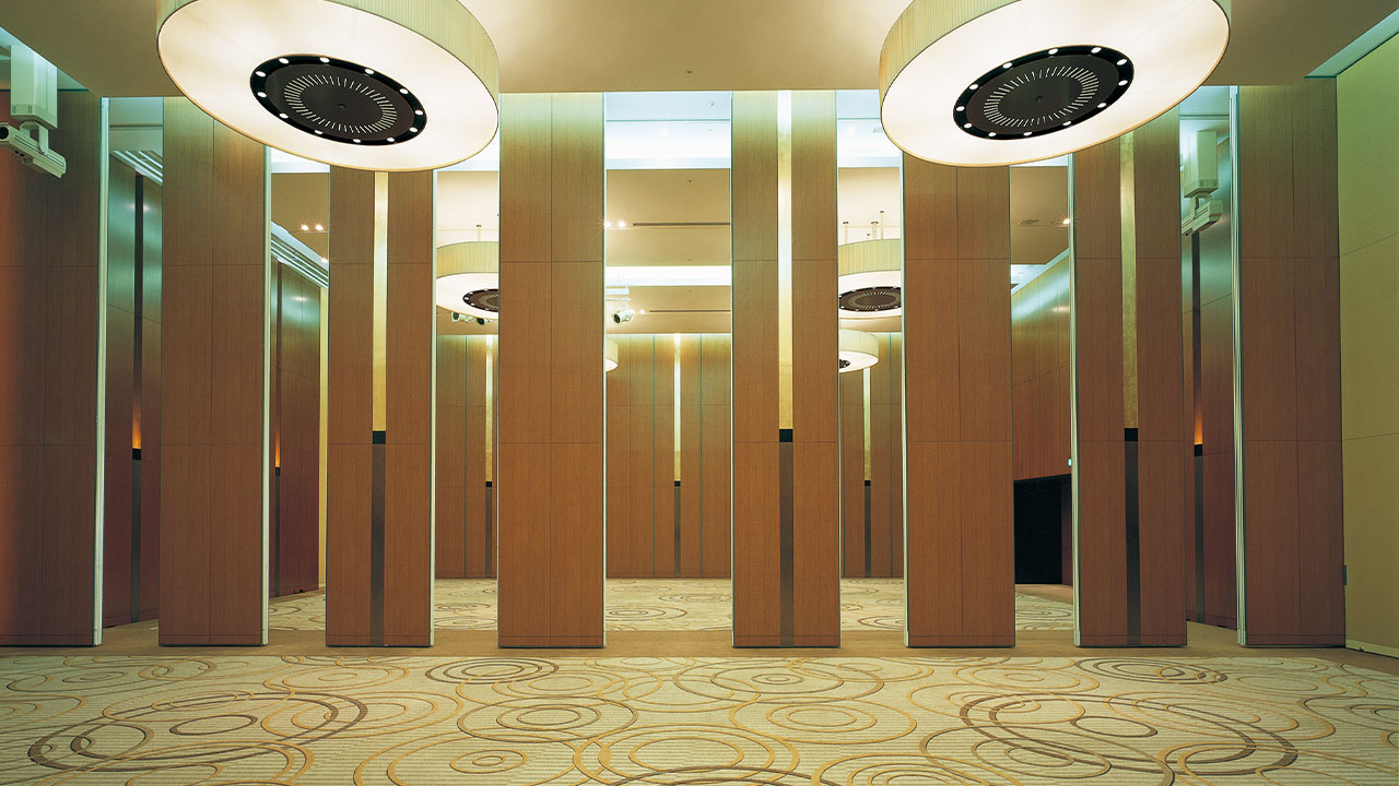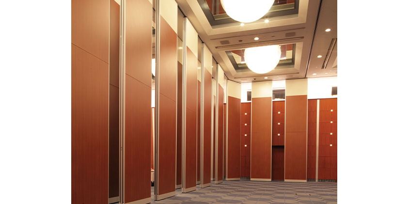 隙間をシャットアウトするダイナミックフィレット機構と特殊遮音構造で高い遮音性能を実現しました。ダイナウォール1重で遮音性能Dr-40~50を実現できる画期的な移動間仕切です。