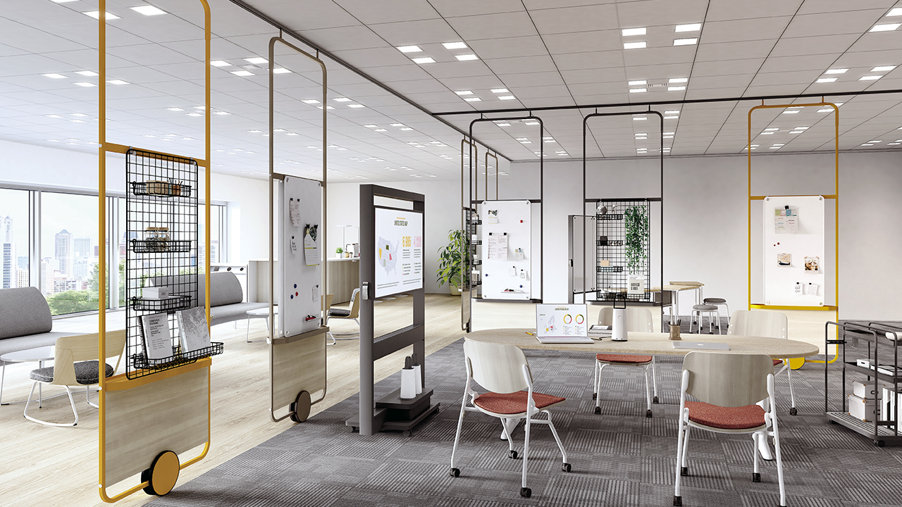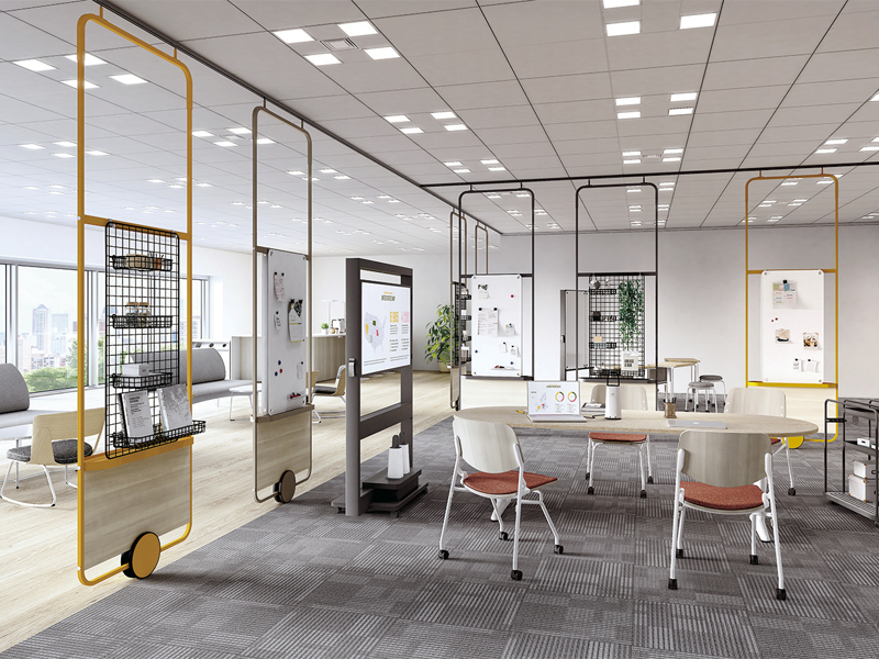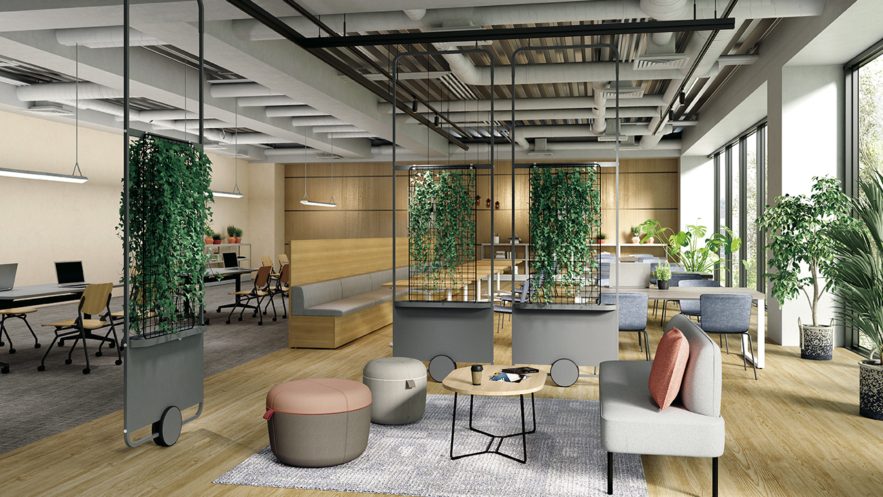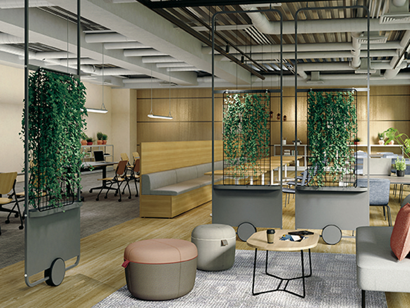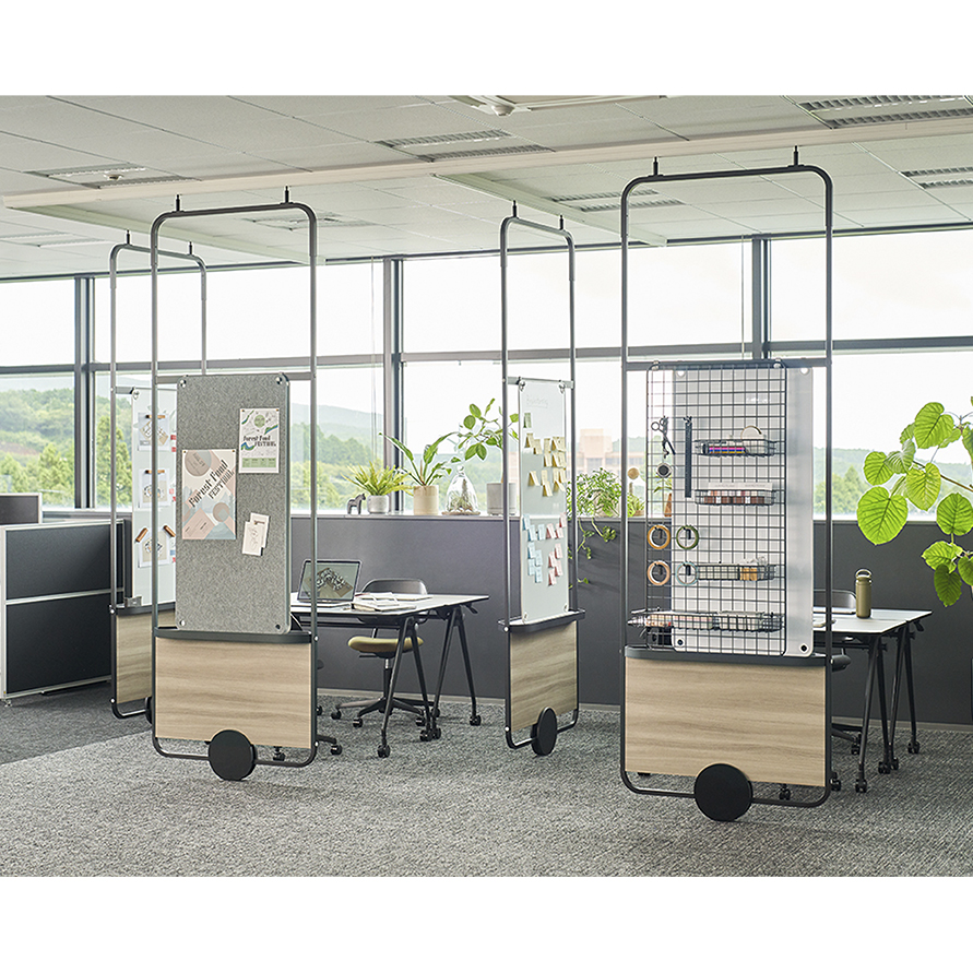 ゆったりと落ち着いた空間で肩の力を抜きながら働きたい時や、上質感が漂う落着いた空間で大切なお客様をお迎えしたい時に、グリーンパネルでさりげなく空間を仕切ってはいかがでしょうか。必要な時に必要な場所にパネルを移動し、安らぎの空間を創出できます。