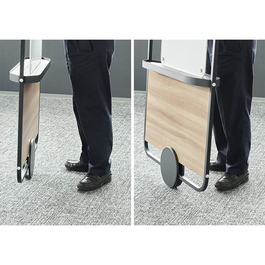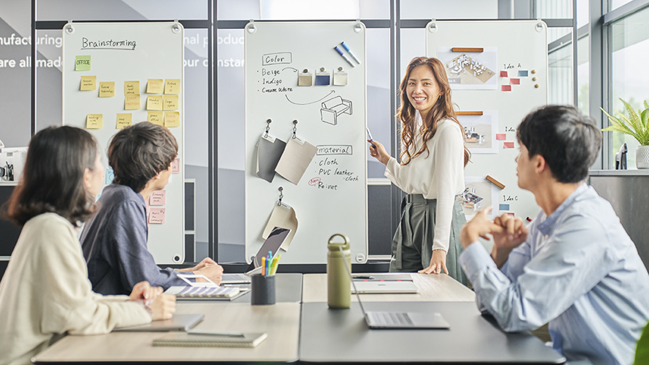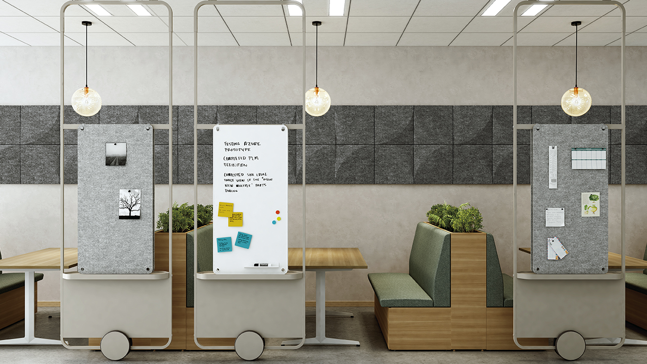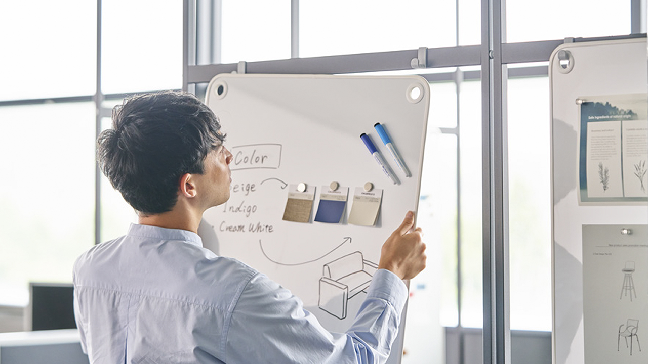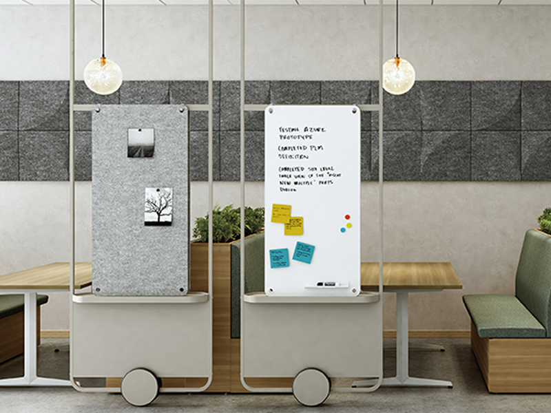 スライドパネルならば、まるで引き戸のように使うこともできるので、オープンエリアでもソファブースとの組み合わせでプライベート感のあるミーティングエリアを設けることができます。またアタッチメント取付け用スライドパネルなら、ホワイトボードでアイデアをまとめたり、フェルトボードで視線や音を和らげることもできます。