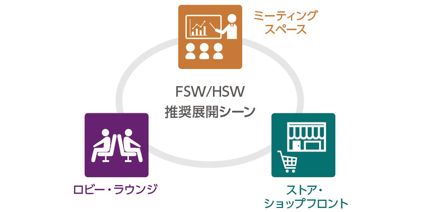 FSW/HSWは、密閉空間を避けたミーティングスペースの確保、開放的なロビー空間、また店舗の入口周辺などに導入すると、スピーディーかつ見通しのよい空間が構築できます。