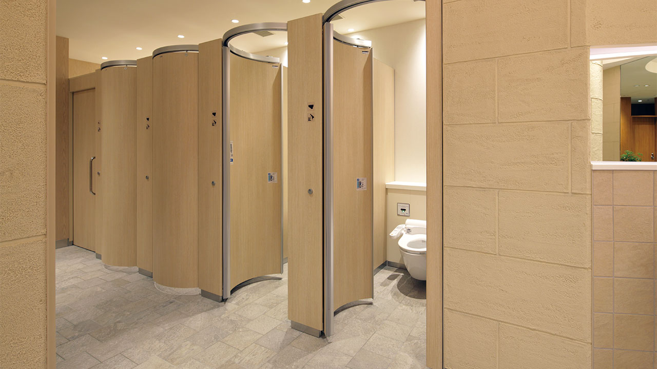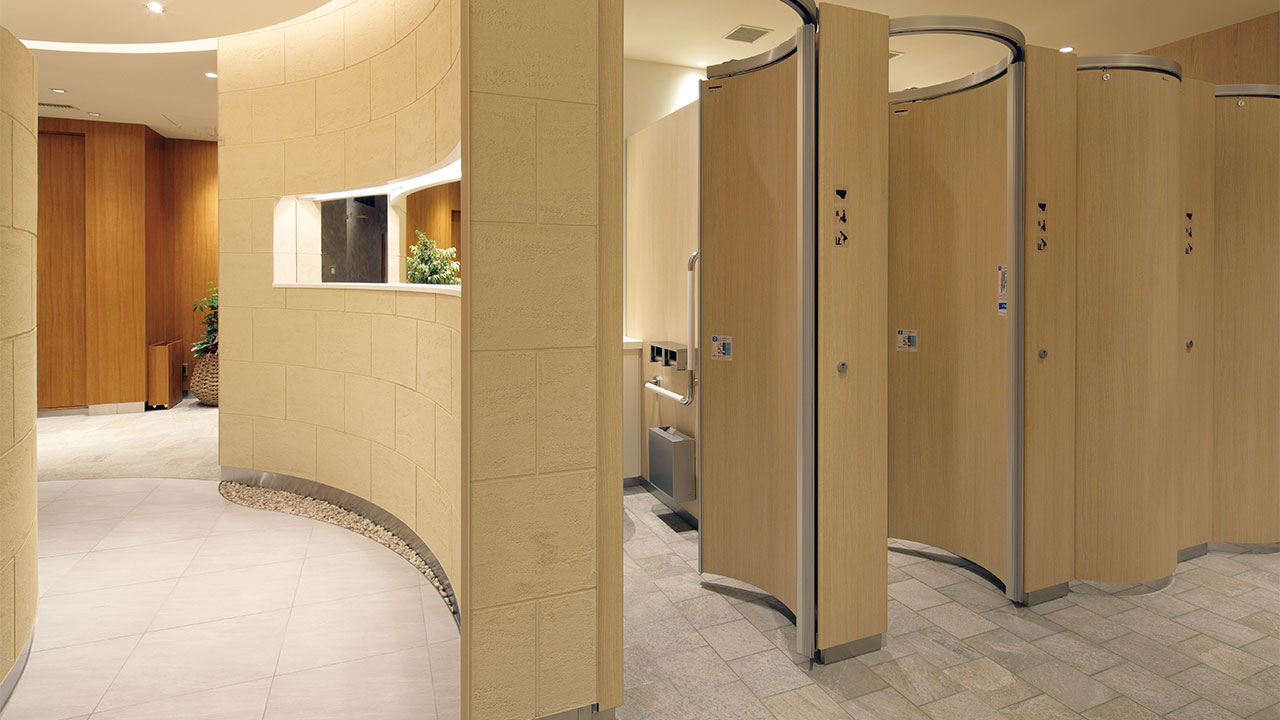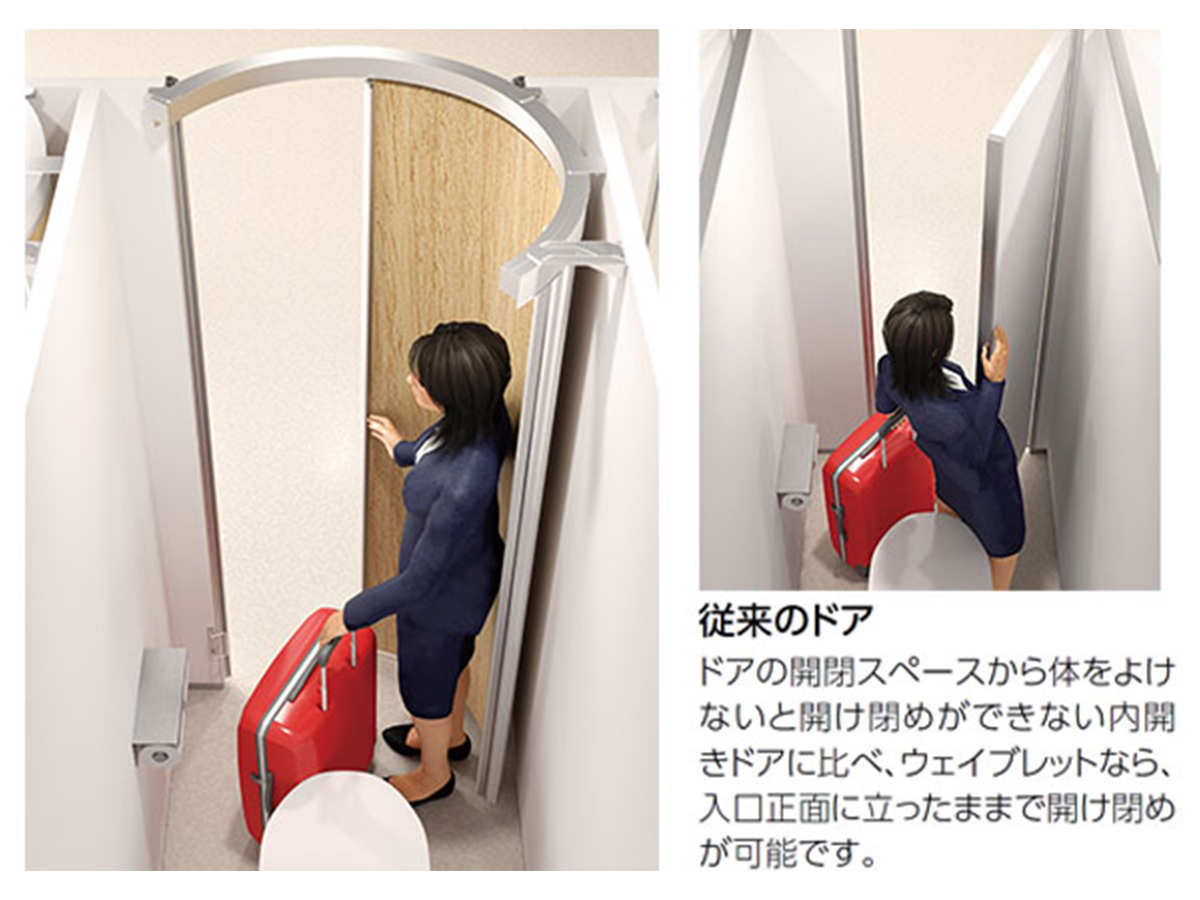 間口900×奥行き1000mmのような和式トイレのブースでも円周上をスライドするドアは洋式便器に当たらず開閉が可能。公共施設や公立の学校など和式トイレの洋式化改修に最適なトイレブースです。