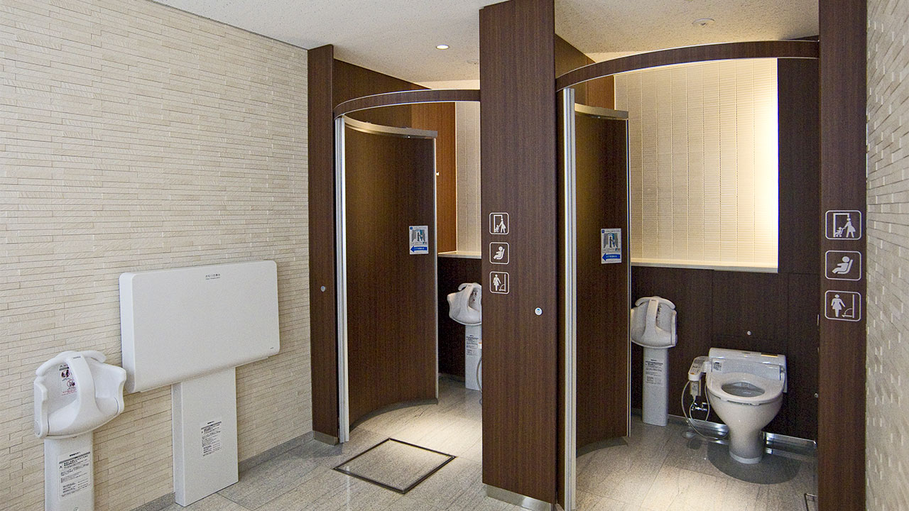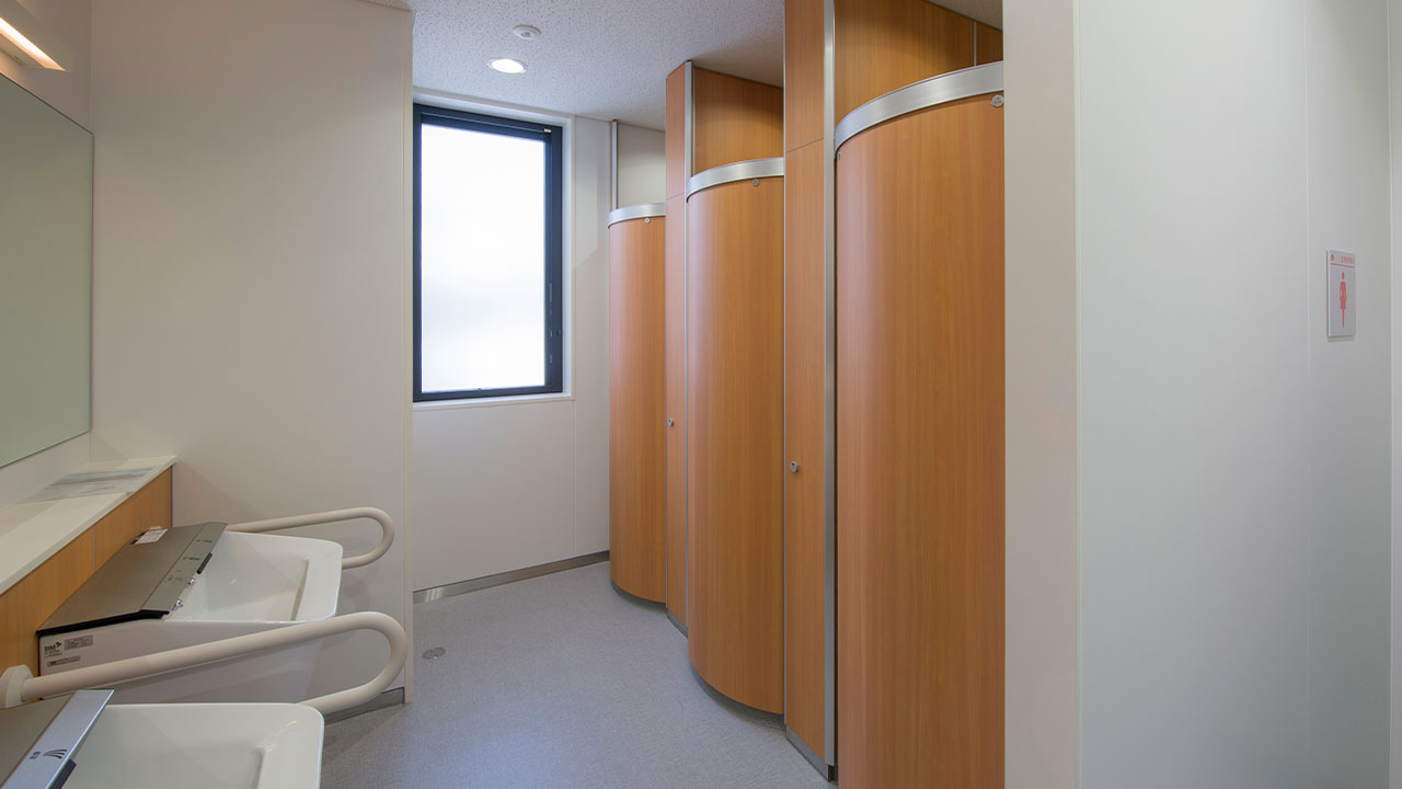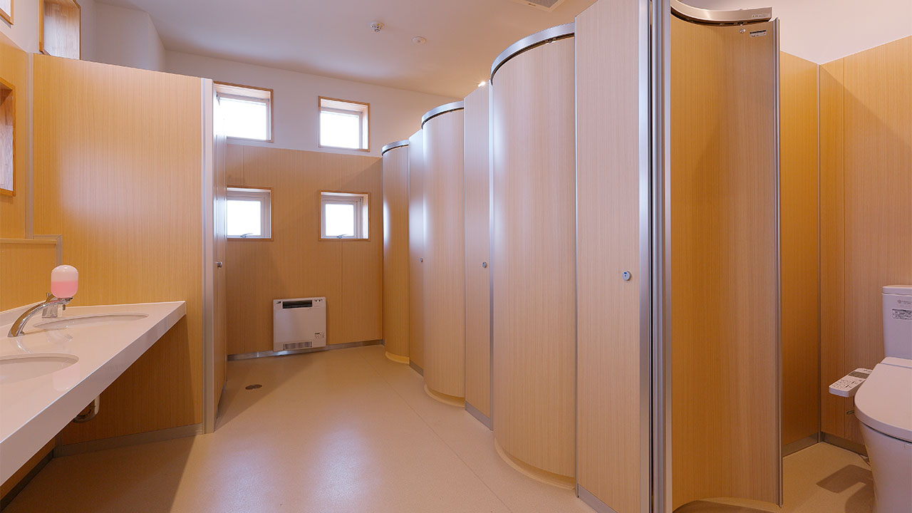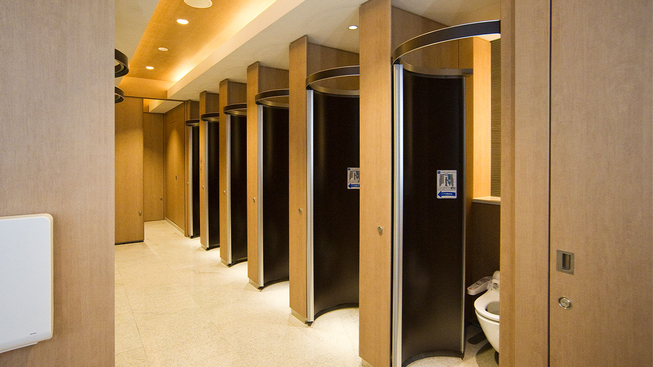 間口900×奥行き1000mmのような和式トイレのブースでも円周上をスライドするドアは洋式便器に当たらず開閉が可能。公共施設や公立の学校など和式トイレの洋式化改修に最適なトイレブースです。