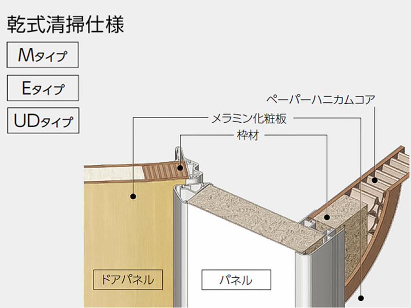 耐水合板をパネルの枠材に使用することで、ホース等による水掛け清掃に対応。清掃時のパネルの含水膨張を防止します。湿式清掃仕様の価格は、乾式清掃仕様の約1.4倍になります。
