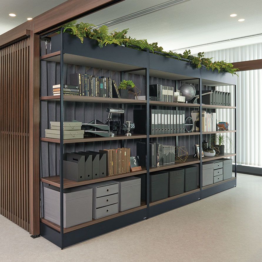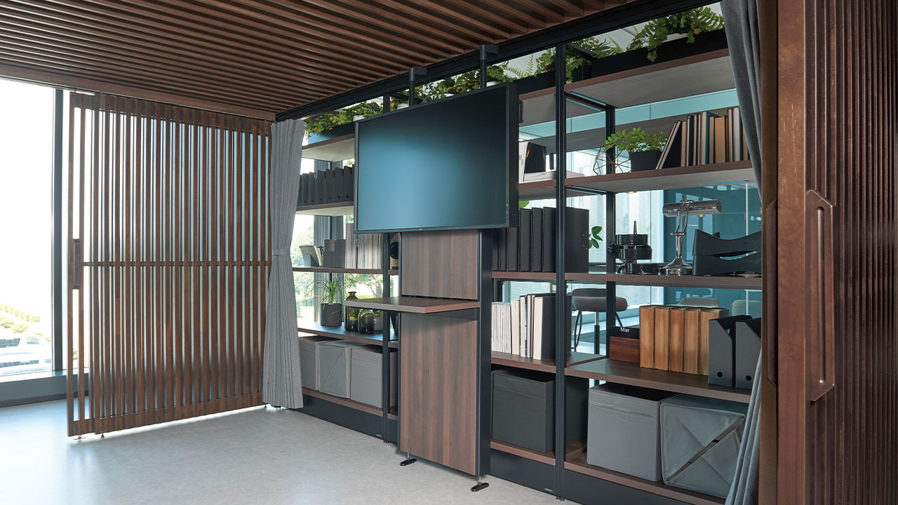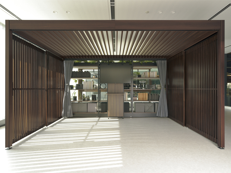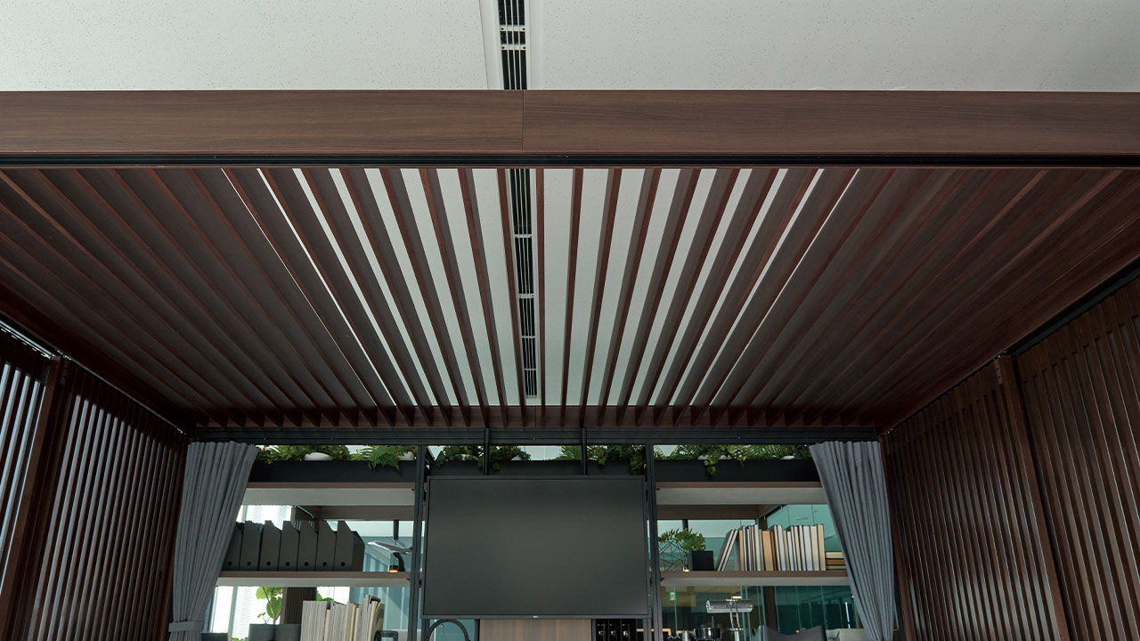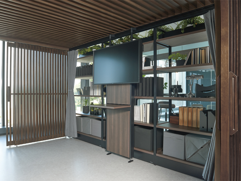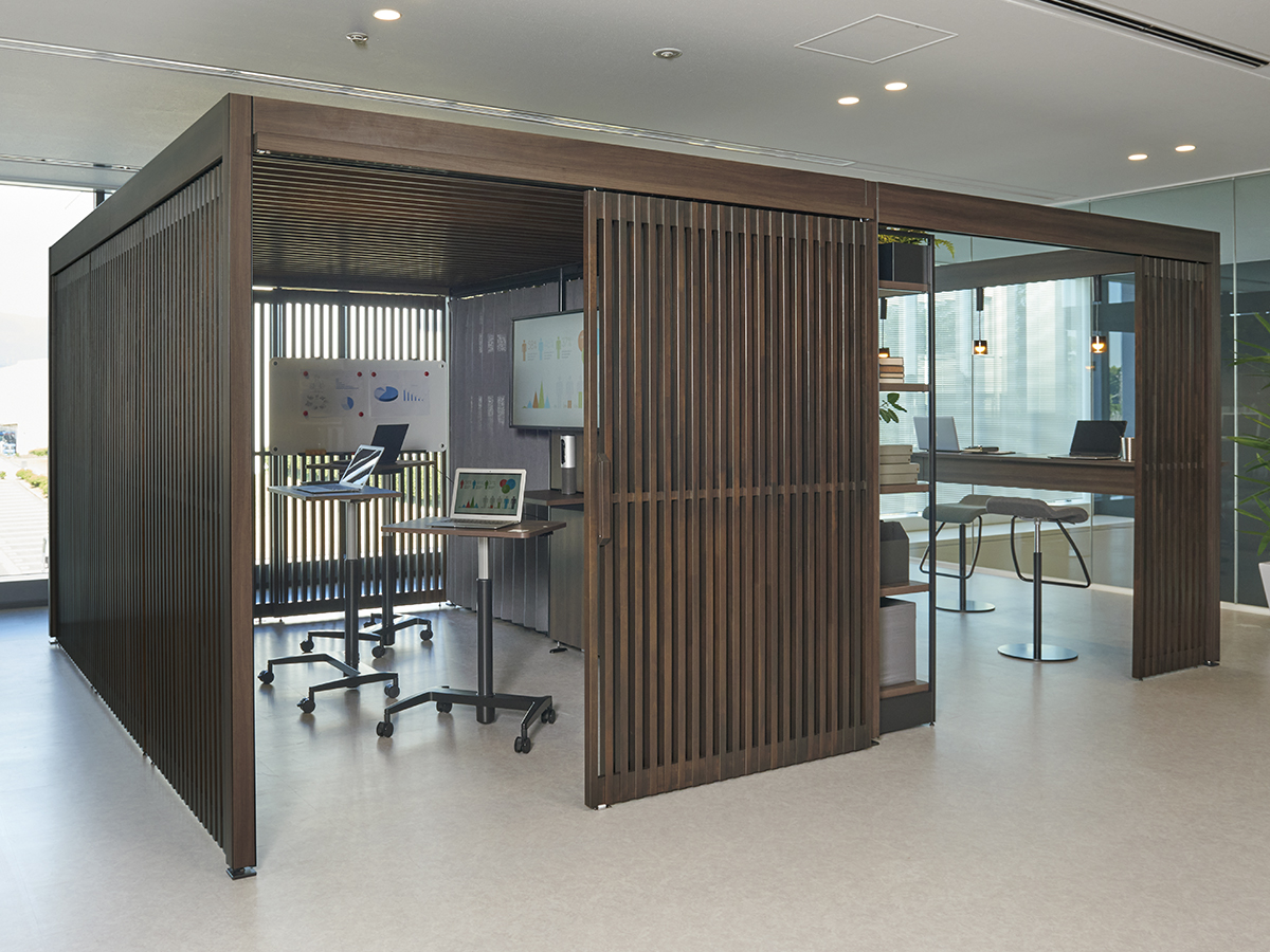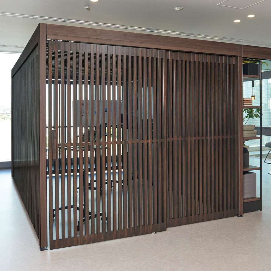 アルミ製のビーム・支柱に木質仕上げのフレームカバーを取付け、やさしい木のぬくもりを感じる空間をつくります。同じ色仕様の天井ルーバーやマルチウォール、メラミンカウンターをはじめとする、豊富なオプションで、用途、機能、好みに合わせた空間を設えることができます。