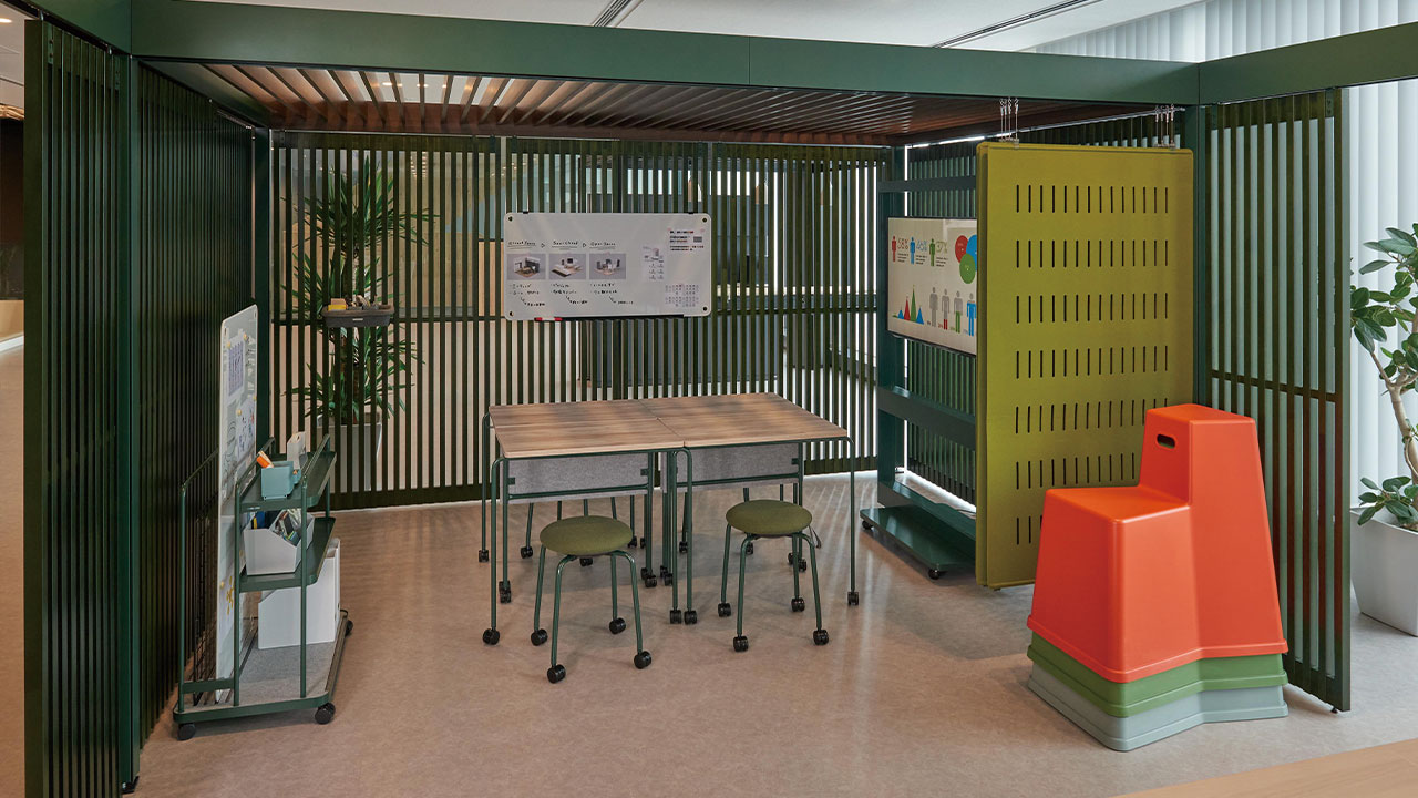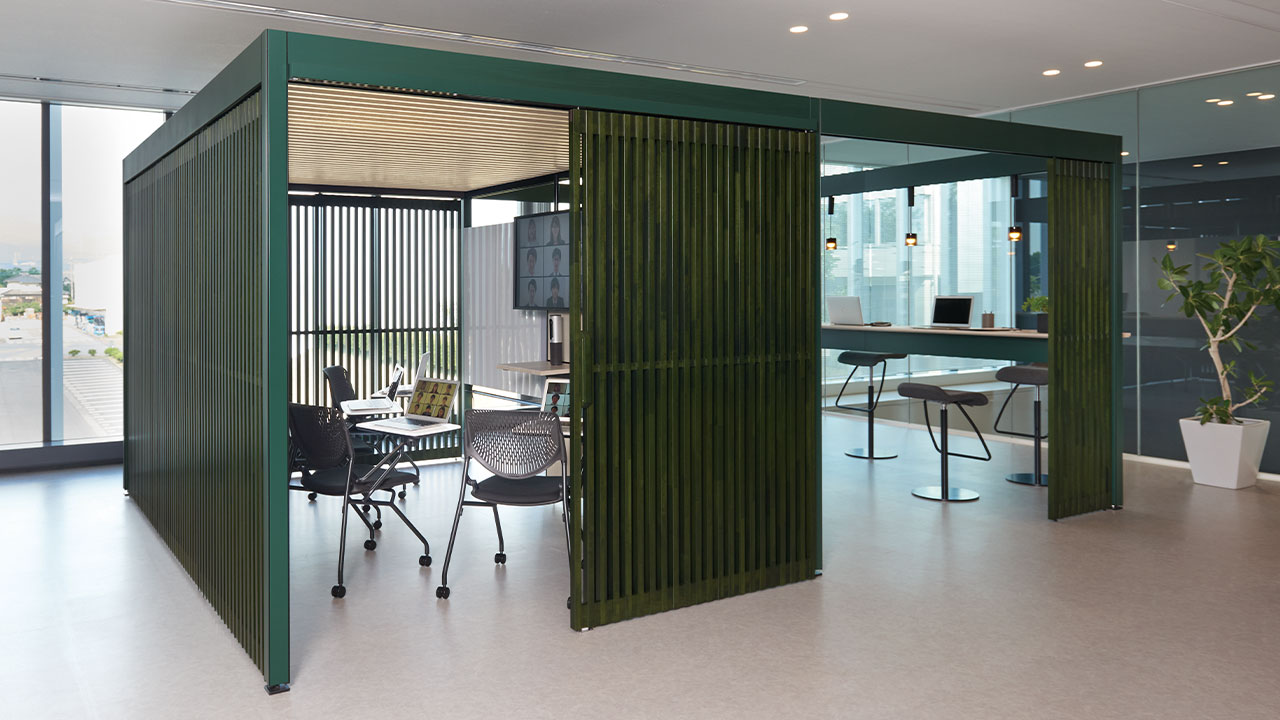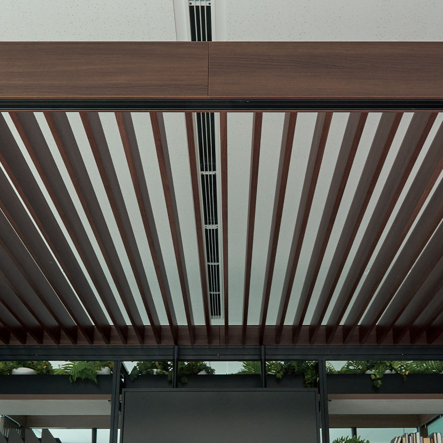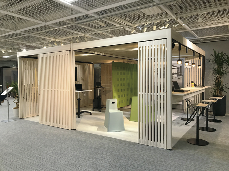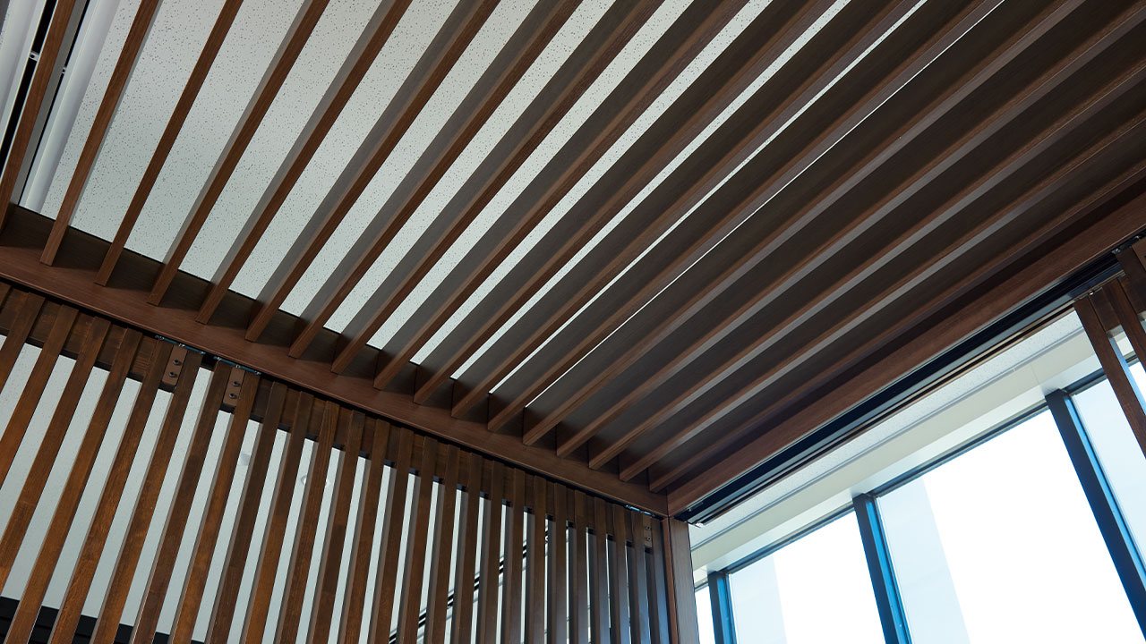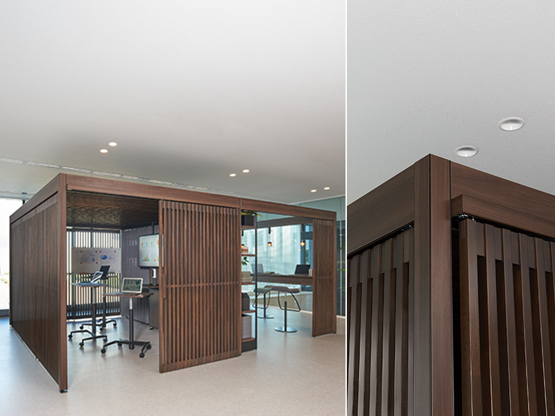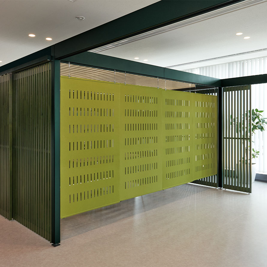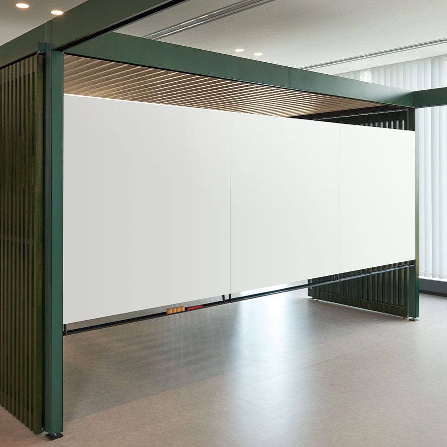 アルミ製のビーム・支柱に木質仕上げのフレームカバーを取付け、やさしい木のぬくもりを感じる空間をつくります。同じ色仕様の天井ルーバーやマルチウォール、メラミンカウンターをはじめとする、豊富なオプションで、用途、機能、好みに合わせた空間を設えることができます。