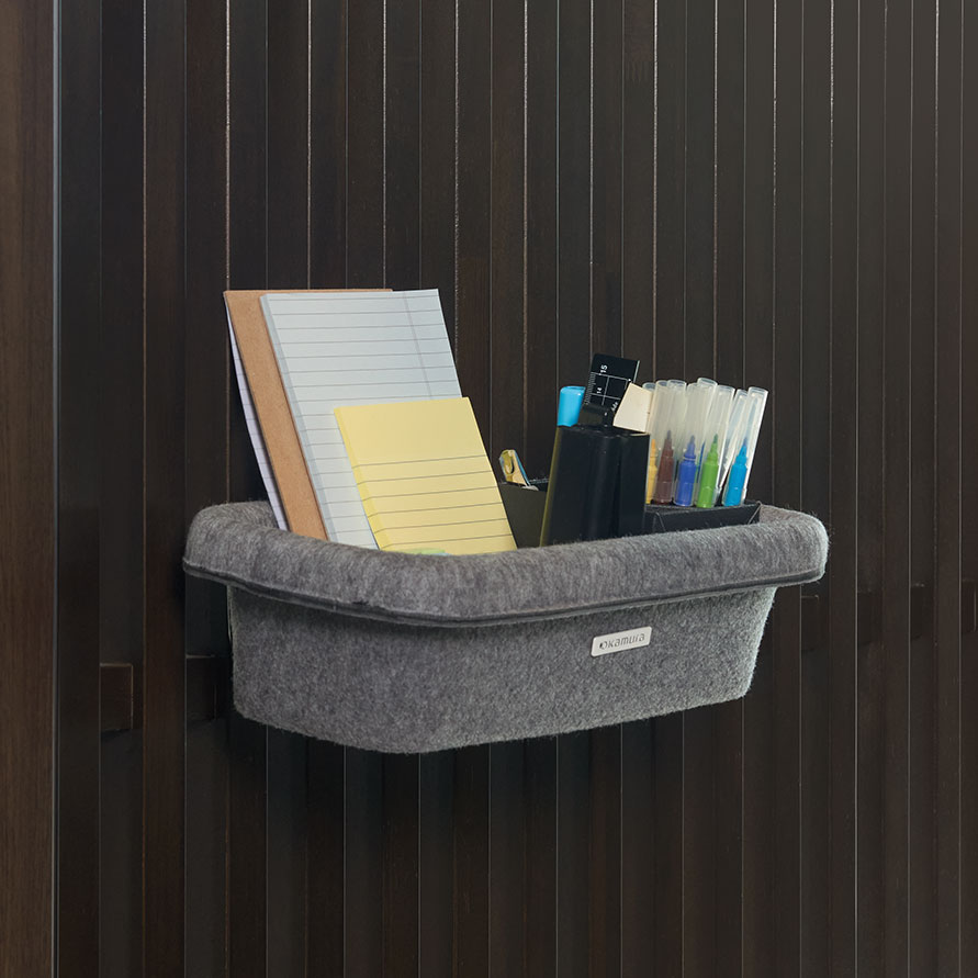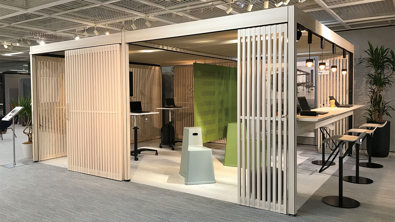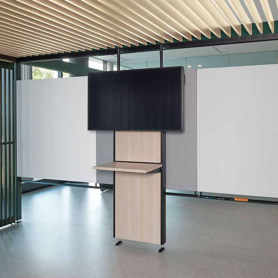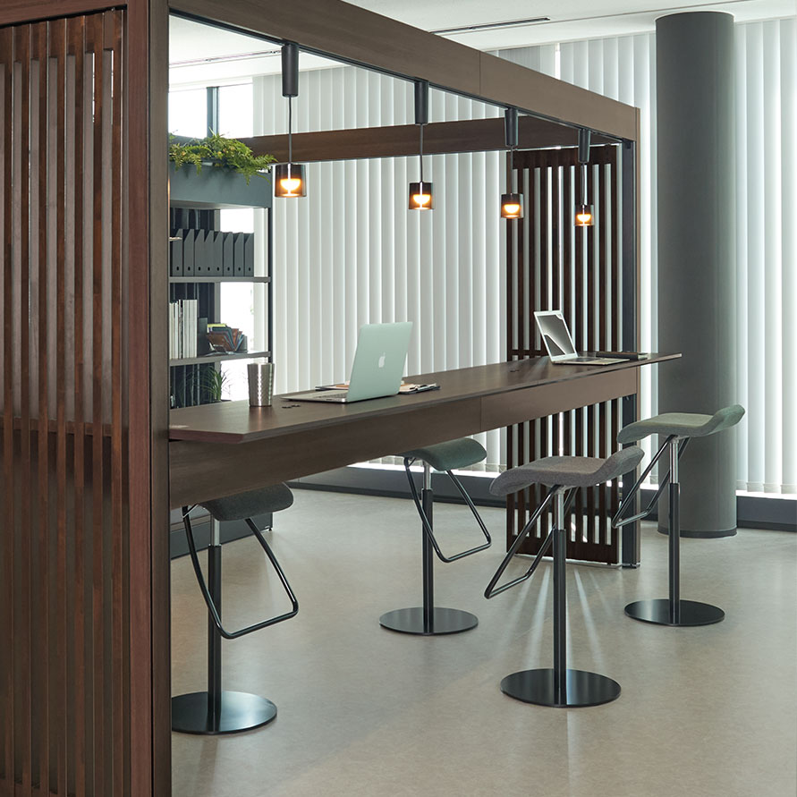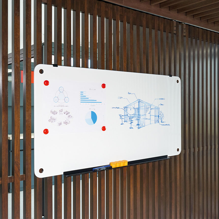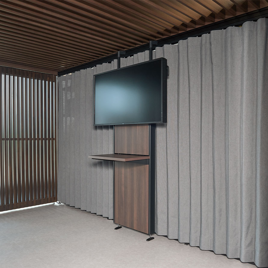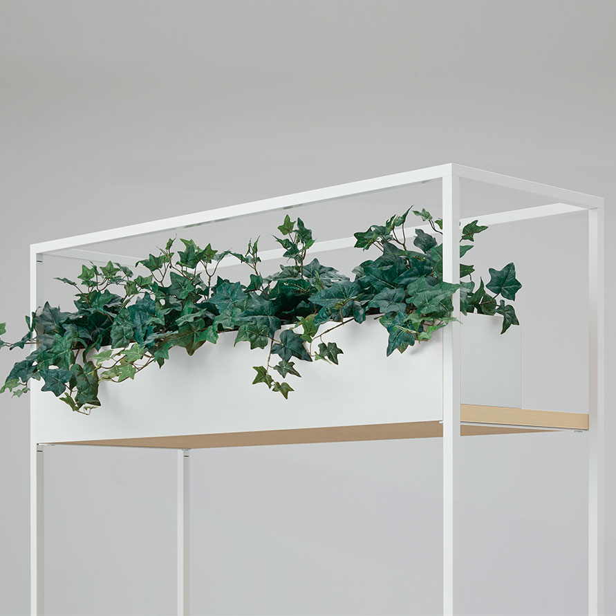 アルミ製のビーム・支柱に木質仕上げのフレームカバーを取付け、やさしい木のぬくもりを感じる空間をつくります。同じ色仕様の天井ルーバーやマルチウォール、メラミンカウンターをはじめとする、豊富なオプションで、用途、機能、好みに合わせた空間を設えることができます。