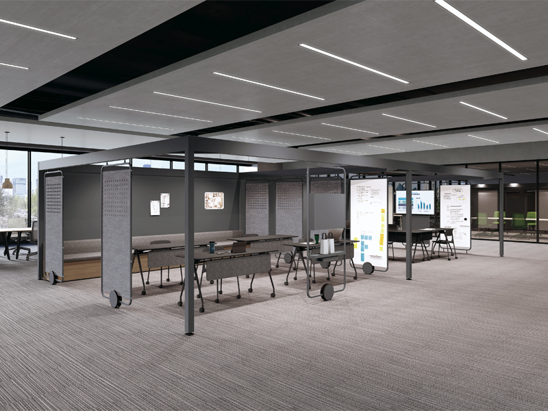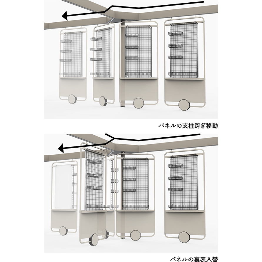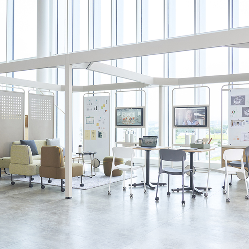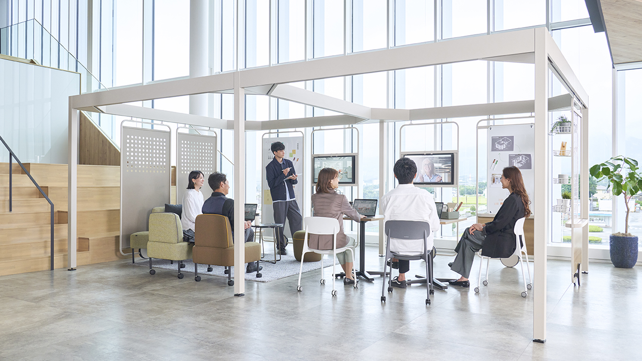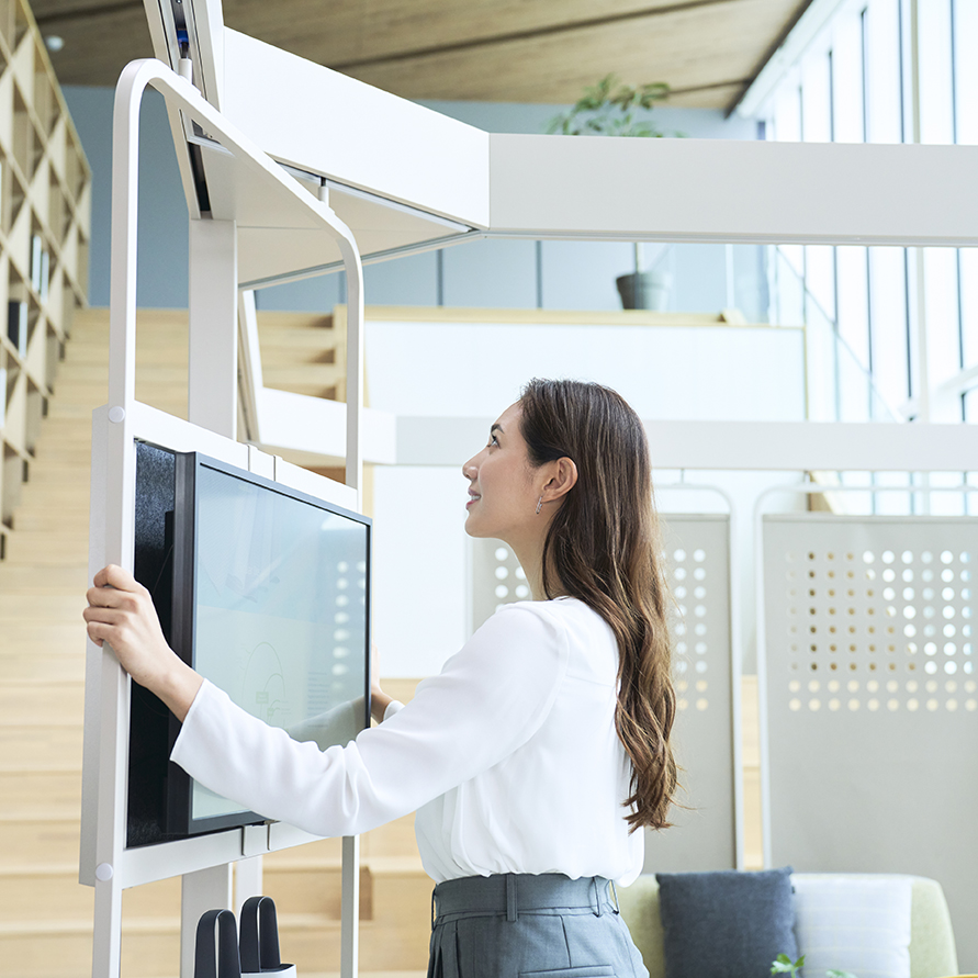 支柱を跨いで移動できるパネルには、バッテリーを搭載できるモニター付パネルやホワイドボード付パネルなどミ ーティングには欠かせない機能を搭載。キャスター付きの椅子やテーブルと合わせることで、会議の人数や作業内容に合わせて多目的に使えます。