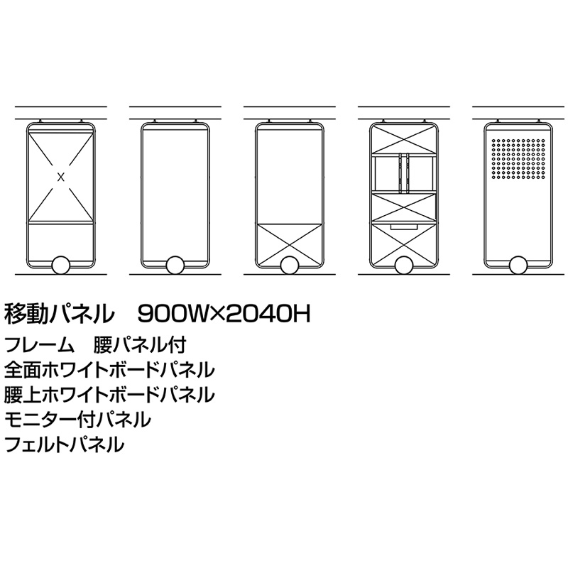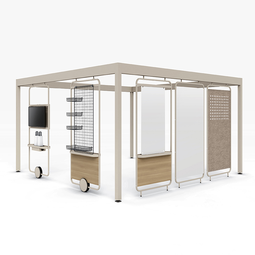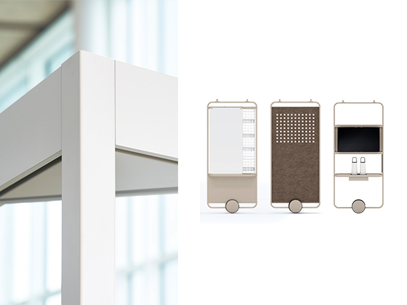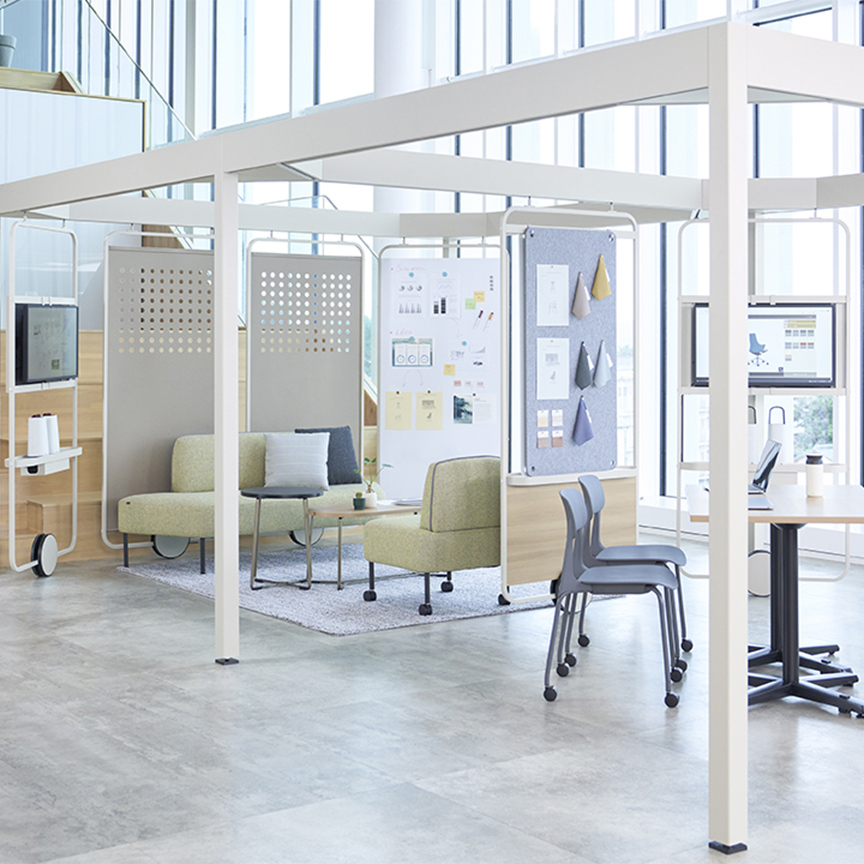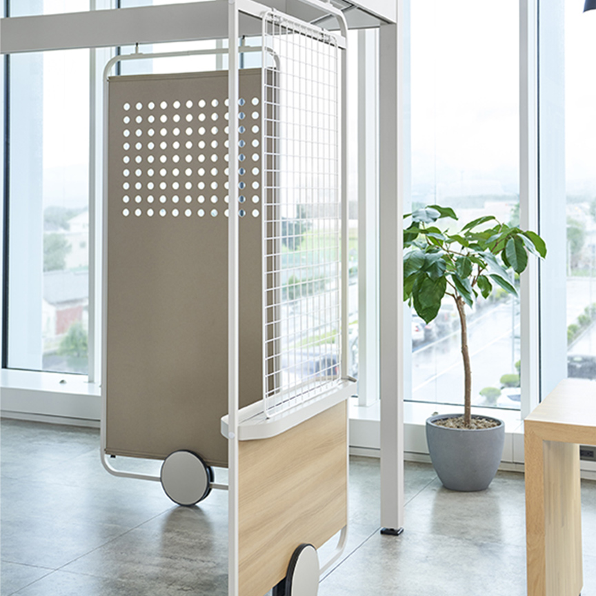 シンプルを極めたその美しい佇まいは、様々な空間にマッチします。フレームカラーは、空間に遊び心を与えるビビットなものから、落ち着いたものまで、目的や用途に合わせて設えることができます。パネルは移動パネルと固定パネルの2タイプ。それぞれ打合せに欠かせないホワイトボードパネルやモニター(OCバッテリー付)パネル、周囲の視線を遮るフェルトパネルやカーテン等をご用意しております。