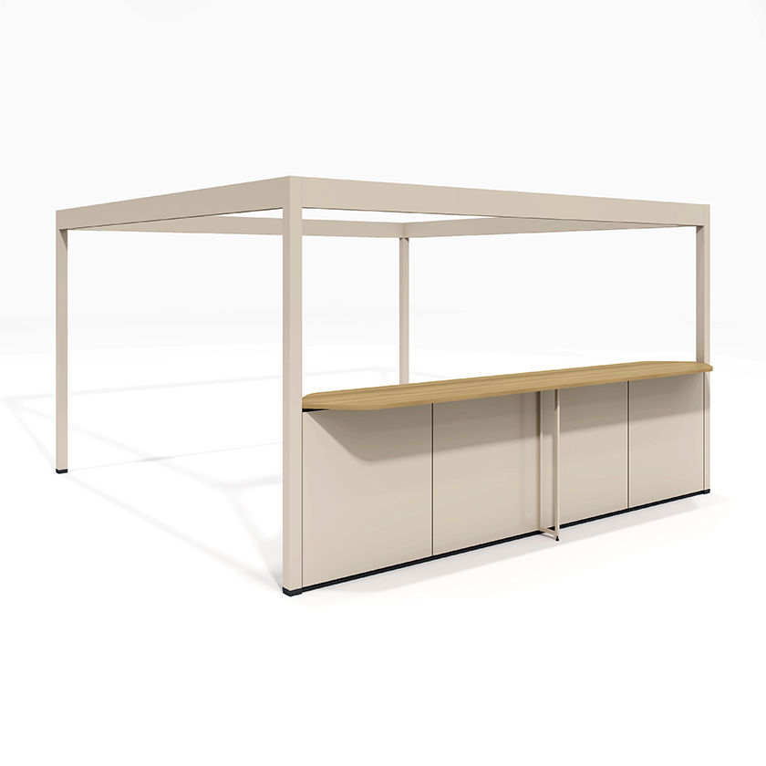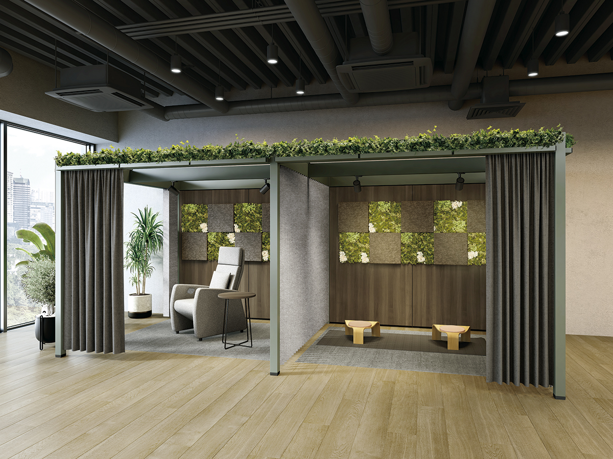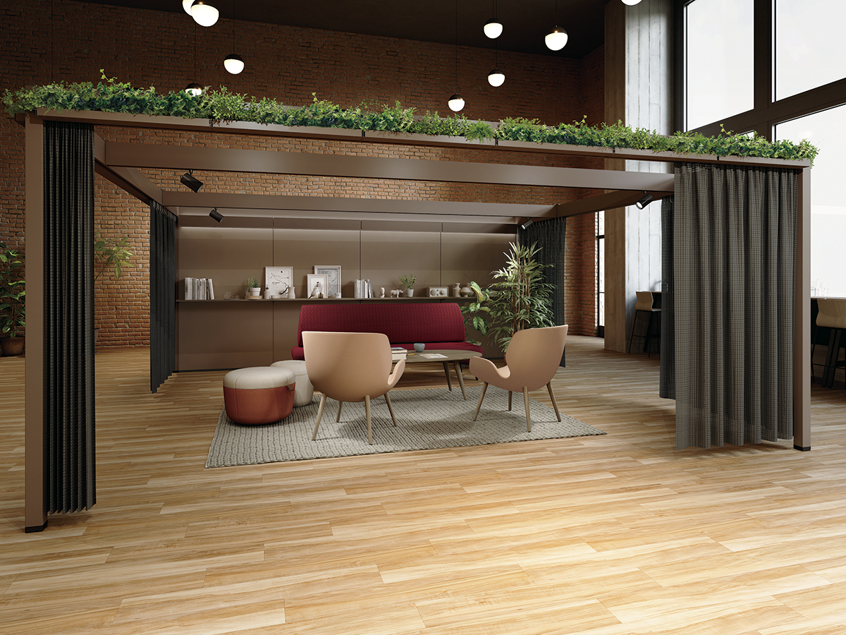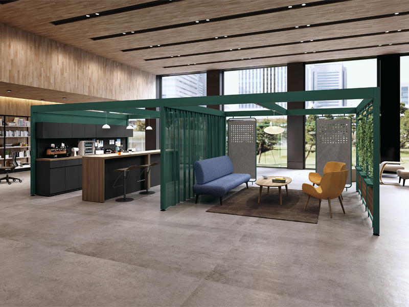 オカムラのカフェキャビネットやカウンターとモジュールを合わせたLives Post Beamなら、従来の様に壁際に限らず、執務エリアの中心でもカフェを設えることができます。ビーム部にはグリーンパネル、カーテン、ペンダントライトを取付ければ、よりリラックスした雰囲気を簡単に演出できます。ソファーやハイカウンターなどを合わせれば、インフォーマルコミュニケーションにも最適です。