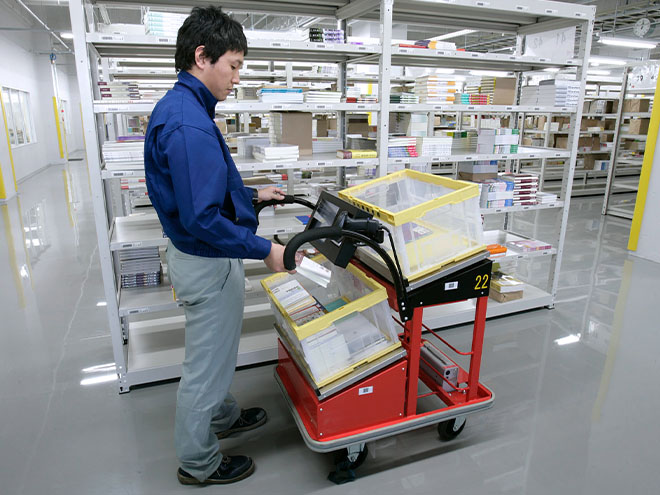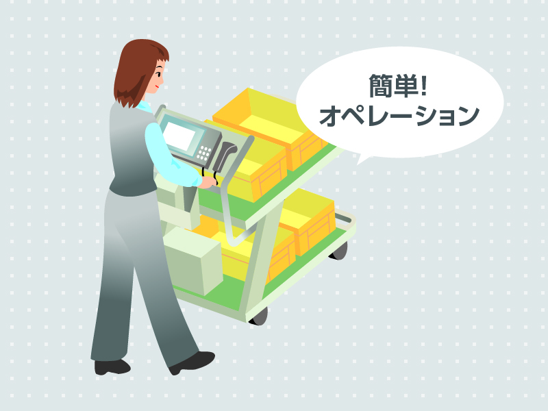 モバイルコンピュータを搭載したカートでピッキング作業者をナビゲート。ミスや無駄のない作業で効率化、合理化に貢献。