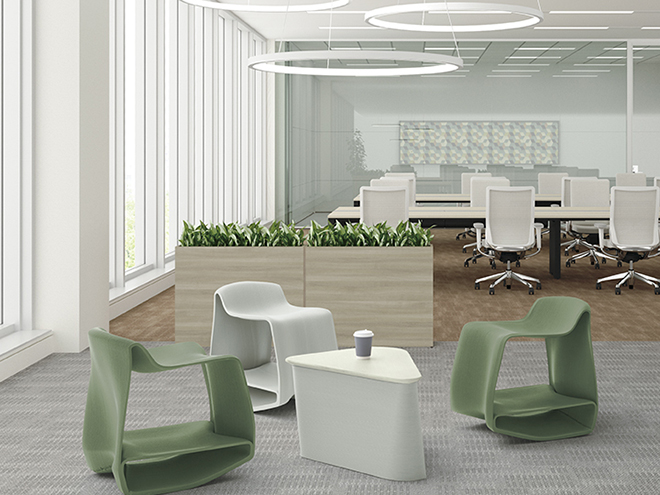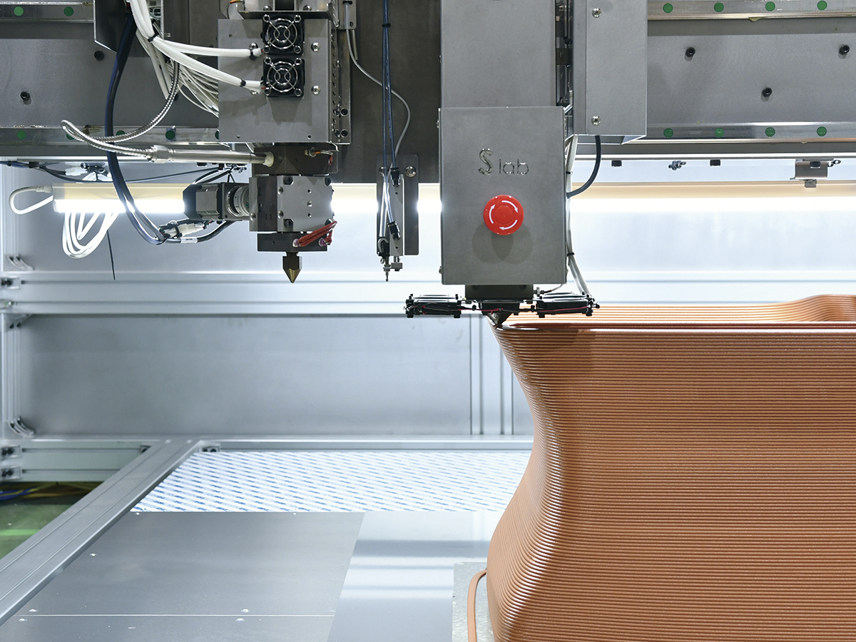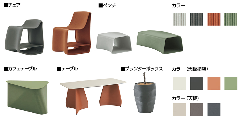 カフェテーブルは、ベース部を3Dプリンタにより製造しており、天板面は平らな木製天板です。曲線を多用した有機的なデザインが特徴です。テーブルは、アジャスター付のため床の不陸に合わせて高さ調整が可能です。