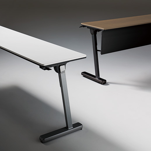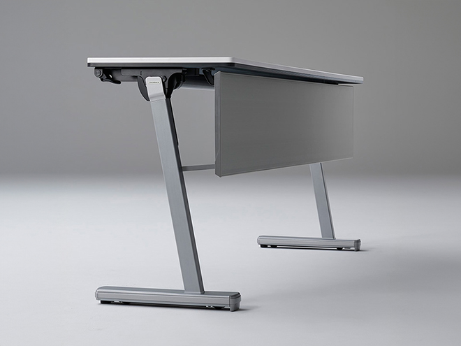 水平状態での固定と移動、跳ね上げての移動がスムーズに行えます。脚のストッパー操作の煩わしさがなく、シーンに応じたレイアウト変更が簡単にできます。(レバーは右側に一か所付いています。)