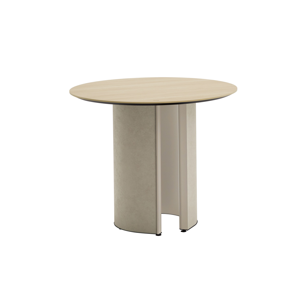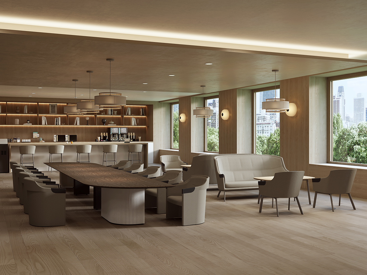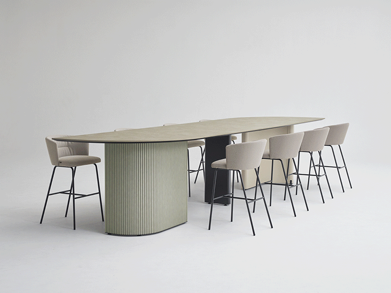 近くを通る人がふと立ち寄りやすいように、テーブルの端はR形状の天板がオーバーハングしています。また、異形テーブルは関係の浅い部門外や社外の人ともテーブルを共用しやすいように、互い違いの座席配置になるようデザインされています。